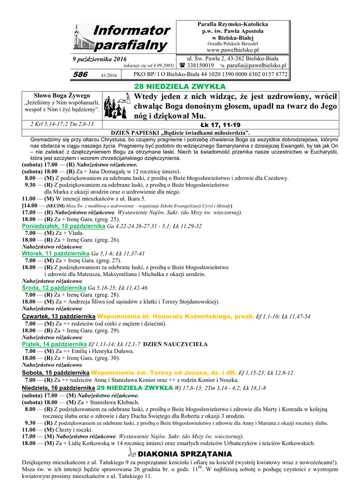 Parafia Rzymsko-Katolicka p.w. św. Pawła Apostoła w Bielsku-Białej Osiedle Polskich Skrzydeł www.pawelbielsko.pl ul. Św. Pawła 2, 43-382 Bielsko-Biała 9 października 2016 (ukazuje się od 4.09.2005) 338150019 [email protected] PKO BP/ I O Bielsko-Biała 44 1020 1390 0000 6302 0157 8772 586 41/2016 28 NIEDZIELA ZWYKŁA Słowo Boga Żywego „Jeżeliśmy z Nim współumarli, wespół z Nim i żyć będziemy”. 2 Krl 5,14-17;2 Tm 2,8-13 Wtedy jeden z nich widząc, że jest uzdrowiony, wrócił chwaląc Boga donośnym głosem, upadł na twarz do Jego nóg i dziękował Mu. Łk 17, 11-19 DZIEŃ PAPIESKI „Bądźcie świadkami miłosierdzia”. Gromadzimy się przy ołtarzu Chrystusa, bo czujemy pragnienie i potrzebę chwalenia Boga za wszystkie dobrodziejstwa, którymi nas obdarza w ciągu naszego życia. Pragniemy być podobni do wdzięcznego Samarytanina z dzisiejszej Ewangelii, by tak jak On – nie zwlekać z dziękczynieniem Bogu za otrzymane łaski. Niech ta świadomość przenika nasze uczestnictwo w Eucharystii, która jest szczytem i wzorem chrześcijańskiego dziękczynienia. (sobota) 17.00 — (R) Nabożeństwo różańcowe. (sobota) 18.00 — (R) Za + Jana Domagałę w 12 rocznicę śmierci. 8.00 — (M) Z podziękowaniem za odebrane łaski, z prośbą o Boże błogosławieństwo i zdrowie dla Czesławy. 9.30 — (R) Z podziękowaniem za odebrane łaski, z prośbą o Boże błogosławieństwo dla Marka z okazji urodzin oraz o uzdrowienie dla niego. 11.00 — (M) W intencji mieszkańców z ul. Ikara 5. [14.00 — (SECiM) Msza Św. z modlitwą o uzdrowienie – organizuje Szkoła Ewangelizacji Cyryl i Metody] 17.00 — (R) Nabożeństwo różańcowe. Wystawienie Najśw. Sakr. (do Mszy św. wieczornej). 18.00 — (R) Za + Irenę Gara. (greg. 25). Poniedziałek, 10 października Ga 4,22-24.26-27.31 - 5,1; Łk 11,29-32 7.00 — (M) Za + Vlada. 18.00 — (R) Za + Irenę Gara. (greg. 26). Nabożeństwo różańcowe. Wtorek, 11 października Ga 5,1-6; Łk 11,37-41 7.00 — (M) Za + Irenę Gara. (greg. 27). 18.00 — (R) Z podziękowaniem za odebrane łaski, z prośbą o Boże błogosławieństwo i zdrowie dla Mateusza, Maksymiliana i Michałka z okazji urodzin. Nabożeństwo różańcowe. Środa, 12 października Ga 5,18-25; Łk 11,42-46 7.00 — (R) Za + Irenę Gara. (greg. 28). 18.00 — (M) Za + Andrzeja Śliwa (od sąsiadów z klatki i Teresy Stojdanowskiej). Nabożeństwo różańcowe. Czwartek, 13 października Wspomnienie bł. Honorata Koźmińskiego, prezb. Ef 1,1-10; Łk 11,47-54 7.00 — (M) Za ++ rodziców (od córki z mężem i dziećmi). 18.00 — (R) Za + Irenę Gara. (greg. 29). Nabożeństwo różańcowe. Piątek, 14 października Ef 1,11-14; Łk 12,1-7 DZIEŃ NAUCZYCIELA 7.00 — (M) Za ++ Emilię i Henryka Duława. 18.00 — (R) Za + Irenę Gara. (greg. 30). Nabożeństwo różańcowe. Sobota, 15 października Wspomnienie św. Teresy od Jezusa, dz. i dK. Ef 1,15-23; Łk 12,8-12 7.00 — (R) Za ++ rodziców Annę i Stanisława Konior oraz ++ z rodzin Konior i Noszka. Niedziela, 16 października 29 NIEDZIELA ZWYKŁA Wj 17,8-13; 2Tm 3,14 - 4,2; Łk 18,1-8 (sobota) 17.00 — (M) Nabożeństwo różańcowe. (sobota) 18.00 — (M) Za + Stanisława Kłobuch. 8.00 — (R) Z podziękowaniem za odebrane łaski, z prośbą o Boże błogosławieństwo i zdrowie dla Marty i Konrada w kolejną rocznicę ślubu oraz o zdrowie i dary Ducha Świętego dla Roberta z okazji 3 urodzin. 9.30 — (R) Z podziękowaniem za odebrane łaski, z prośbą o Boże błogosławieństwo i zdrowie dla Anny i Mariana z okazji rocznicy ślubu. 11.00 — (M) Chrzty i roczki. 17.00 — (M) Nabożeństwo różańcowe. Wystawienie Najśw. Sakr. (do Mszy św. wieczornej). 18.00 — (M) Za + Lidię Kotkowską w 14 rocznicę śmierci oraz zmarłych rodziców Urbańczyków i teściów Kotkowskich. DIAKONIA SPRZĄTANIA Dziękujemy mieszkańcom z ul. Tańskiego 9 za posprzątanie kościoła i ofiarę na kościół (wystrój kwiatowy wraz z nowożeńcami!). Msza św. w ich intencji będzie sprawowana 26 grudnia br. o godz. 1100. W najbliższą sobotę o posługę czystości z wystrojem kwiatowym prosimy mieszkańców z ul. Tańskiego 11. OGŁOSZENIA DUSZPASTERSKIE 1. Dzisiaj przy drzwiach kościoła młodzież kwestuje na Fundację Dzieło Nowego Tysiąclecia. 2. Nabożeństwa różańcowe w naszym kościele: w sobotę i niedzielę o godz. 1700, w pozostałe dni tygodnia po Mszy Św. wieczornej. 3. W czwartek nie ma spotkania dla wspólnego czytania Pisma Św. 4. W piątek od godz. 1700 spotkanie dla kandydatów do bierzmowania (wcześniej okazja do spowiedzi św.). 5. Katecheza przedchrzcielna w piątek po Różańcu! „KLUB MAMY” Już w najbliższą środę o godz. 1000 spotkanie Klubu Mamy. Będzie czas zabaw z dziećmi, ale też zajęcia z myślą o własnym rozwoju jako kobiety. Jest to zarówno okazja do spotkania i rozmowy przy herbatce, ale również garść inspiracji na ten intensywny czas przebywania z dzieckiem. Zapraszamy zarówno mamy z małymi jak i większymi dziećmi jeśli będą miały ochotę, ale też babcie, które opiekują się swoimi wnukami oraz kobiety w ciąży, które dopiero spodziewają się narodzin swoich pociech. Jeśli tylko czujesz potrzebę spotkania w gronie innych kobiet i mam – przyjdź! Więcej informacji pod nr tel. 518 625 378. XV TYDZIEŃ Z EWANGELIĄ „JESTEŚ BOSKI” I. Warsztaty Uwielbienia (Informacje i zapisy: www.warsztatyuwielbienia.pl) termin: 7 – 9 października; miejsce: Dom Kultury „Kubiszówka”, B.B., ul. Słowackiego 17; instruktorzy: Zuzanna Pradela&Pradella. Zakończenie Warsztatów podczas Festynu Rodzinnego V. 16. Dzień Papieski – 9. 10. (niedziela) pod hasłem : „Jan Paweł II – Bądźcie świadkami miłosierdzia” 1. 1230 Eucharystia w katedrze św. Mikołaja w B-B, pod przewodnictwem Ks. Bpa Piotra Gregera 2. na Starym Rynku w B.B. Festyn Rodzinny 1600 – Arka Noego; 1730 – Plantacja = Słowo + Design: Jak odkryć Stwó