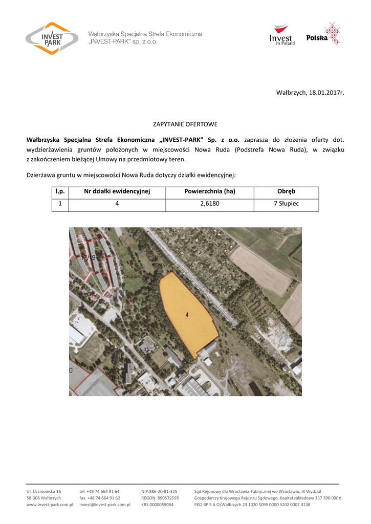 Wałbrzych, 18.01.2017r. ZAPYTANIE OFERTOWE Wałbrzyska Specjalna Strefa Ekonomiczna „INVEST-PARK” Sp. z o.o. zaprasza do złożenia oferty dot. wydzierżawienia gruntów położonych w miejscowości Nowa Ruda (Podstrefa Nowa Ruda), w związku z zakończeniem bieżącej Umowy na przedmiotowy teren. Dzierżawa gruntu w miejscowości Nowa Ruda dotyczy działki ewidencyjnej: l.p. Nr działki ewidencyjnej Powierzchnia (ha) Obręb 1 4 2,6180 7 Słupiec Ul. Uczniowska 16 58-306 Wałbrzych www.invest-park.com.pl tel. +48 74 664 91 64 fax. +48 74 664 91 62 [email protected] NIP:886-20-81-325 REGON: 890572595 KRS:0000059084 Sąd Rejonowy dla Wrocławia-Fabrycznej we Wrocławiu, IX Wydział Gospodarczy Krajowego Rejestru Sądowego, Kapitał zakładowy 357 390 000zł PKO BP S.A O/Wałbrzych 23 1020 5095 0000 5202 0007 4138 Ul. Uczniowska 16 58-306 Wałbrzych www.invest-park.com.pl tel. +48 74 664 91 64 fax. +48 74 664 91 62 [email protected] NIP:886-20-81-325 REGON: 890572595 KRS:0000059084 Sąd Rejonowy dla Wrocławia-Fabrycznej we Wrocławiu, IX Wydział Gospodarczy Krajowego Rejestru Sądowego, Kapitał zakładowy 357 390 000zł PKO BP S.A O/Wałbrzych 23 1020 5095 0000 5202 0007 4138 Informacje o gruncie / Uwagi: Gmina: Miasto Nowa Ruda Jednostka ewid.: 020804_1 – Nowa Ruda – miasto Obręb: 0007 – 7 Słupiec Klasy gruntu: Ba Użytek: Teren przemysłowy Wypełnione i podpisane skany oferty na podstawie zamieszczonego formularza prosimy składać na adres mailowy: [email protected] lub drogą pocztową na adres siedziby Spółki: Wałbrzyska Specjalna Strefa Ekonomiczna „INVEST-PARK” Sp. z o.o. ul. Uczniowska 16 58-306 Wałbrzych Przy wyborze drogi pocztowej ofertę proszę złożyć w zaklejonej kopercie. Oferty prosimy składać w terminie do 3.02.2017 r. Ul. Uczniowska 16 58-306 Wałbrzych www.invest-park.com.pl tel. +48 74 664 91 64 fax. +48 74 664 91 62 [email protected] NIP:886-20-81-325 REGON: 890572595 KRS:0000059084 Sąd Rejonowy dla Wrocławia-Fabrycznej we Wrocławiu, IX Wydział Gospodarczy Krajowego Rejestru Sądowego, Kapitał zakładowy 357 390 000zł PKO BP S.A O/Wałbrzych 23 1020 5095 0000 5202 0007 4138 o wyborze najkorzystniejszej oferty osoby biorące udział w zapytaniu zostaną poinformowani na poniższej stronie internetowej oraz drogą telefoniczną. https://invest-park.com.pl/o-strefie/przetargi-wsse/wyniki-przetargow-2/ Informację będą udzielane dopiero w momencie akceptacji wyboru Oferenta przez Zarząd Oferty złożone po terminie nie będą rozpatrywane Oferent może przed upływem terminu składania ofert zmienić lub wycofać swoją ofertę. W toku badania i oceny ofert Zamawiający może żądać od oferentów wyjaśnień dotyczących treści złożonych oferent. Proces wyboru Oferenta: analiza ofert w dniu (6.02.2017r), zgłoszenie wniosku do Zarządu o wyborze oferenta, akceptacja Zarządu, ogłoszenie na stronie internetowej, rozpoczęcie rozmów z dzierżawcą oraz przygotowanie wzoru Umowy dzierżawy. Kryteria, które zostaną poddane ocenie punktowej to: - proponowana cena za 1 ha - wielkość obecnie posiadanych bądź dzierżawionych terenów przez Oferenta - posiadanie terenów w sąsiedztwie przedmiotowej Podstrefy przez Oferenta - cel pobierania pożytków z dzierżawionego terenu przez Oferenta Maksymalna ilość punktów do zdobycia: 1,95 pkt w tym za kategorię: - proponowana kwota – max. 0,9 pkt - wielkość obecnie posiadanych bądź dzierżawionych terenów – max. 0,45 pkt - posiadanie terenów w sąsiedztwie przedmiotowej Podstrefy – max. 0,45 pkt - cel pobierania pożytków z dzierżawionego terenu przez Oferenta – max. 0,15 pkt W przypadku jakichkolwiek pytań proszę o kontakt: Departament Inwestycji Patryk Muszyński Tel.: +48 74 664 91 66 Kom.: 690-802-201 Ul. Uczniowska 16 58-306 Wałbrzych www.invest-park.com.pl tel. +48 74 664 91 64 fax. +48 74 664 91 62 [email protected] NIP:886-20-81-325 REGON: 890572595 KRS:0000059084 Sąd Rejonowy dla Wrocławia-Fabrycznej we Wrocławiu, IX Wydział Gospodarczy Krajowego Rejestru Sądowego, Kapitał zakładowy 357 390 000zł PKO BP S.A O/Wałbrzych 23 1020 5095 0000 5202 0007 4138
