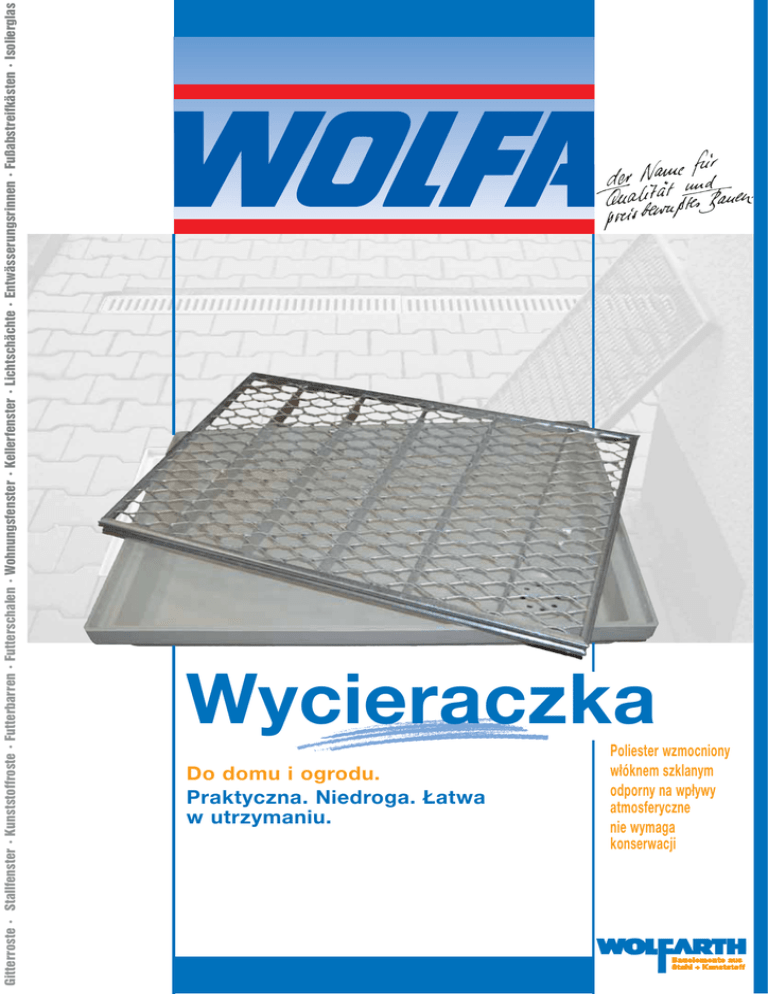 Gitterroste · Stallfenster · Kunststoffroste · Futterbarren · Futterschalen · Wohnungsfenster · Kellerfenster · Lichtschächte · Entwässerungsrinnen · Fußabstreifkästen · Isolierglas Wycieraczka Do domu i ogrodu. Praktyczna. Niedroga. Łatwa w utrzymaniu. Poliester wzmocniony włóknem szklanym odporny na wpływy atmosferyczne nie wymaga konserwacji Gitterroste · Stallfenster · Kunststoffroste · Futterbarren · Futterschalen · Wohnungsfenster · Kellerfenster · Lichtschächte · Entwässerungsrinnen · Fußabstreifkästen · Isolierglas Wycieraczka Jeden system – dużo możliwości Z poliestru wzmocnionego włóknem szklanym, seryjnie z rusztem stalowym ocynkowanym – kratowym 30/30 albo ocynkowanym rusztem siatkowym z rusztem siatkowym ocynkowanym ➨ odporna na uderzenia, stabilna z odpływem o średnicy 70 mm umożli➨ seryjnie wiającym odpływ wody ➨ łatwa w zabudowaniu ➨ możliwość założenia i wymiany różnych rusztów gładka bezporowa powierzchnia zbiornika ➨ ułatwia czyszczenie ➨ całkowicie odporna na wpływy atmosferyczne ➨ korzystna cena z rusztem stalowym kratowym ocynkowanym 30/30 60 / 75 cm z rusztem stalowym kratowym ocynkowanym 30/10 Profil wspierający matę rypsową z tworzywa sztucznego albo matę gumową z gumową matą Produkcja seryjna z odpływem o średnicy 70 mm Dostarczane wymiary w cm : z wysokowartosciową matą rypsową z tworzywa sztucznego do użytku w wewnątrz 60 75 x x 40 50 Friedrich Wolfarth GmbH & Co. KG Bauelemente aus Stahl und Kunststoff Friedrich-Wolfarth-Straße 91 D-97990 Weikersheim-Neubronn Telefon: +49 (0) 79 34 / 91 91-0 Telefax: +49 (0) 79 34 / 91 91-50 Internet: http: //www.wolfa.de e-mail: [email protected]