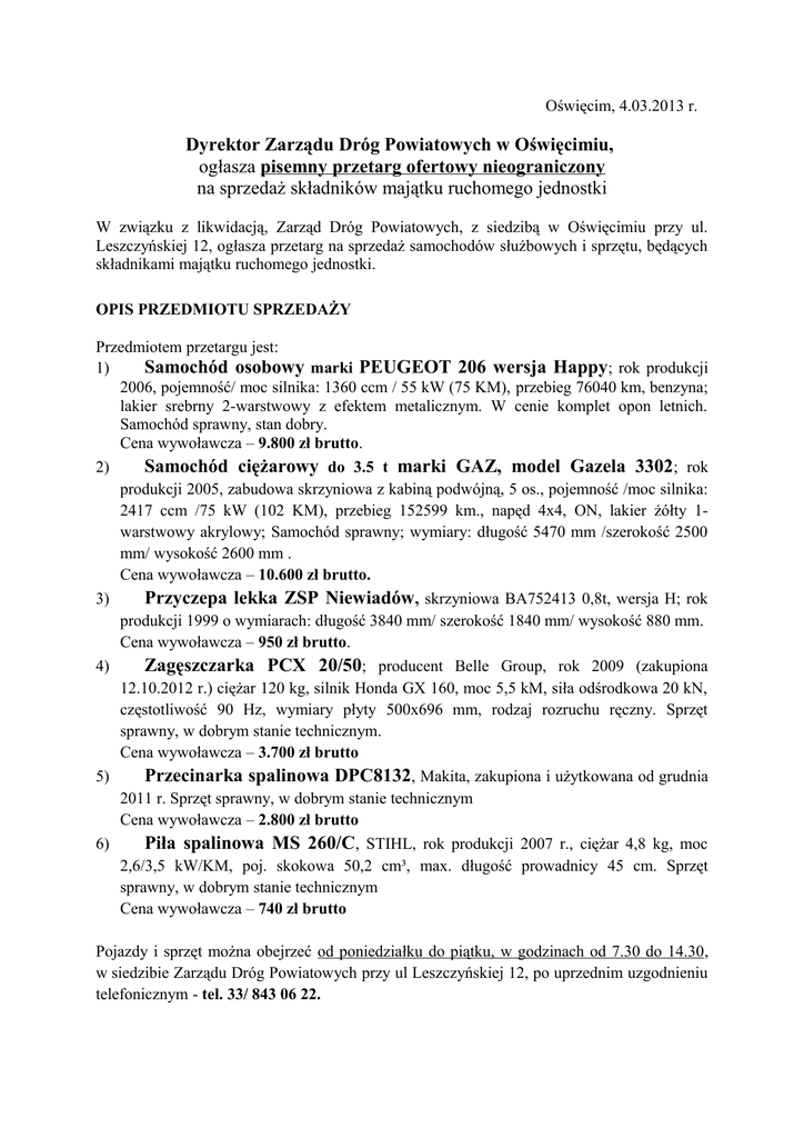 Oświęcim, 4.03.2013 r. Dyrektor Zarządu Dróg Powiatowych w Oświęcimiu, ogłasza pisemny przetarg ofertowy nieograniczony na sprzedaż składników majątku ruchomego jednostki W związku z likwidacją, Zarząd Dróg Powiatowych, z siedzibą w Oświęcimiu przy ul. Leszczyńskiej 12, ogłasza przetarg na sprzedaż samochodów służbowych i sprzętu, będących składnikami majątku ruchomego jednostki. OPIS PRZEDMIOTU SPRZEDAŻY Przedmiotem przetargu jest: 1) Samochód osobowy marki PEUGEOT 206 wersja Happy; rok produkcji 2006, pojemność/ moc silnika: 1360 ccm / 55 kW (75 KM), przebieg 76040 km, benzyna; lakier srebrny 2-warstwowy z efektem metalicznym. W cenie komplet opon letnich. Samochód sprawny, stan dobry. Cena wywoławcza – 9.800 zł brutto. 2) Samochód ciężarowy do 3.5 t marki GAZ, model Gazela 3302; rok produkcji 2005, zabudowa skrzyniowa z kabiną podwójną, 5 os., pojemność /moc silnika: 2417 ccm /75 kW (102 KM), przebieg 152599 km., napęd 4x4, ON, lakier żółty 1warstwowy akrylowy; Samochód sprawny; wymiary: długość 5470 mm /szerokość 2500 mm/ wysokość 2600 mm . Cena wywoławcza – 10.600 zł brutto. 3) Przyczepa lekka ZSP Niewiadów, skrzyniowa BA752413 0,8t, wersja H; rok produkcji 1999 o wymiarach: długość 3840 mm/ szerokość 1840 mm/ wysokość 880 mm. Cena wywoławcza – 950 zł brutto. 4) Zagęszczarka PCX 20/50; producent Belle Group, rok 2009 (zakupiona 12.10.2012 r.) ciężar 120 kg, silnik Honda GX 160, moc 5,5 kM, siła odśrodkowa 20 kN, częstotliwość 90 Hz, wymiary płyty 500x696 mm, rodzaj rozruchu ręczny. Sprzęt sprawny, w dobrym stanie technicznym. Cena wywoławcza – 3.700 zł brutto 5) Przecinarka spalinowa DPC8132, Makita, zakupiona i użytkowana od grudnia 2011 r. Sprzęt sprawny, w dobrym stanie technicznym Cena wywoławcza – 2.800 zł brutto 6) Piła spalinowa MS 260/C, STIHL, rok produkcji 2007 r., ciężar 4,8 kg, moc 2,6/3,5 kW/KM, poj. skokowa 50,2 cm³, max. długość prowadnicy 45 cm. Sprzęt sprawny, w dobrym stanie technicznym Cena wywoławcza – 740 zł brutto Pojazdy i sprzęt można obejrzeć od poniedziałku do piątku, w godzinach od 7.30 do 14.30, w siedzibie Zarządu Dróg Powiatowych przy ul Leszczyńskiej 12, po uprzednim uzgodnieniu telefonicznym - tel. 33/ 843 06 22. WARUNKIEM UCZESTNICTWA W PRZETARGU JEST: 1. Złożenie oferty, w terminie do dnia 15.03.2013 r. do godz. 12:00 w sekretariacie Zarządu Dróg Powiatowych, ul. Leszczyńskiej 12, 32-600 Oświęcim bądź przesłanie faxem (nr fax. 33 843 35 93). Oferty złożone po tej dacie i godzinie nie będą rozpatrywane. Składając ofertę, można skorzystać ze wzoru formularza ofertowego, będącego załącznikiem do niniejszego ogłoszenia. Formularz jest również dostępny w sekretariacie jednostki oraz na stronie internetowej: bip.powiat.oswiecim.pl - w zakładce Ogłoszenia i zamówienia publiczne jednostek organizacyjnych powiatu. Oferta powinna zawierać: o imię i nazwisko lub nazwę oferenta, o adres / siedzibę oferenta, o numer telefonu kontaktowego, o numer PESEL, NIP oferenta oraz w przypadku firm nr REGON, o datę sporządzenia oferty, o oferowaną cenę brutto (cyframi i słownie), o oświadczenie oferenta, że zapoznał się z warunkami przetargu, stanem przedmiotu sprzedaży i nie wnosi zastrzeżeń, o potwierdzenie wpłaty wadium. Każdy oferent może złożyć tylko jedną ofertę na dany przedmiot sprzedaży. Sprzedający nie dopuszcza składania ofert wariantowych. Oferty należy składać w zaklejonych kopertach z napisem: „Przetarg – maszyny/ pojazdy”. 2. Wpłacenie wadium w wysokości 10 % ceny wywoławczej na konto w ABS Bank Spółdzielczy Odział w Oświęcimiu nr 60 8110 1023 2003 0312 0229 0007. POZOSTAŁE INFORMACJE: 1. Otwarcie ofert nastąpi w dniu 15.03.2013 r. w siedzibie Zarządu Dróg Powiatowych. Czas związania ofertą: od dnia złożenia oferty do dnia 20.03.2013 r. włącznie. 2. Sprzęty zostaną sprzedane za najwyższą zaoferowaną cenę. Odbiór nastąpi po wpłacie (do dnia 20.03.2013 r.) ofertowej kwoty pomniejszonej o wpłacone wadium. 3. Wpłacone wadium będzie zaliczone na poczet sprzedaży sprzętu dla osoby, która wygra przetarg. Jeżeli ta osoba nie zgłosi się w ustalonym przez Sprzedającego terminie, wpłacone wadium ulegnie przepadkowi. Wadium wpłacone przez oferentów, których oferty nie zostaną przyjęte zostanie zwrócone niezwłocznie po dokonaniu wyboru oferty. 4. W przypadku zaoferowania takiej samej ceny przez więcej niż jednego oferenta na dany pojazd lub sprzęt, zostanie dodatkowo przeprowadzona licytacja ustna. O terminie licytacji zostaną zawiadomieni ww. oferenci. 5. Zarząd Dróg Powiatowych w Oświęcimiu nie bierze odpowiedzialności za stan techniczny sprzedawanych pojazdów i sprzętu. 6. Oferty cenowe poniżej ceny wywoławczej nie będą rozpatrywane. 7. Wszelkie informacje na temat sprzedaży można uzyskać w Zarządzie Dróg Powiatowych w Oświęcimiu, ul. Leszczyńska 12; tel./fax 33 843 06 22; 33 843 35 93 Organizator przetargu zastrzega się, że przysługuje mu prawo zamknięcia przetargu bez wybrania którejkolwiek z ofert, bez podania przyczyn. Dyrektor Zarządu Dróg Powiatowych w Oświęcimiu