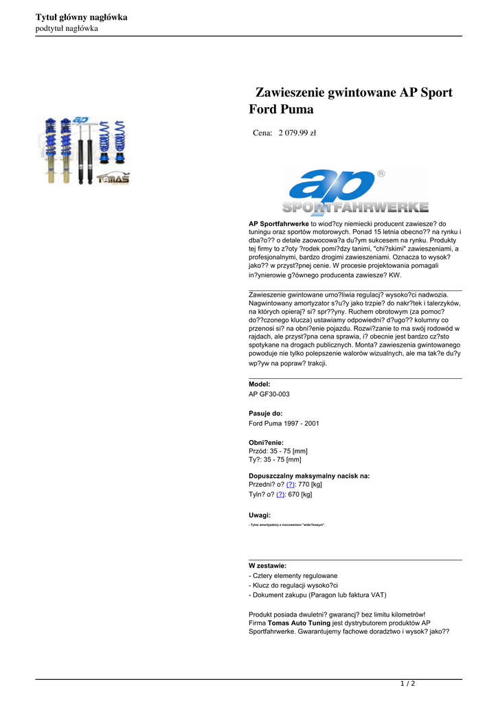Tytuł główny nagłówka podtytuł nagłówka Zawieszenie gwintowane AP Sport Ford Puma Cena: 2 079.99 zł AP Sportfahrwerke to wiod?cy niemiecki producent zawiesze? do tuningu oraz sportów motorowych. Ponad 15 letnia obecno?? na rynku i dba?o?? o detale zaowocowa?a du?ym sukcesem na rynku. Produkty tej firmy to z?oty ?rodek pomi?dzy tanimi, "chi?skimi" zawieszeniami, a profesjonalnymi, bardzo drogimi zawieszeniami. Oznacza to wysok? jako?? w przyst?pnej cenie. W procesie projektowania pomagali in?ynierowie g?ównego producenta zawiesze? KW. Zawieszenie gwintowane umo?liwia regulacj? wysoko?ci nadwozia. Nagwintowany amortyzator s?u?y jako trzpie? do nakr?tek i talerzyków, na których opieraj? si? spr??yny. Ruchem obrotowym (za pomoc? do??czonego klucza) ustawiamy odpowiedni? d?ugo?? kolumny co przenosi si? na obni?enie pojazdu. Rozwi?zanie to ma swój rodowód w rajdach, ale przyst?pna cena sprawia, i? obecnie jest bardzo cz?sto spotykane na drogach publicznych. Monta? zawieszenia gwintowanego powoduje nie tylko polepszenie walorów wizualnych, ale ma tak?e du?y wp?yw na popraw? trakcji. Model: AP GF30-003 Pasuje do: Ford Puma 1997 - 2001 Obni?enie: Przód: 35 - 75 [mm] Ty?: 35 - 75 [mm] Dopuszczalny maksymalny nacisk na: Przedni? o? (?): 770 [kg] Tyln? o? (?): 670 [kg] Uwagi: - Tylne amortyzatory z mocowaniem "wide?kowym". W zestawie: - Cztery elementy regulowane - Klucz do regulacji wysoko?ci - Dokument zakupu (Paragon lub faktura VAT) Produkt posiada dwuletni? gwarancj? bez limitu kilometrów! Firma Tomas Auto Tuning jest dystrybutorem produktów AP Sportfahrwerke. Gwarantujemy fachowe doradztwo i wysok? jako?? 1/2 Tytuł główny nagłówka podtytuł nagłówka obs?ugi klienta. Wyrób zosta? wyprodukowany przez przedsi?biorstwo posiadaj?ce odpowiednie certyfikaty oraz wymagane normy zosta?y zachowane. Zdj?cia pogl?dowe: Budowa przyk?adowego zawieszenia gwintowanego: 30-60 2/2 Powered by TCPDF (www.tcpdf.org)