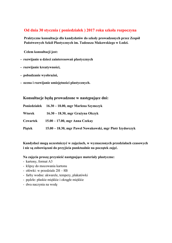 Od dnia 30 stycznia ( poniedziałek ) 2017 roku szkoła rozpoczyna Praktyczne konsultacje dla kandydatów do szkoły prowadzonych przez Zespół Państwowych Szkół Plastycznych im. Tadeusza Makowskiego w Łodzi. Celem konsultacji jest: - rozwijanie u dzieci zainteresowań plastycznych - rozwijanie kreatywności, - pobudzanie wyobraźni, - ocena i rozwijanie umiejętności plastycznych. Konsultacje będą prowadzone w następujące dni: Poniedziałek 16.30 – 18.00, mgr Marlena Szymczyk Wtorek 16.30 – 18.30, mgr Grażyna Olczyk Czwartek 15.00 – 17.00, mgr Anna Czekay Piątek 15.00 – 18.30, mgr Paweł Nowakowski, mgr Piotr Izydorczyk Kandydaci mogą uczestniczyć w zajęciach, w wyznaczonych przedziałach czasowych i nie są zobowiązani do przyjścia punktualnie na początek zajęć. Na zajęcia proszę przynieść następujące materiały plastyczne: - kartony, format A3 - klipsy do mocowania kartonu - ołówki: w przedziale 2H – 8B - farby wodne: akwarele, tempery, plakatówki - pędzle: płaskie miękkie i okrągłe miękkie - dwa naczynia na wodę