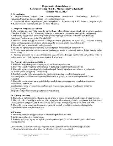 Regulamin obozu letniego 4. Krakowskiej FSE bł. Matki Teresy z Kalkuty Sielpia Mała 2013 I. Organizator. 1. Organizatorem obozu jest Stowarzyszenie Harcerstwa Katolickiego „Zawisza” Federacja Skautingu Europejskiego – 2. Hufiec Krakowski. 2. Przedstawicielem organizatora jest drużynowa 4. Krakowskiej FSE, Izabela Grzywa wędr. 3. Kierownikiem wypoczynku jest ks. Piotr Modelski. II. Program i organizacja obozu. 1. Ze względu na specyfikę metody harcerskiej FSE podczas zajęć, takich jak wyprawa zastępu (Eksplo), Wielka Gra itp., uczestnicy działają w zastępach, pozostając pod opieką zastępowej. 2. Od strony higieniczno-sanitarnej obóz spełnia wymogi określone w Instrukcji Głównego Inspektora Sanitarnego z dnia 22 maja 2008. 3. Harcerki same budują obozowiska zastępów (także platformy na wysokości). Podczas budowy obozu posługują się narzędziami, takimi jak piła, siekiera, dłuto, nóż, młotek itp. 4. Harcerki śpią w namiotach, na karimatach. 5. Posiłki na ogniu przygotowywane są w zastępach przez samych uczestników. 6. W celu zapewnienia bezpieczeństwa drużynowa może wyznaczyć zastęp, który będzie pełnił nocną wartę. 7. Rodzice proszeni są o nieodwiedzanie uczestników. Istnieje możliwość odwiedzin tylko w jednym dniu specjalnie wyznaczonym przez drużynową. III. Prawa i obowiązki uczestników. 1. Harcerki mogą korzystać ze sprzętu, jakim dysponuje drużyna. 2. Harcerki są zobowiązane uczestniczyć w pełnym programie realizacji obozu. 3. Harcerki wyznaczone do pełnienia określonych funkcji są odpowiedzialne za wywiązanie się z nich przed zastępową i drużynową. 4. Każda harcerka zobowiązana jest do zachowania postawy godnej harcerki oraz przestrzegania zasad harcerskiego współdziałania w grupie, w tym w szczególności Prawa Harcerki. 5. Harcerki zobowiązane są również do bezwzględnego przestrzegania wszelkich zarządzeń drużynowej, a także do: a) zabrania ze sobą wyposażenia osobistego i zespołowego zgodnie z wykazem podanym przez drużynową, b) opieki nad powierzonym sprzętem i ekwipunkiem. IV. Zakazy i nakazy. 1. Harcerkom zabrania się oddalania się od grupy w czasie trwania obozu bez zgody drużynowej. 2. Harcerki nie zabierają ze sobą na obóz sprzętów elektronicznych oraz telefonów komórkowych (za wyjątkiem zastępowych). Kontaktować należy się z drużynową pod nr tel. 600-823-768. 3. Harcerki zobowiązane są do przestrzegania na trasach wszelkich zarządzeń i przepisów odpowiednich instytucji terenowych. V. Finanse 1. Drużynowa może podjąć decyzję o obniżeniu płatności za obóz. 2. Zaliczka za obóz jest bezzwrotna. 3. Rodzice wyrażają zgodę na wykorzystanie pozostałych po obozie funduszy na działalność roczną drużyny. Oświadczam, że zapoznałem się z regulaminem i zgadzam się na udział mojego dziecka w obozie letnim Sielpia Mała 2013 na określonych wyżej warunkach. ………………………………....... (data i podpis Rodzica) …. …………………………………. (podpis kierownika obozu)