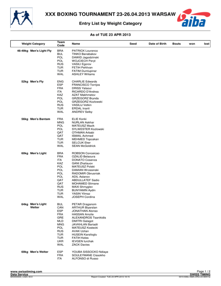 XXX BOXING TOURNAMENT 23-26.04.2013 WARSAW Entry List by Weight Category As of TUE 23 APR 2013 Team Code Name BRA BUL POL POL RUS TUR TUR WAL PATRICK Lourenco TINKO Banabakov DAWID Jagodziinski WOJCIECH Peryt VASILI Egorov FETIH Pehlivan FATIM Dumlupinar ASHLEY Wiliams 52kg Men's Fly ENG ESP FRA ITA KAZ POL POL RUS TUR WAL CHARLIE Edwards FRANCISCO Torrijos DRISS Yalaoui RICARDO D'Andrea AZAT Makhmetov GRZEGORZ Brynda GRZEGORZ Kozlowski VASILIJ Vetkin ERDAL Inanli ANDREV Selby 56kg Men's Bantam FRA MNG POL POL QAT QAT TUR TUR WAL ELIE Konki NURLAN Askhar MATEUSZ Mazik SYLWESTER Kozlowski OTHMAN Arbabi ISMAIL Achmed MEHMED Topcakan SELCUK Eker SEAN McGoldrick 60kg Men's Light BRA FRA ITA KAZ POL POL POL POL QAT QAT RUS TUR TUR WAL ROBSON Conceicao OZALID Belaoura DONATO Cosenza GANI Zhailauov MATEUSZ Polski DAMIAN Wrzesinski RADOMIR Obrusniak ADIL Aslanov ABDULLATEF Sadio MOHAMED Slimane MAXI Shmyglev BUNYAMIN Aydin YASIN Yilmaz JOSEPH Cordina 64kg Men's Light Welter BUL CAN ESP FRA GRE MLD MNG POL RUS TUR TUR UKR WAL PETAR Draganom ARTHUR Biyarslan JONATHAN Alonso HASSAN Amzile ALEXANDROS Tsanikidis DMITRI Galagot JAVKHLAN Bariadii MATEUSZ Kostecki AVAK Uzlian HUSEIN Karsiloglu FATIH Keles IEVGEN Iurchak ZACK Davies 69kg Men's Welter ESP FRA ITA YOUBA SISSOCKO Ndiaye SOULEYMANE Cissokho ALFONSO di Russo Weight Category 46-49kg Men's Light Fly Seed Bouts won lost Page 1 / 2 SWISS TIMING www.swisstiming.com Data Service BX0000000_C32C 40.0 Date of Birth Report Created TUE 23 APR 2013 18:15 0010-836c-AIBA.ORG-23-86f01te XXX BOXING TOURNAMENT 23-26.04.2013 WARSAW Entry List by Weight Category As of TUE 23 APR 2013 Team Code Name 69kg Men's Welter KAZ MLD POL POL POL TUR TUR UKR MEIIRIM Nursultanov VASILII Belous PIOTR Sielawa ROMAN Szymanski TOMASZ Kot ABDULKADIR Koroglu ONUR Sipal SERGII Bykov 75kg Men's Middle AUS CAN ENG FRA ITA POL POL POL POL QAT RUS TUR TUR UKR MARK Lucas BRODY Blair ANTONY Fowler ARACHID Hamani RAFAELE Munno KAMIL Gardzielik ADRIAN Plichta IRENEUSZ Zakrzewski TOMASZ Jablonski HZAM Nabah MAXI Timofeev MEHMET BASAR Basak EROL Ozkal ANDRII Bykov 81kg Men's Light Heavy AUS ENG ESP FRA ITA KAZ MLD POL POL POL QAT RUS TUR TUR DYLAN Hardy LAWRENCE JOHN Osueke JONATAN Saavedra ABDEKADEZ Bouhenia GIANLUCA Roscinglione ALMAT Serimov VICTOR Cotiujanschii MAREK Matyja JORDAN Kulinski PIOTR Gredke AMIR Elsaey PAVEL Silyagin BURAK Aksin AVNI Yildirim 91kg Men's Heavy AUS BRA BUL GRE KAZ TUR JAI Opetaia JUAN Nogueira NIKOLAY Mutavski FOTOS Arapoglou ALEKSEY Sevastianov SEYDA Keser +91kg Men's Super Heavy BRA ENG GER KAZ MLD POL TUR TUR JHONNY Pereira FRAZER Clarke FLORIAN Schulz OLZHAS Bukayev ALEXEI Zavatin SERGEI Verveiko ALI EREN Demirezen YUSUF Acik Weight Category Seed Bouts won lost Page 2 / 2 SWISS TIMING www.swisstiming.com Data Service BX0000000_C32C 40.0 Date of Birth Report Created TUE 23 APR 2013 18:15 0010-836c-AIBA.ORG-23-86f01te
