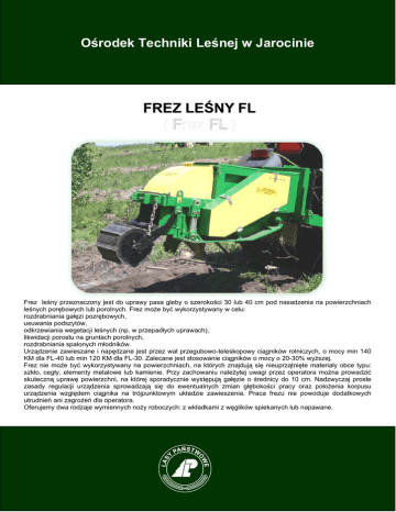Ośrodek wJarocinie Jarocinie OśrodekTechniki Techniki Leśnej Leśnej w FREZ LEŚNY FL Frez leśny przeznaczony jest do uprawy pasa gleby o szerokości 30 lub 40 cm pod nasadzenia na powierzchniach leśnych porębowych lub porolnych. Frez może być wykorzystywany w celu: rozdrabniania gałęzi pozrębowych, usuwania podszytów, odkrzewiania wegetacji leśnych (np. w przepadłych uprawach), likwidacji porostu na gruntach porolnych, rozdrabniania spalonych młodników. Urządzenie zawieszane i napędzane jest przez wał przegubowo-teleskopowy ciągników rolniczych, o mocy min 140 KM dla FL-40 lub min 120 KM dla FL-30. Zalecane jest stosowanie ciągników o mocy o 20-30% wyższej. Frez nie może być wykorzystywany na powierzchniach, na których znajdują się nieuprzątnięte materiały obce typu: szkło, cegły, elementy metalowe lub kamienie. Przy zachowaniu należytej uwagi przez operatora można prowadzić skuteczną uprawę powierzchni, na której sporadycznie występują gałęzie o średnicy do 10 cm. Nadzwyczaj proste zasady regulacji urządzenia sprowadzają się do ewentualnych zmian głębokości pracy oraz położenia korpusu urządzenia względem ciągnika na trójpunktowym układzie zawieszenia. Praca frezu nie powoduje dodatkowych utrudnień ani zagrożeń dla operatora. Oferujemy dwa rodzaje wymiennych noży roboczych: z wkładkami z węglików spiekanych lub napawane. Ośrodek Techniki Leśnej Ośrodek Techniki Leśnej, ul.Przemysłowa 2 D, 63-200 Jarocin tel.: +48 62Techniki 747-35-82, fax:, +48 62 747-29-33,2 e-mail: [email protected] Ośrodek Leśnej ul. Przemysłowa D, 63-200 Jarocin Ośrodek Techniki Leśnej, ul.Przemysłowa 2 D, 63-200 Jarocin tel.: +48 62 747-35-82, fax: +48 62 747-29-33, e-mail: [email protected] www.otljarocin.lasy.gov.pl tel.: +48 62 747-35-82, fax: +48 62 747-29-33, e-mail: [email protected] Ośrodek Techniki Leśnej w Jarocinie PARAMETRY TECHNICZNE Parametry Długość w pozycji transportowej / roboczej Szerokość Wysokość Masa Obsługa Moc ciągnika min. Obroty WOM Liczba noży na wale roboczym Rodzaje noży Średnica wału Obroty wału Szerokość robocza Głębokość pracy max. Całkowite przełożenie przekładni Wydajność FL-30 FL-40 2230/2390 mm 985 mm 1160 mm 1040 kg 1100 kg 1 operator 120 KM 140 KM 1000 obr./min 18 szt. z węglikami spiekanymi; napawane max. 932 mm 654 obr./min 300 mm 400 mm ok. 320 mm 1:1,53 do 0.8 ha / 8 godzin Ośrodek Techniki Leśnej Ośrodek Techniki Leśnej, ul.Przemysłowa 2 D, 63-200 Jarocin tel.: +48 62Techniki 747-35-82, fax:, +48 62 747-29-33,2 e-mail: [email protected] Ośrodek Leśnej ul. Przemysłowa D, 63-200 Jarocin Ośrodek Techniki Leśnej, ul.Przemysłowa 2 D, 63-200 Jarocin tel.: +48 62 747-35-82, fax: +48 62 747-29-33, e-mail: [email protected] www.otljarocin.lasy.gov.pl tel.: +48 62 747-35-82, fax: +48 62 747-29-33, e-mail: [email protected]