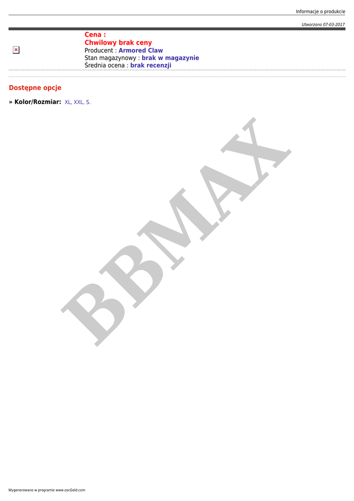 Informacje o produkcie Utworzono 07-03-2017 Cena : Chwilowy brak ceny Producent : Armored Claw Stan magazynowy : brak w magazynie Średnia ocena : brak recenzji Dostępne opcje B B M AX » Kolor/Rozmiar: XL, XXL, S. Wygenerowano w programie www.oscGold.com