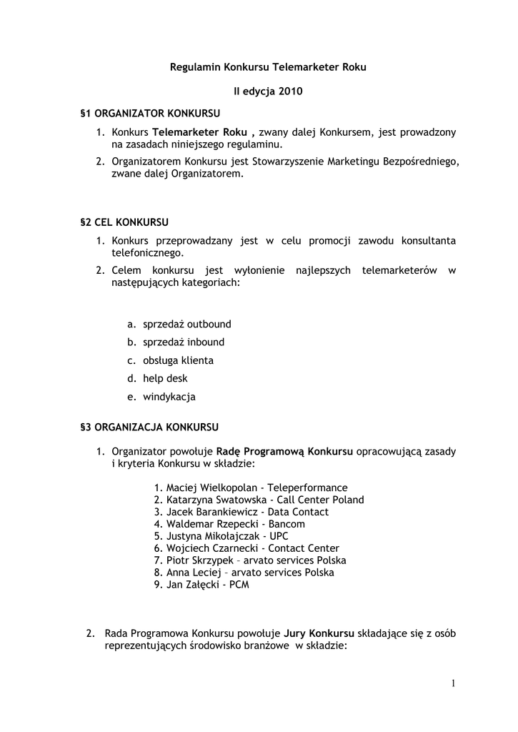 Regulamin Konkursu Telemarketer Roku II edycja 2010 §1 ORGANIZATOR KONKURSU 1. Konkurs Telemarketer Roku , zwany dalej Konkursem, jest prowadzony na zasadach niniejszego regulaminu. 2. Organizatorem Konkursu jest Stowarzyszenie Marketingu Bezpośredniego, zwane dalej Organizatorem. §2 CEL KONKURSU 1. Konkurs przeprowadzany jest w celu promocji zawodu konsultanta telefonicznego. 2. Celem konkursu jest wyłonienie następujących kategoriach: najlepszych telemarketerów w a. sprzedaż outbound b. sprzedaż inbound c. obsługa klienta d. help desk e. windykacja §3 ORGANIZACJA KONKURSU 1. Organizator powołuje Radę Programową Konkursu opracowującą zasady i kryteria Konkursu w składzie: 1. Maciej Wielkopolan - Teleperformance 2. Katarzyna Swatowska - Call Center Poland 3. Jacek Barankiewicz - Data Contact 4. Waldemar Rzepecki - Bancom 5. Justyna Mikołajczak - UPC 6. Wojciech Czarnecki - Contact Center 7. Piotr Skrzypek – arvato services Polska 8. Anna Leciej – arvato services Polska 9. Jan Załęcki - PCM 2. Rada Programowa Konkursu powołuje Jury Konkursu składające się z osób reprezentujących środowisko branżowe w składzie: 1 1/ 2/ 3/ 4/ 5/ 6/ 7/ Honorata Lemiesz - Data Contact (Przewodnicząca) Marta Mańdzij – arvato Andrzej Pichola - Polkomtel Aleksandra Putek - PCM Rafał Brożyna - ContactPoint Elżbieta Gierczak - Bancom Katarzyna Pietroń - Teleperformance 3. Jury dokona oceny zgłoszeń w dwóch etapach: 3.1 I etap - ocena nadesłanych zgłoszeń nagrań rozmów w poszczególnych kategoriach na podstawie arkuszy ocen opracowanych przez jury konkursu 3.2 II etap (jednodniowy), który odbędzie się w Warszawie w tygodniu 23 (7-11 czerwca 2010) - składający się z: a) rozmów symulacyjnych z kandydatami wybranymi po I etapie, b) rozmów indywidualnych z kandydatami 4. Uczestnicy Konkursu, których zgłoszenia zostały zakwalifikowane przez Jury po pierwszym etapie (maksymalnie po 5 osób w każdej kategorii) otrzymają tytuł "Nominowany w Konkursie Telemarketer Roku" II edycja 2010. Wyniki I etapu i termin II etapu zostaną ogłoszone przez Jury w dniu 26 maja 2010r. na stronie internetowej Organizatora - www. smb.pl 5. Po zakończeniu II etapu Jury w czasie wspólnych obrad wyłoni maksymalnie po trzech Laureatów w poszczególnych kategoriach. Sposród Laureatów Jury wybierze Zwycięzców poszczególnych Kategorii. Zwycięzcy otrzymają tytuł "Zwycięzca w Konkursie „Telemarketer Roku – II edycja 2010” wraz ze statuetką będącą potwierdzeniem zwycięstwa w danej kategorii 6. Jury zastrzega sobie prawo do nie przyznania tytułu Telemarketer Roku w poszczególnych lub wszystkich kategoriach. 7. Jury oceniać będzie zgłoszenia, według kryteriów opisanych w załączniku nr 1 do niniejszego Regulaminu. 8. Decyzja Jury jest ostateczna. §4 ZGŁOSZENIE DO KONKURSU 1. Zgłaszającymi do Konkursu mogą być podmioty gospodarcze, które prowadziły działania telemarketingowe i posiadają nagrania rozmów telefonicznych z takich działań, zarejestrowanych w okresie od 1 2 kwietnia 2009 do 31 marca 2010. Podmioty te zgłaszają konsultanta telefonicznego, który jest związany z podmiotem dowolną formą współpracy, przy czym muszą być spełnione następujące wymagania regulaminu: a. nagrania rozmów telefonicznych nagrane są w formacie „wav”, b. uczestnik musi zgłosić 3 rozmowy telefonicznego w jednej kategorii, jednego konsultanta c. nagrania nie mogą zawierać danych osobowych, d. Zgłaszający gwarantuje poprawność merytoryczną wysyłanych nagrań, e. staż współpracy konsultanta nie może być krótszy niż 6 miesięcy w zgłaszającej go firmie. 2. Chcąc wziąć udział w Konkursie, Zgłaszający są zobowiązani: a. pobrać pliki "Formularz zgłoszeniowy", ze strony internetowej znajdującej się pod adresem www.smb.pl, b. nadesłać prawidłowo przygotowane zgłoszenie na adres mailowy Organizatora - [email protected], do dnia 30 kwietnia 2010; c. nadesłać na adres mailowy Organizatora - [email protected] list przewodni, zestawienie kandydatów oraz 3 nagrania rozmów (3 nagrania każdego kandydata) (nazwa pliku wav: imię.nazwisko.kategoria.nr_rozmowy) do dnia 30 kwietnia 2010r. d. nagrania powinny zostać przesłane w zabezpieczony sposób (klucz pgp lub plik zip zabezpieczony hasłem) e. dokonać opłaty za udział w Konkursie na konto Organizatora: Stowarzyszenie Marketingu Bezpośredniego, ul. Wybieg 21, 00-788 Warszawa, Millennium Bank nr konta 89 1160 2202 0000 0000 8618 2926 Tytuł przelewu: telemarketer roku 2010_nazwa firmy w terminie nie późniejszym niż 30 kwietnia 2010. 3. Nadesłane nagrania rozmów zostaną wykorzystane jedynie do celów Konkursowych. 4. Ustala się następujące stawki opłaty za udział w Konkursie: 99 zł (dziewięćdziesiąt dziewięć złotych) + 22% VAT za każdego zgłoszonego kandydata 3 5. Niewypełnienie przez Zgłoszeniodawcę któregokolwiek z warunków opisanych w niniejszym paragrafie, a w szczególności brak opłaty za zgłoszenie, błędne wypełnienie formularza lub nadesłanie zgłoszenia po upływie terminu spowoduje dyskwalifikację zgłoszenia. Dyskwalifikacja prac następuje również przy zgłoszeniu pracy do złej kategorii. §5 OGŁOSZENIE WYNIKÓW KONKURSU 1. Ogłoszenie listy Laureatów Konkursu nastąpi 18 czerwca 2010 roku na stronie www.smb.pl 2. Ogłoszenie Zwycięzców w Konkursie Telemarketer Roku i rozdanie nagród nastąpi w Warszawie podczas Gali Golden Arrow 25 czerwca 2010r. 3. Organizator zastrzega sobie prawo opublikowania wyników Konkursu w środkach masowego przekazu, a w szczególności w prasie, radiu lub telewizji oraz w sieci Internet. §6 ODPOWIEDZIALNOŚĆ 1. Zgłaszający ponosi wszelką odpowiedzialność za przesłane do Konkursu materiały. 2. Wszelka odpowiedzialność za prawdziwość oraz rzetelność informacji lub danych zawartych w zgłoszeniu, a także za naruszenie powszechnie obowiązujących przepisów prawa lub praw osób trze