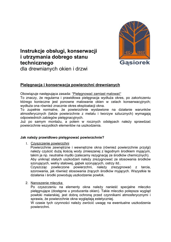 Instrukcje obsługi, konserwacji i utrzymania dobrego stanu technicznego dla drewnianych okien i drzwi Pielęgnacja i konserwacja powierzchni drewnianych Obowiązuje następująca zasada: “Pielęgnować zamiast malować“ To znaczy, że regularna i prawidłowa pielęgnacja wydłuża okres, po zakończeniu którego konieczne jest ponowne malowanie okien w celach konserwacyjnych; wydłuża ona również znacznie okres eksploatacji okna. To zupełnie normalne, że powierzchnie wystawione na działanie warunków atmosferycznych (także powierzchnie z metalu i tworzyw sztucznych) wymagają odpowiednich zabiegów pielęgnacyjnych. Już po samym montażu, a potem w rocznych odstępach należy sprawdzać powierzchnie wszystkich elementów na uszkodzenia. Jak należy prawidłowo pielęgnować powierzchnie? 1. Czyszczenie powierzchni Powierzchnie zewnętrzne i wewnętrzne okna (również powierzchnie przylgi) należy czyścić dużą ilością wody zmieszanej z łagodnym środkiem myjącym, takim ja np. neutralne mydło (zalecamy rezygnację ze środków chemicznych). Aby uniknąć stałych uszkodzeń należy zrezygnować ze stosowania środków szorujących, wełny stalowej, gąbek szorujących, ostrzy itd.. Czyszcząc powleczone powierzchni, należy zrezygnować z tarcia, szorowania, jak również stosowania żrących środków myjących. Wszystkie te działania i środki powodują uszkodzenie powłok. 2. Nanoszenie mleczka Po czyszczeniu na elementy okna należy nanieść specjalne mleczko pielęgnujące (dostępne u producenta okien). Takie mleczko polepsza wygląd powłoki malarskiej, jest dobrą ochroną przed czynnikami atmosferycznymi i sprawia, że powierzchnie okna wyglądają estetyczniej. W czasie tych czynności należy zwrócić uwagę na ewentualne uszkodzenia powierzchni. Instrukcje obsługi, konserwacji i utrzymania dobrego stanu technicznego dla drewnianych okien i drzwi Wskazówki dot. prawidłowej pielęgnacji powierzchni: • Jasne powłoki malarskie wymagają częstszych czynności pielęgnacyjnych • Uszkodzenia powierzchni należy jak najszybciej usunąć. • Co 3 miesiące przeprowadzać kontrolę powierzchni na uszkodzenia. • Miejsca podlegające większemu zużyciu – np. dolny skos krawędzi skrzydeł lub miejsca z drewna o przekroju czołowym należy pielęgnować o czyścić częściej. • Stosować wyłącznie farby i środki pielęgnacyjne o wysokiej jakości Jak należy prawidłowo konserwować powierzchnie? • Stwierdzone wady powłoki malarskiej natychmiast usunąć i poprawić (ważne!), bo wad tych później nie będzie można albo w ogóle usunąć, albo ich usunięcie związane będzie z dużym nakładem pracy i kosztów. • W wymaganych odstępach czasu powierzchnie należy oczyścić na zewnątrz i wewnątrz, lekko oszlifować i pokryć tylko raz warstwą lakieru, który zastosował również producent okna. U producenta okien można się dowiedzieć , jaki typ lakieru został zastosowany. • Ogólne zalecenia dot. pielęgnacji i konserwacji okien podają następujące okresy czasu: • Silne działanie czynników atmosferycznych (strona wystawiona na ich działanie) co 2 do 3 lat Dla jasnych odcieni farb i normalnego oddziaływania czynników atmosferycznych co 2 do 3 lat Dla średnich odcieni farb i normalnego oddziaływania czynników atmosferycznych co 4 do 10 lat Dla kryjących odcieni farb i normalnego oddziaływania czynników atmosferycznych co 5 do 15 lat Uszkodzenia należy usuwać natychmiast. W ten sposób można uniknąć uszkodzeń drewna spowodowanych wnikającą wodą.