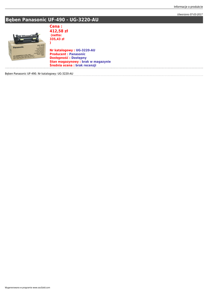 Informacje o produkcie Utworzono 07-03-2017 Bęben Panasonic UF-490 - UG-3220-AU Cena : 412,58 zł (netto: 335,43 zł ) Nr katalogowy : UG-3220-AU Producent : Panasonic Dostępność : Dostępny Stan magazynowy : brak w magazynie Średnia ocena : brak recenzji Bęben Panasonic UF-490. Nr katalogowy: UG-3220-AU Wygenerowano w programie www.oscGold.com