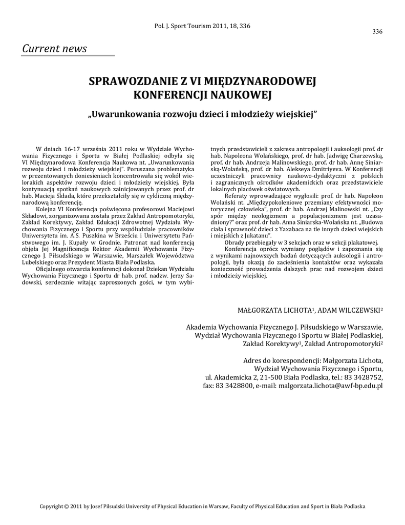 Pol. J. Sport Tourism 2011, 18, 336 SPRAWOZDANIE Z VI MIĘDZYNARODOWEJ KONFERENCJI... Pol. J. Sport Tourism 2011, 18, 327 336 Current news SPRAWOZDANIE Z VI MIĘDZYNARODOWEJ KONFERENCJI NAUKOWEJ „Uwarunkowania rozwoju dzieci i młodzieży wiejskiej” W dniach 16-17 września 2011 roku w Wydziale Wychowania Fizycznego i Sportu w Białej Podlaskiej odbyła się VI Międzynarodowa Konferencja Naukowa nt. „Uwarunkowania rozwoju dzieci i młodzieży wiejskiej”. Poruszana problematyka w prezentowanych doniesieniach koncentrowała się wokół wielorakich aspektów rozwoju dzieci i młodzieży wiejskiej. Była kontynuacją spotkań naukowych zainicjowanych przez prof. dr hab. Macieja Składa, które przekształciły się w cykliczną międzynarodową konferencję. Kolejna VI Konferencja poświęcona profesorowi Maciejowi Składowi, zorganizowana została przez Zakład Antropomotoryki, Zakład Korektywy, Zakład Edukacji Zdrowotnej Wydziału Wychowania Fizycznego i Sportu przy współudziale pracowników Uniwersytetu im. A.S. Puszkina w Brześciu i Uniwersytetu Państwowego im. J. Kupały w Grodnie. Patronat nad konferencją objęła Jej Magnificencja Rektor Akademii Wychowania Fizycznego J. Piłsudskiego w Warszawie, Marszałek Województwa Lubelskiego oraz Prezydent Miasta Biała Podlaska. Oficjalnego otwarcia konferencji dokonał Dziekan Wydziału Wychowania Fizycznego i Sportu dr hab. prof. nadzw. Jerzy Sadowski, serdecznie witając zaproszonych gości, w tym wybi- tnych przedstawicieli z zakresu antropologii i auksologii prof. dr hab. Napoleona Wolańskiego, prof. dr hab. Jadwigę Charzewską, prof. dr hab. Andrzeja Malinowskiego, prof. dr hab. Annę Siniarską-Wolańską, prof. dr hab. Alekseya Dmitriyeva. W Konferencji uczestniczyli pracownicy naukowo-dydaktyczni z polskich i zagranicznych ośrodków akademickich oraz przedstawiciele lokalnych placówek oświatowych. Referaty wprowadzające wygłosili: prof. dr hab. Napoleon Wolański nt. „Międzypokoleniowe przemiany efektywności motorycznej człowieka”, prof. dr hab. Andrzej Malinowski nt. „Czy spór między neologizmem a populacjonizmem jest uzasadniony?” oraz prof. dr hab. Anna Siniarska-Wolańska nt. „Budowa ciała i sprawność dzieci z Yaxabaca na tle innych dzieci wiejskich i miejskich z Jukatanu”. Obrady przebiegały w 3 sekcjach oraz w sekcji plakatowej. Konferencja oprócz wymiany poglądów i zapoznania się z wynikami najnowszych badań dotyczących auksologii i antropologii, była okazją do zacieśnienia kontaktów oraz wykazała konieczność prowadzenia dalszych prac nad rozwojem dzieci i młodzieży wiejskiej. MAŁGORZATA LICHOTA1, ADAM WILCZEWSKI2 Akademia Wychowania Fizycznego J. Piłsudskiego w Warszawie, Wydział Wychowania Fizycznego i Sportu w Białej Podlaskiej, Zakład Korektywy1, Zakład Antropomotoryki2 Adres do korespondencji: Małgorzata Lichota, Wydział Wychowania Fizycznego i Sportu, ul. Akademicka 2, 21-500 Biała Podlaska, tel.: 83 3428752, fax: 83 3428800, e-mail: [email protected] Copyright © 2011 by Josef Pilsudski University of Physical Education in Warsaw, Faculty of Physical Education and Sport in Biała Podlaska