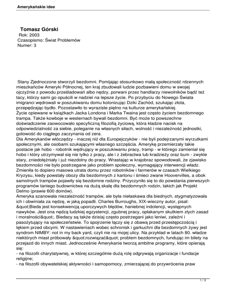 Amerykańskie idee Tomasz Górski Rok: 2003 Czasopismo: Świat Problemów Numer: 3 Stany Zjednoczone stworzyli bezdomni. Pomijając stosunkowo małą społeczność rdzennych mieszkańców Ameryki Północnej, ten kraj zbudowali ludzie pozbawieni domu w swojej ojczyźnie z powodu prześladowań albo nędzy, porwani przez handlarzy niewolników bądź też tacy, którzy sami go opuścili w nadziei na lepsze życie. Po przybyciu do Nowego Świata imigranci wędrowali w poszukiwaniu domu kolonizując Dziki Zachód, szukając złota, przepędzając bydło. Pozostawiło to wyraziste piętno na kulturze amerykańskiej. Życie opiewane w książkach Jacka Londona i Marka Twaina jest często życiem bezdomnego trampa. Także kowboje w westernach bywali bezdomni. Być może to powszechne doświadczenie zaowocowało specyficzną filozofią życiową, która kładzie nacisk na odpowiedzialność za siebie, poleganie na własnych siłach, wolność i niezależność jednostki, gotowość do ciągłego zaczynania od zera. Dla Amerykanów włóczędzy - inaczej niż dla Europejczyków - nie byli podejrzanymi wyrzutkami społecznymi, ale osobami szukającymi własnego szczęścia. Amerykę przemierzały takie postacie jak hobo - robotnik wędrujący w poszukiwaniu pracy, tramp - w którego zamieniał się hobo i który utrzymywał się nie tylko z pracy, ale i z żebractwa lub kradzieży oraz bum - zwykle stary, zniedołężniały i już niezdolny do pracy. Wrastając w krajobraz spowodowali, że zjawisko bezdomności nie było postrzegane jako problem społeczny, wymagający interwencji władz. Zmieniła to dopiero masowa utrata domu przez robotników i farmerów w czasach Wielkiego Kryzysu, kiedy powstały obozy dla bezdomnych z kartonu i śmieci zwane Hoovervilles, a obok samotnych trampów pojawiły się bezdomne rodziny. Przyczyniło się to do powstania pierwszych programów taniego budownictwa na dużą skalę dla bezdomnych rodzin, takich jak Projekt Delmo (prawie 600 domów). Ameryka szanowała niezależność trampów, ale była niełaskawa dla biednych, stygmatyzowała ich i obwiniała za nędzę, w jaką popadli. Charles Burroughs, XIX-wieczny autor, pisał: "Bieda jest konsekwencją uporczywych błędów, haniebnej indolencji, występnych nawyków. Jest ona nędzą ludzkiej egzystencji, zgubnej pracy, opłakanym skutkiem złych zasad i moralności". Biedacy są także dzisiaj często postrzegani jako leniwi, zależni i pasożytujący na społeczeństwie. To spojrzenie łączy się z obawą przed przestępczością i lękiem przed obcymi. W nastawieniach wobec schronisk i garkuchni dla bezdomnych żywy jest syndrom NIMBY: not in my back yard, czyli nie na mojej ulicy. Na przykład w latach 80. władze niektórych miast próbowały "rozwiązać" problem bezdomnych, fundując im bilety na przejazd do innych miast. Jednocześnie Amerykanie tworzą ambitne programy, które opierają się: - na filozofii charytatywnej, w której szczególnie dużą rolę odgrywają organizacje i fundacje religijne; - na filozofii obywatelskiej aktywności i samopomocy, zmierzającej do przywrócenia praw 1/3 Amerykańskie idee bezdomnym jako obywatelom. Największa organizacja działająca w tej dziedzinie, Narodowa Koalicja na rzecz Bezdomnych tak określa cztery obszary swojego działania: sprawiedliwość w zakresie mieszkań, sprawiedliwość ekonomiczna, sprawied-liwy dostęp do opieki zdrowotnej i prawa obywatelskie. Nacisk na prawa obywatelskie jest zarówno środkiem do celu - bezdomni aktywni politycznie mogą wywrzeć większy wpływ na wydatki publiczne dla bezdomnych - jak też ma zmienić świadomość samych bezdomnych. Jeden z programów pod hasłem "Nie musisz mieć domu, aby głosować" polega na pomaganiu im w rejestrowaniu się podczas wyborów. Punktem zapalnym w ideologicznych dyskusjach są przyczyny bezdomności. Według zwolenników państwa opiekuńczego, a także działaczy organizacji na rzecz bezdomnych przyczyną są wysokie ceny mieszkań i polityka rządu, która nie łagodzi nierówności ekonomicznych. Ich przeciwnicy skłonni są przypisywać bezdomność alkoholizmowi, uzależnieniu od narkotyków, chorobom psychicznym, a także patologii rodzin i rozluźnieniu więzi międzyludzkich. Za tymi różnicami w diagnozie idą zróżnicowane propozycje: pierwsi domagają się wydatków publicznych na dopłaty do tanich mieszkań oraz na wyrównywanie szans edukacyjnych i zawodowych, drudzy natomiast są przeciwko tym wydatkom uważając, że wyjść z bezdomności mogą sami bezdomni, podejmując pracę oraz rezygnując z alkoholu i narkotyków. Badania nad udziałem uzależnionych wśród bezdomnych są ciągle kwestionowane, gdyż dowodzą racji jednej lub drugiej strony konfliktu. Działacze społeczni o poglądach liberalnych uważają za kluczowe zapewnienie bezdomnym tanich mieszkań. Drugim ważnym postulatem jest odbudowanie zakładów dla chorych psychicznie, zamkniętych w latach 80. w wyniku reformy świadczeń psychiatrycznych i zastąpionych opieką ambulatoryjną i środowiskową. Negatywnym skutkiem tej polityki okazało się to, że co 20. były pacjent stał się bezdomnym. Trzecim proponowanym rozwiązaniem jest szersze finansowanie schronisk ze środków publicznych, ponieważ w dużych miastach liczba bezdomnych jest dwa razy większa niż liczba łóżek. Amerykańscy bezdomni to zróżnicowana populacja. Szczególnie dużo jest tu przedstawicieli upośledzonych społecznie mniejszości - 50% to Afroamerykanie. Często wyróżnia się wśród bezdomnych uchodźców za pracą, osoby z problemem alkoholowym lub narkotykowym, osoby poważnie chore psychicznie, tych, którzy stali się bezdomnymi w wyniku osobistej tragedii lub nieoczekiwanych okoliczności, wreszcie osoby, które po prostu wybrały taki styl życia. Jednak za podstawowe przyczyny bezdomności uważa się niskie zarobki, nie pozwalające utrzymać rodziny i mieszkania, niewystarczające świadczenia 