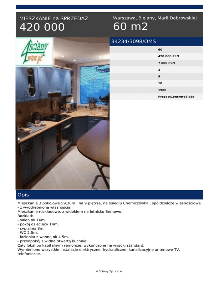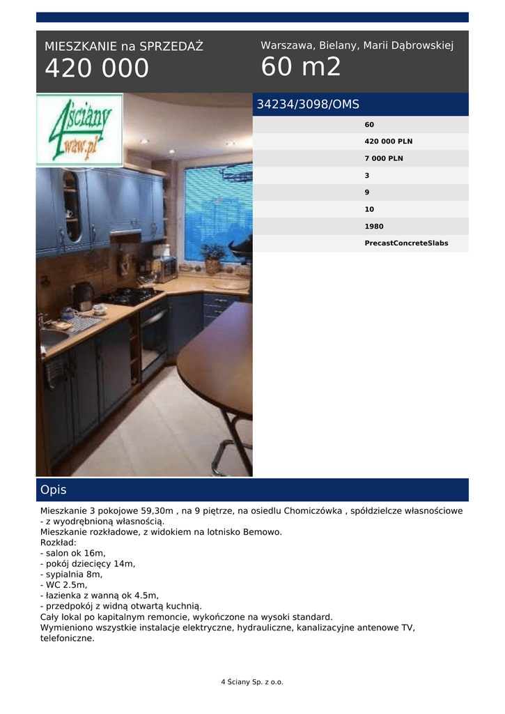 MIESZKANIE na SPRZEDAŻ 420 000 Warszawa, Bielany, Marii Dąbrowskiej 60 m2 34234/3098/OMS 60 420 000 PLN 7 000 PLN 3 9 10 1980 PrecastConcreteSlabs Opis Mieszkanie 3 pokojowe 59,30m , na 9 piętrze, na osiedlu Chomiczówka , spółdzielcze własnościowe - z wyodrębnioną własnością. Mieszkanie rozkładowe, z widokiem na lotnisko Bemowo. Rozkład: - salon ok 16m, - pokój dziecięcy 14m, - sypialnia 8m, - WC 2.5m, - łazienka z wanną ok 4.5m, - przedpokój z widną otwartą kuchnią. Cały lokal po kapitalnym remoncie, wykończone na wysoki standard. Wymieniono wszystkie instalacje elektryczne, hydrauliczne, kanalizacyjne antenowe TV, telefoniczne. 4 Ściany Sp. z o.o. Sufity podwieszane i oświetlenia halogenowe. Łazienki pełna glazura i terakota, przedpokój i kuchnia gres. Na wszystkich ścianach i sufitach gładzie gipsowe. Wymieniono wszystkie okna i drzwi z framugami, drzwi wejściowe Antywłamaniowe GERDA. Mieszkanie posiada dwie ogromne szafy wnękowe zabudowane systemem Komandor oraz duży balkon ok. 4m Do dyspozycji przedsionek /zamykana klatka dzielona z sąsiadami gdzie można spokojnie trzymać rowery, szafki np. na buty itp. W skład mieszkania wchodzi tez piwnica ok.2m. Blok całkowicie odnowiony i ocieplony. Osiedle spokojne i pełne zieleni (200 m od mieszkania przepiękny park rekreacyjny). W najbliższej okolicy ok. 200m, znajdują się: -szkoła podstawowa, -Gimnazjum -przedszkola -sklepy Biedronka 50m, -Lidl 300m, -Eleclerk, -Tesco, -CH Bemowo. Osiedle posiada bardzo dobrą infrastrukturę komunikacyjną : - 4min do przystanków tramwajowych ( 35, 6, 28, 33) - autobusowych (184,114,122,112,167). - Do metra 2 przystanki autobusowe. Zamieszczona oferta nie stanowi oferty w rozumieniu Kodeksu Cywilnego. licencja 4355; Zapytaj naszego Agenta o pomoc w otrzymaniu kredytu !!! 4 Ściany Sp. z o.o. tel. 22 629 80 80 email: [email protected] 4 Ściany Sp. z o.o. Powered by TCPDF (www.tcpdf.org)