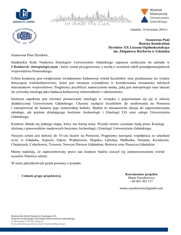 Gdańsk, 14 kwietnia 2014 r. Szanowna Pani Bożena Kondratiuk Dyrektor XX Liceum Ogólnokształcące im. Zbigniewa Herberta w Gdańsku Szanowna Pani Dyrektor, Studenckie Koło Naukowe Etnologów Uniwersytetu Gdańskiego zaprasza serdecznie do udziału w I Konkursie Antropologicznym , który został przygotowany z myślą o uczniach szkół ponadgimnazjalnych województwa Pomorskiego. Celem konkursu jest zwiększenie świadomości kulturowej wśród licealistów oraz przekazanie im wiedzy dotyczącej wielokulturowości, która jest istotnym czynnikiem w kształtowaniu tożsamości młodych mieszkańców województwa. Pragniemy przybliżyć maturzystom naukę, jaką jest antropologia oraz ukazać im sylwetkę etnologa jako badacza kulturowej różnorodności i odmienności. Istotnym aspektem jest również promowanie etnologii w związku z pojawieniem się jej w ofercie dydaktycznej Uniwersytetu Gdańskiego. Chcemy zachęcić licealistów do studiowania na Pomorzu i zainspirować do badania jego różnorodnej kultury. Będzie to niesamowita okazja do zaprezentowania młodego, ale prężnie działającego Instytutu Archeologii i Etnologii UG oraz całego Uniwersytetu Gdańskiego. Konkurs składa się jednego etapu, który ma formę testu. Wyniki testów oceniane będą przez Komisję złożoną z pracowników naukowych Instytutu Archeologii i Etnologii Uniwersytetu Gdańskiego. Naszym celem jest dotrzeć do 55-ciu liceów na Pomorzu. Pragniemy nawiązać współpracę ze szkołami m.in. w Gdańsku, Sopocie, Gdyni, Wejherowie, Słupsku, Lęborku, Malborku, Sztumie, Kwidzynie, Chojnicach, Człuchowie, Tczewie, Nowym Dworze Gdańskim, Bytowie oraz Pruszczu Gdańskim. Mamy nadzieję, że zaprezentowany przez nas konkurs będzie cieszył się zainteresowaniem wśród uczniów Państwa szkoły. W razie jakichkolwiek pytań prosimy o kontakt. Członek grupy projektowej Koordynator projektu Marta Szaszkiewicz +48 601 493 127 [email protected] Studenckie Koło Naukowe Etnologów UG Instytut Archeologii i Etnologii Uniwersytetu Gdańskiego ul. Bielańska 5, 80-952 Gdańsk www.etnokolo.ug.edu.pl, email: [email protected]