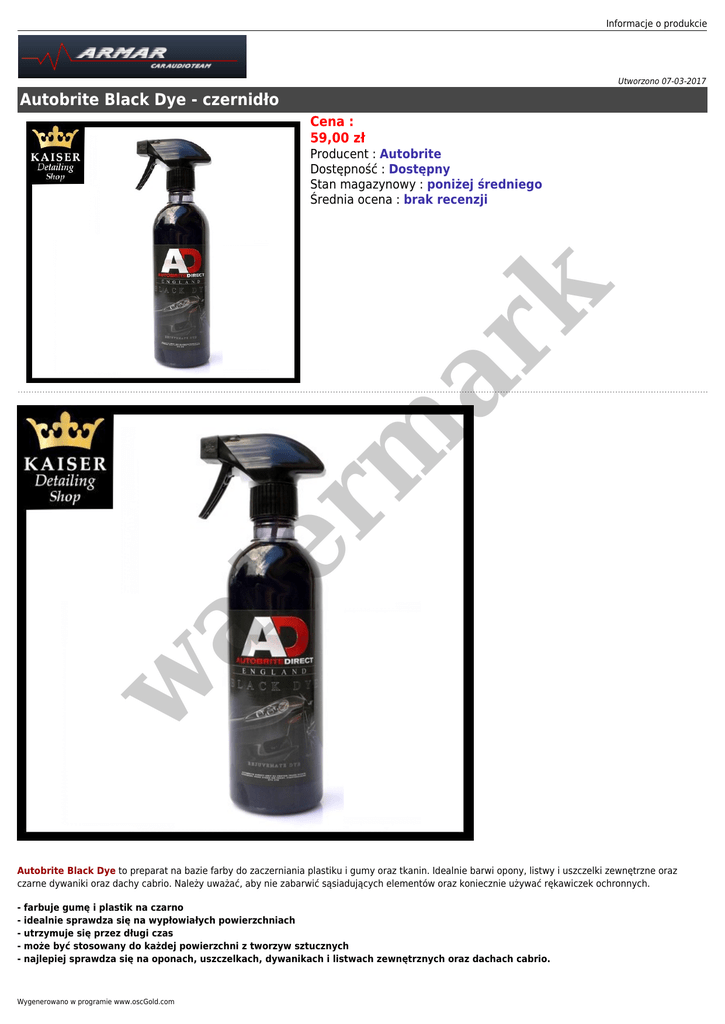 Informacje o produkcie Utworzono 07-03-2017 Autobrite Black Dye - czernidło Cena : 59,00 zł w at er m ar k Producent : Autobrite Dostępność : Dostępny Stan magazynowy : poniżej średniego Średnia ocena : brak recenzji Autobrite Black Dye to preparat na bazie farby do zaczerniania plastiku i gumy oraz tkanin. Idealnie barwi opony, listwy i uszczelki zewnętrzne oraz czarne dywaniki oraz dachy cabrio. Należy uważać, aby nie zabarwić sąsiadujących elementów oraz koniecznie używać rękawiczek ochronnych. - farbuje gumę i plastik na czarno idealnie sprawdza się na wypłowiałych powierzchniach utrzymuje się przez długi czas może być stosowany do każdej powierzchni z tworzyw sztucznych najlepiej sprawdza się na oponach, uszczelkach, dywanikach i listwach zewnętrznych oraz dachach cabrio. Wygenerowano w programie www.oscGold.com 59.00 PLN 1L 99.00 PLN w at er m ar k 500 ml