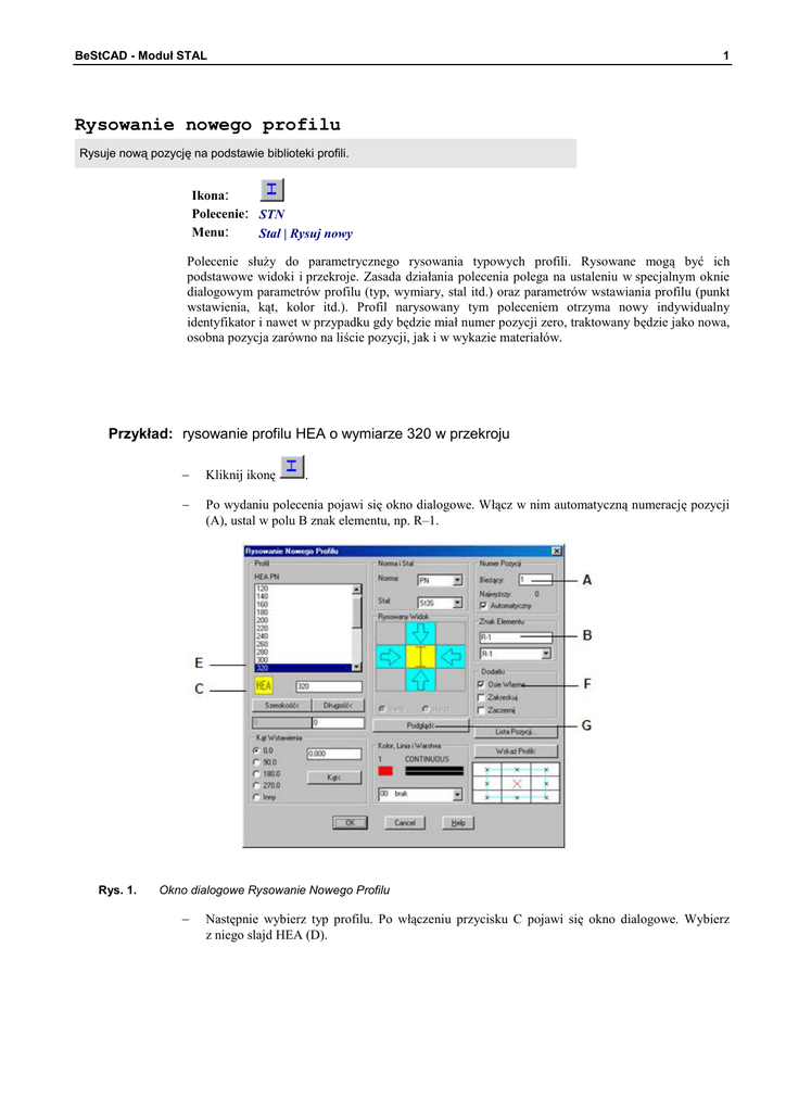 BeStCAD - Moduł STAL 1 Rysowanie nowego profilu Rysuje nową pozycję na podstawie biblioteki profili. Ikona: Polecenie: STN Menu: Stal | Rysuj nowy Polecenie służy do parametrycznego rysowania typowych profili. Rysowane mogą być ich podstawowe widoki i przekroje. Zasada działania polecenia polega na ustaleniu w specjalnym oknie dialogowym parametrów profilu (typ, wymiary, stal itd.) oraz parametrów wstawiania profilu (punkt wstawienia, kąt, kolor itd.). Profil narysowany tym poleceniem otrzyma nowy indywidualny identyfikator i nawet w przypadku gdy będzie miał numer pozycji zero, traktowany będzie jako nowa, osobna pozycja zarówno na liście pozycji, jak i w wykazie materiałów. Przykład: rysowanie profilu HEA o wymiarze 320 w przekroju Rys. 1. − Kliknij ikonę − Po wydaniu polecenia pojawi się okno dialogowe. Włącz w nim automatyczną numerację pozycji (A), ustal w polu B znak elementu, np. R–1. . Okno dialogowe Rysowanie Nowego Profilu − Następnie wybierz typ profilu. Po włączeniu przycisku C pojawi się okno dialogowe. Wybierz z niego slajd HEA (D). BeStCAD - Moduł STAL Rys. 2. 2 Okno dialogowe Wybór Profilu − Po zaakceptowaniu wyboru profilu ustal jego wymiar, wybierając z listy (E) 320. W wycinku dodatki włącz opcję Osie Własne (F). Przed zamknięciem okna możesz dokonać podglądu (G). Program poprosi o podanie punktu wstawienia profilu. Podgląd profilu. Wskaż punkt wstawienia profilu: P1 Wskaż punkt wstawienia profilu/<Koniec>: ↵ − Rys. 3. Po zaakceptowaniu punktu wstawienia i ustawień w oknie dialogowym otrzymasz poniższy rysunek. Dwuteownik HEA 320 Okno dialogowe Rysowanie Nowego Profilu Poniżej opisano szczegółowo wszystkie wycinki okna dialogowego Rysowanie Nowego Profilu (Rys. 1), a na końcu czynności wykonywane przez program po zamknięciu okna. Opis okna Rysowanie Nowego Profilu Wycinek Opis wycinka Numer Pozycji Standardowo po uruchomieniu modułu Stal jest włączona numeracja automatyczna. Dalej pokazano najwyższy numer odczytany z listy pozycji. Wyłączenie automatycznej numeracji spowoduje przyjęcie numeru zero, natomiast ponowne włączenie — wyszukanie pierwszego wolnego numeru i ustawienie go jako bieżącego. Nie oznacza to jednak, że nie można nadać innego numeru niż sugerowany. Możliwe jest ustalenie każdego numeru mniejszego od 10 000, o ile nie powoduje on kolizji z numerami pozycji narysowanych wcześniej. Element W tym wycinku ustala się przynależność rysowanej pozycji do elementu wysyłkowego. Jeżeli tworzymy nowy element wysyłkowy, wówczas należy wpisać jego nazwę (znak) do okienka edycyjnego. Zasady nazywania elementów omówiono w osobnym punkcie niniejszego rozdziału „Opis ogólny. Elementy wysyłkowe”. Jeżeli istnieją już nazwy elementów, to możemy je wybrać z listy umieszczonej w sąsiedniej rozwijanej kartotece. Zmiana istniejącej nazwy (znaku) elementu możliwa jest tylko za pomocą polecenia BeStCAD - Moduł STAL Wycinek 3 Opis wycinka ELE. Profil U góry okna znajduje się kartoteka, w której wyświetla się lista wymiarów dla wybranego typu profilu. Poniżej umieszczono przycisk piktogramowy wyboru typu profilu (patrz „Wybór typu profilu”) wraz z okienkiem edycyjnym wybranego wymiaru. Na samym dole znajdują się przyciski z okienkami edycyjnymi do ustalania szczegółowych wymiarów, jak długość czy szerokość, bezpośrednio na rysunku. W przypadku gdy chcemy rysować profil w widoku różnym od przekroju, wówczas niezbędne jest podanie długości. Dla blach konieczne jest wpisanie jednocześnie dwóch wymiarów: grubości i szerokości (grubość × szerokość). Przy wskazywaniu długości na rysunku możliwe są następujące opcje: Wskaż Linie/Wymiar/Długość: <0.00> Linia umożliwia wskazanie odcinka, na podstawie którego odczytana zostanie długość oraz kąt wstawienia profilu. Wymiar pozwala odczytać długość na podstawie wartości tekstu wymiarowego (musi to być wartość liczbowa). Natomiast długość jest to po prostu wskazanie dwóch punktów, pomiędzy którymi zostanie zmierzona odległość. Norma i Stal Wycinek zawiera dwa rozwijane okna kartotekowe z dostępnymi normami dla profili oraz gatunkami stali. Nazwy norm w przypadku profili są potraktowane skrótowo i raczej dotyczą całego pakietu norm polskich lub niemieckich. Poniżej umieszczona jest jeszcze jedna kartoteka, w której znajduje się lista z nazwami gatunków stali. Listę tę można uzupełniać w oknie konfiguracji modułu Stal. Rysowanie widoków Wycinek ten znajduje się w samym środku całego okna. Jego zadaniem jest ustalenie widoku dla rysowanego profilu. Składa się on z pięciu przycisków piktogramowych, z których zawsze musi być wybrany jeden (ma on wówczas kolor żółty, podczas gdy pozostałe są koloru niebieskiego). Na dole znajdują się dwa przyciski radiowe. Są one nieaktywne w przypadku wybrania środkowego przycisku z symbolem profilu. Możliwe jest rysowanie profili w przekrojach poprzecznych prostopadłych do osi podłużnej (przycisk centralny z wyświetlonym symbolem) oraz w jednym z czterech podstawowych widoków (przyciski ze strzałkami wokół przycisku centralnego). Rysowanie widoków Podczas rysowania widoków uaktywniają się dolne przyciski orientacji widoku. Można za ich pomocą obrócić symbol przekroju poprzecznego profilu o 90°. Rysowane widoki uwzględnią wówczas tę zmianę i możliwe staje się narysowanie np. widoku z góry w poziomie, jak to się często wykorzystuje w przypadku pasów dźwigarów. Domyślnie ustawiona jest orientacja pozioma (Horyz). Dla przekrojów poprzecznych możliwe jest również rysowanie profili zorientowanych inaczej niż poziomo, a mianowicie z wykorzystaniem kąta wstawienia. Wykorzystanie kąta wstawienia profilu razem z widokami i orientacją jest przypadkiem dość złożonym, dającym różne możliwości. Zostały one przedstawione w „Przykładach rysowania widoków pr