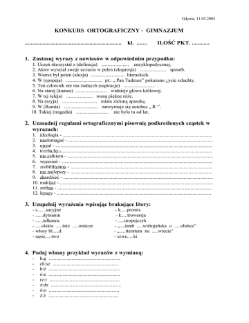 Gdynia, 11.02.2004 KONKURS ORTOGRAFICZNY - GIMNAZJUM .................................................................. kl. ....... ILOŚĆ PKT. ............ 1. Zastosuj wyrazy z nawiasów w odpowiednim przypadku: 1. Uczeń skorzystał z (definicja) ...................... encyklopedycznej. 2. Aktor wyrażał swoje uczucia w pełen (ekspresja) ..................... sposób. 3. Wiersz był pełen (aluzja) ........................... literackich. 4. W (epopeja) ............................. pt.: „ Pan Tadeusz” pokazano ¿ycie szlachty. 5. Ten człowiek nie ma żadnych (aspiracje) ......................... . 6. Na starej (kamea) ......................... widnieje głowa królowej. 7. W tej (aleja) ..................... rosną piękne róże. 8. Na (szyja) ............................ miała zieloną apaszkę. 9. W (Rumia) ........................... zatrzymuje się autobus „ R ‘’. 10. Takiej (tragedia) .......................... nie było tu od lat. 2. Uzasadnij regułami ortograficznymi pisownię podkreślonych cząstek w wyrazach: 1. ideologia - ....................................................................................................................... 2. niedomagać - ................................................................................................................... 3. ujrzał - ............................................................................................................................. 4. trzeba by - ....................................................................................................................... 5. nie całkiem - .................................................................................................................... 6. wrzesień - ........................................................................................................................ 7. zrobilibyśmy - ................................................................................................................. 8. nie najlepszy - ................................................................................................................. 9. zhardzieć - ....................................................................................................................... 10. makijaż - .......................................................................................................................... 11. zróbże - ........................................................................................................................... 12. lepszy - ........................................................................................................................... 3. Uzupełnij wyrażenia wpisując brakujące litery: - s.......sacyjne - ......dynianin - ......ielkanoc - .....olskie .....inie .....otnicze - włosy bl.....d - sąsie.....two - k.....promis - k.....trowersja - .....uropejczyk - „.....ieœñ .....wiêtojañska o .....obótce” - „.....iteratura na .....wiecie” - szwe.....ki 4. Podaj własny przykład wyrazów z wymianą: - h:g ......................................................... ch:sz .................................................... h:ż ......................................................... ó:e ......................................................... rz:r ........................................................ ż:dz ........................................................ ó:o ........................................................ ż:ź ........................................................ 5. Zapisz poprawnie wyrażenia: -na/prędce .................................................................................. -w/ogóle ..................................................................................... -od/razu ..................................................................................... -do/nikąd ................................................................................... -w/zwyż .................................................................................... -na/co/dzień ............................................................................... -na/skos ..................................................................................... -na/pewno ................................................................................... -z/po/nad .................................................................................... -zrobiono/by ............................................................................. 6. Utwórz i zapisz poprawnie skróty: -złoty .......................................... -dolar .......................................... -według ....................................... -piąty rząd .................................. -porównaj ................................... -i tak dalej ................................... -metr ............................................ -przed naszą erą .......................... -albo ............................................ -między innymi .......................... 7. Zapisz łącznie, rozdzielnie lub z myślnikiem: -krótko/terminowy .............................................................. -żółto/czerwony .................................................................. -ciemno/włosy .................................................................... -długo/wieczny ................................................................... -matematyczno/przyrodniczy ............................................. -Bielsko/Biała ..................................................................... -szybko/bieżny ................................................................... -południowo/zachodni ........................................................ -ciężko/strawny .................................................................. -głucho/niemy .................................................................... -Bielsk/Podlaski .....................................