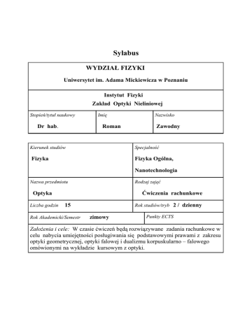 Sylabus WYDZIAŁ FIZYKI Uniwersytet im. Adama Mickiewicza w Poznaniu Instytut Fizyki Zakład Optyki Nieliniowej Stopień/tytuł naukowy Dr hab. Imię Roman Nazwisko Zawodny Kierunek studiów Specjalność Fizyka Fizyka Ogólna, Nanotechnologia Nazwa przedmiotu Rodzaj zajęć Optyka Liczba godzin Ćwiczenia rachunkowe 15 Rok Akademicki/Semestr Rok studiów/tryb 2 / dzienny zimowy Punkty ECTS Założenia i cele: W czasie ćwiczeń będą rozwiązywane zadania rachunkowe w celu nabycia umiejętności posługiwania się podstawowymi prawami z zakresu optyki geometrycznej, optyki falowej i dualizmu korpuskularno – falowego omówionymi na wykładzie kursowym z optyki. Tematyka zajęć (słowa kluczowe)/ Odsetek czasu zajęć 1. Optyka geometryczna: zasada Fermata, równanie zwierciadła i soczewki, pryzmat. 5% 2. Elementy rachunku wektorowego, równania Maxwella, równanie falowe. 10% 3. Odbicie i załamanie fali świetlnej na granicy dielektryk-dielektryk a także 25% dielektryk-metal, wzory Fresnela, wektor Poyntinga, współczynnik odbicia i transmisji, całkowite wewnętrzne odbicie, światłowód, polaryzacja fali odbitej i załamanej, zmiana polaryzacji światła ( kat Brewstera, romb Fresnela). 4. Fala świetlna w ośrodku dyspersyjnym. 5% 5. Fala quasimonochromatyczna, prędkość grupowa, paczka fal. 5% 6. Zasada Huygensa, dyfrakcja w ujęciu Fresnela i Fraunhofera na pojedynczej szczelinie, interferencja, doświadczenie Younga z uwzględnieniem dyfrakcji Fraunhofera, okulary anty-refleksyjne, beamsplitter. 25% 7. Fala świetlna w ośrodkach anizotropowych. 15% 8. Korpuskularno - falowa natura światła, energia i pęd fotonu, ciśnienie światła (żagiel słoneczny, synteza lekkich jąder, chłodzenie atomów), 10% Sposoby oceny pracy studenta ocena ciągła (bieżące przygotowanie do zajęć i aktywność) Udział w ocenie końcowej 10% śródsemestralne kolokwia pisemne/ustne końcowe zaliczenie pisemne - kolokwium 70% egzamin pisemny egzamin ustny kontrola obecności Praca końcowa semestralna/roczna inne: 20% Literatura obowiązkowa 1. Zadania własne. 2. D. Halliday, R. Resnick, Fizyka 2, PWN, Warszawa 1996 3. D. Halliday, R. Resnick, J. Walker, Podstawy Fizyki, Tom 4, Pwn, Warszawa 2003 4. Z. Kleszczewski, Wybrane Zagadnienia z Optyki Falowej, Wyd. Politechniki Śląskiej, Gliwice 2003 5. Eugene Hecht, Optics, Addison Wesley (4 Ed.) Literatura rozszerzona 1. S. Szczeniowski, Optyka, część IV, PWN, Warszawa 1967 1. B. Jaworski, H. Dietław, L. Miłkowska, Kurs Fizyki, Optyka, PWN, Warszawa, 2. H. D. Young, R. A. Freedman, University Physics with Modern Physics, Tenth Edition, Addison Wesley Longman Inc. 2000