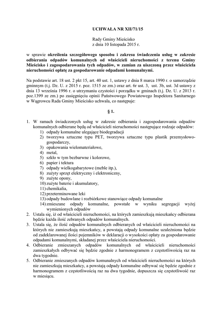 UCHWAŁA NR XII/71/15 Rady Gminy Mieścisko z dnia 10 listopada 2015 r. w sprawie określenia szczegółowego sposobu i zakresu świadczenia usług w zakresie odbierania odpadów komunalnych od właścicieli nieruchomości z terenu Gminy Mieścisko i zagospodarowania tych odpadów, w zamian za uiszczoną przez właściciela nieruchomości opłatę za gospodarowanie odpadami komunalnymi. Na podstawie art. 18 ust. 2 pkt 15, art. 40 ust. 1, ustawy z dnia 8 marca 1990 r. o samorządzie gminnym (t.j. Dz. U. z 2015 r. poz. 1515 ze zm.) oraz art. 6r ust. 3, ust. 3b, ust. 3d ustawy z dnia 13 września 1996 r. o utrzymaniu czystości i porządku w gminach (t.j. Dz. U. z 2013 r. poz.1399 ze zm.) po zasięgnięciu opinii Państwowego Powiatowego Inspektora Sanitarnego w Wągrowcu Rada Gminy Mieścisko uchwala, co następuje: § 1. 1. W ramach świadczonych usług w zakresie odbierania i zagospodarowania odpadów komunalnych odbierane będą od właścicieli nieruchomości następujące rodzaje odpadów: 1) odpady komunalne ulegające biodegradacji 2) tworzywa sztuczne typu PET, tworzywa sztuczne typu plastik przemysłowogospodarczy, 3) opakowania wielomateriałowe, 4) metal, 5) szkło w tym bezbarwne i kolorowe, 6) papier i tektura 7) odpady wielkogabarytowe (meble itp.), 8) zużyty sprzęt elektryczny i elektroniczny, 9) zużyte opony, 10) zużyte baterie i akumulatory, 11) chemikalia, 12) przeterminowane leki 13) odpady budowlane i rozbiórkowe stanowiące odpady komunalne 14) zmieszane odpady komunalne, powstałe w wyniku segregacji wyżej wymienionych odpadów 2. Ustala się, iż od właścicieli nieruchomości, na których zamieszkują mieszkańcy odbierana będzie każda ilość zebranych odpadów komunalnych. 3. Ustala się, że ilość odpadów komunalnych odbieranych od właścicieli nieruchomości na których nie zamieszkują mieszkańcy, a powstają odpady komunalne uzależniona będzie od zadeklarowanej ilości pojemników w deklaracji o wysokości opłaty za gospodarowanie odpadami komunalnymi, składanej przez właściciela nieruchomości. 4. Odbieranie zmieszanych odpadów komunalnych od właścicieli nieruchomości zamieszkałych odbywać się będzie zgodnie z harmonogramem z częstotliwością raz na dwa tygodnie. 5. Odbieranie zmieszanych odpadów komunalnych od właścicieli nieruchomości na których nie zamieszkują mieszkańcy, a powstają odpady komunalne odbywać się będzie zgodnie z harmonogramem z częstotliwością raz na dwa tygodnie, dopuszcza się częstotliwość raz w miesiącu. 6. Odbieranie odpadów ulęgających biodegradacji – odpadów zielonych od właścicieli nieruchomości odbywać się będzie systemem pojemnikowym, zgodnie z harmonogramem, nie rzadziej niż jeden raz w miesiącu. 7. Odbieranie następujących frakcji odpadów: papier i tektura, szkło, tworzywa sztuczne, opakowania wielomateriałowe, metal odbywać się będzie zgodnie a harmonogramem w podziale na grupy: 1) dla nieruchomości zamieszkałych – budynki jednorodzinne systemem workowym, nie rzadziej niż raz w miesiącu, 2) dla nieruchomości zamieszkałych – budynki wielolokalowe systemem workowym lub za pomocą pojemników określonych w regulaminie utrzymania czystości i porządku, nie rzadziej niż raz w miesiącu, 3) dla nieruchomości niezamieszkałych – systemem workowym nie rzadziej niż raz w miesiącu. 8. Harmonogram podany zostanie do publicznej wiadomości w sposób zwyczajowo przyjęty oraz zostanie ogłoszony na stronie internetowej gminy www.miescisko.nowoczesnagmina.pl § 2. 1. Punkt selektywnego zbierania odpadów komunalnych (PSZOK) funkcjonować będzie w Popowie Kościelnym 62. 2. Szczegółowe dni i godziny otwarcia PSZOKu podane zostaną do publicznej wiadomości w sposób zwyczajowo przyjęty oraz dostępne będą na stronie internetowej gminy www.miescisko.nowoczesnagmina.pl . 3. W punkcie selektywnego zbierania odpadów komunalnych będą, w ramach opłaty za gospodarowanie odpadami komunalnymi od właścicieli nieruchomości na których zamieszkują mieszkańcy, przyjmowane zebrane w sposób selektywny i dostarczone we własnym zakresie przez właścicieli nieruchomości: 1) odpady komunalne ulegające biodegradacji 2) tworzywa sztuczne typu PET, tworzywa sztuczne typu plastik przemysłowogospodarczy, 3) opakowania wielomateriałowe, 4) metal, 5) szkło w tym bezbarwne i kolorowe, 6) papier i tektura 7) odpady wielkogabarytowe (meble itp.), 8) zużyty sprzęt elektryczny i elektroniczny, 9) zużyte opony, 10) zużyte baterie i akumulatory, 11) chemikalia, 12) przeterminowane leki 13) odpady budowlane i rozbiórkowe stanowiące odpady komunalne pochodzące z drobnych prac remontowych, na które nie jest wymagane zgłoszenie ani pozwolenie na budowę właściwego organu 4. Właściciel nieruchomości dostarczający odpady na PSZOK zobowiązany jest osobiście umieścić je w odpowiednim pojemniku lub kontenerze pod nadzorem pracownika PSZOK. § 3. 1. Właściciele nieruchomości zgłaszają przypadki niewłaściwego świadczenia usług przez przedsiębiorcę odbierającego odpady komunalne od właścicieli nieruchomości lub prowadzącego punkt selektywnego zbierania odpadów komunalnych w dniu świadczenia usługi lub w kolejnym dniu roboczym: 1) Osobiście w Urzędzie Gminy w Mieścisku Plac Powstańców Wlkp. 13, 62-290 Mieścisko, 2) Telefonicznie pod numerem telefonu 61 429 80 10, 3) Pisemnie na adres Urzędu Gminy w Mieścisku Plac Powstańców Wlkp. 13,62-290 Mieścisko, 4) Za pośrednictwem poczty elektronicznej na adres [email protected]. § 4. Wykonanie uchwały powierza się Wójtowi Gminy Mieścisko. § 5. Traci moc uchwała Nr XXII/160/13 Rady Gminy Mieścisko z dnia 30 stycznia 2013 roku w sprawie określenia szczegółowego sposobu i zakresu świadczenia usług w zakresie odbierania odpadów komunalnych od właścicieli nieruchomości z terenu Gminy Mieścisko i zagospodarowania tych odpadów, w zamian za uiszczoną przez właściciela nieruch