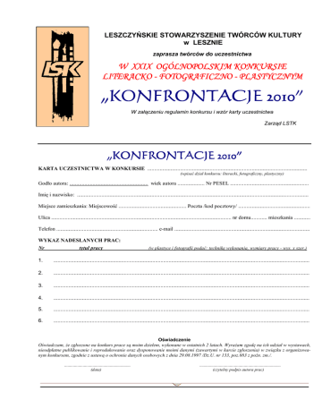 LESZCZYŃSKIE STOWARZYSZENIE TWÓRCÓW KULTURY w LESZNIE zaprasza twórców do uczestnictwa W XXIX OGÓLNOPOLSKIM KONKURSIE LITERACKO - FOTOGRAFICZNO - PLASTYCZNYM „KONFRONTACJE 2010” W załączeniu regulamin konkursu i wzór karty uczestnictwa Zarząd LSTK „KONFRONTACJE 2010” KARTA UCZESTNICTWA W KONKURSIE ...................................................................................................................... (wpisać dział konkursu: literacki, fotograficzny, plastyczny) Godło autora: .......................................................... wiek autora .................... Nr PESEL .......................................................... Imię i nazwisko: ........................................................................................................................................................................... Miejsce zamieszkania: Miejscowość .................................................. Poczta /kod pocztowy/ ..................................................... Ulica ..................................................................................................................................... nr domu............ mieszkania ............ Telefon ........................................................................... e-mail .................................................................................................... WYKAZ NADESŁANYCH PRAC: Nr tytuł pracy (w plastyce i fotografii podać: technikę wykonania, wymiary pracy - wys. x szer.) 1. ............................................................................................................................................................................................. 2. ............................................................................................................................................................................................. 3. ............................................................................................................................................................................................. 4. ............................................................................................................................................................................................. 5. ............................................................................................................................................................................................. 6. ............................................................................................................................................................................................. Oświadczenie Oświadczam, Ŝe zgłoszone na konkurs prace są moim dziełem, wykonane w ostatnich 2 latach. WyraŜam zgodę na ich udział w wystawach, nieodpłatne publikowanie i reprodukowanie oraz dysponowanie moimi danymi (zawartymi w karcie zgłoszenia) w związku z organizowanym konkursem, zgodnie z ustawą o ochronie danych osobowych z dnia 29.08.1997 /Dz.U. nr 133, poz.883 z poźn. zm./. ............................................................. (data) ........................................................................... (czytelny podpis autora prac) XXIX Ogólnopolski Konkurs Literacko - Fotograficzno - Pla Plastyczny „KONFRONTACJE 2010” Organizatorzy: Leszczyńskie Stowarzyszenie Twórców Kultury w Lesznie, Centrum Kultury i Sztuki w Lesznie, Urząd Marszałkowski Województwa Wielkopolskiego w Poznaniu, Urząd Miejski w Lesznie, Redakcje: Głos Wielkopolski, Panorama Leszczyńska. Cele konkursu: prezentacja dorobku twórców, stworzenie moŜliwości wymiany doświadczeń, konsultacje artystyczne dla uczestników, promocja młodych twórców. Warunki uczestnictwa w konkursie: 1. 2. 3. 4. 5. Konkurs ma charakter otwarty dla wszystkich zajmujących się twórczością literacką, fotograficzną, plastyczną. Warunek – ukończone 16 lat. Tematyka i technika prac jest dowolna. Udział w konkursie mogą wziąć prace wykonane w ostatnich 2 latach, dotychczas nie nagradzane na innych konkursach i wystawach.. Uczestnictwo w konkursie jest płatne. KaŜdy uczestnik wpłaca za udział w konkursie 30,-zł do 30 września 2010 r. na konto LSTK w BGś S.A. w Lesznie nr 17 2030 0045 1110 0000 0022 6100 (Zlecenie przelewu z zagranicy: BGś S.A.; CODE SWIFT: GOPZPLPW; LSTK Leszno; PL + nr konta jw.). Uczestnik konkursu ma prawo nadesłać: W dziale literackim (w 3 egzemplarzach - czcionka Times New Roman 12) - w poezji: jeden zestaw do 6 wierszy; - w prozie: 2 prace (opowiadanie, reportaŜ, felieton, nowela) do objętości 4 stron maszynopisu. W dziale fotografii: 1 lub 2 zestawy (czarno-białe lub barwne) - maksymalnie 6 prac w formacie minimum 20x30. (Dołączyć wglądówki 10x15); W dziale plastyki: do 6 prac z dziedziny: malarstwa, grafiki i rysunku, rzeźby i ceramiki, tkaniny artystycznej. Prace winny być przygotowane do ekspozycji. (ramy w obrazach olejnych... – format obrazów jest dowolny; passe-partout - format max 100x70 pod oprawę w antyramy). 5. 6. 8. KaŜda praca winna być oznaczona tytułem i godłem autora. Do prac naleŜy dołączyć kopertę opatrzoną godłem autora zawierającą wewnątrz kartę zgłoszenia z następującymi danymi: imię i nazwisko autora, wykaz nadesłanych prac ( technikę ich wykonania,), dokładny adres zamieszkania (ulica, nr domu, miejscowość, kod pocztowy), oraz wiek twórcy, nr PESEL. KaŜdy autor moŜe wystąpić pod tym samym godłem w jednym lub kilku działach konkursu. Ostateczny termin nadsyłania prac – do 30 września 2010 r. Prace naleŜy nadsyłać (w osobnych kopertach dla kaŜdego działu konkursu) z napisem: „KONFRONTACJE 2010” – „konkurs literacki”, „konkurs fotograficzny”, lub „konkurs plastyczny” na adres: Leszczyńskie Stowarzyszenie Twórców Kultury Centrum Kultury i Sztuki ul. Narutowicza 69, 64-100 Leszno. 7. 8. 9. 10. 11. 12. 13. 14. Oceny prac do