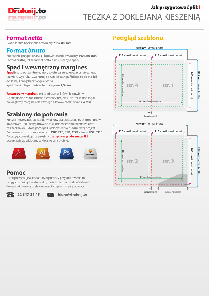 Jak przygotować plik? TECZKA Z DOKLEJANĄ KIESZENIĄ Format netto Twoja teczka będzie miała wymiary 215x300 mm. Podgląd szablonu 440 mm (format brutto) Format brutto Poprawnie przygotowany plik powinien mieć wymiary 440x305 mm. Format brutto jest to format netto powiększony o spad. 215 mm (format netto) 215 mm (format netto) Spad i wewnętrzny margines [email protected] 305 mm (format brutto) Jeżeli potrzebujesz dodatkowej pomocy przy odpowiednim przygotowaniu pliku do druku, możesz się z nami skontaktować drogą mail’ową oraz telefoniczną. Z chęcią służymy pomocą. 22 847-24-15 5 mm (grzbiet) 440 mm (format brutto) 215 mm (format netto) 292 mm (wew. margines) Pomoc 305 mm (format brutto) 427 mm (wew. margines) Szablony do pobrania Poniżej możesz pobrać szablony plików dla poszczególnych programów graficznych. Pliki przygotowane są w odpowiednim rozmiarze oraz ze znacznikami, które pomogą Ci odpowiednio osadzić swój projket. Preferowane przez nas formaty to PDF, EPS, PSD, CDR, a także JPG i TIFF. Po przygotowaniu pliku prosimy usunąć wszystkie znaczniki, pozostawiając widoczny wyłacznie sam projekt. str. 1 300 mm (format netto) str. 4 300 mm (format netto) Wewnętrzny margines jest to obszar, w który nie powinny się znajdować żadne istotne elementy projektu (np. tekst albo logo). Wewnętrzny margines dla każdego z boków teczki wynosi 4 mm. 292 mm (wew. margines) Spad jest to obszar druku, który wychodzi poza obszar ostatecznego rozmiaru wydruku. Gwarantuje on, że obszar grafiki będzie dochodził do samej krawędzi przycięcia teczki. Spad dla każdego z boków teczki wynosi 2,5 mm. 215 mm (format netto) str. 2 str. 3 427 mm (wew. margines) 5 mm (grzbiet) miejsce na kieszeń