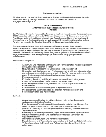 Kassel, 17. November 2015 Stellenausschreibung Für eine zum 01. Januar 2016 zu besetzende Position mit Dienstsitz in unserer deutschpolnischen Stiftung "Pamięć" in Warschau sucht der Volksbund Deutsche Kriegsgräberfürsorge e. V. eine/n Referenten/in „Internationale Jugendbegegnungen“ Polen (Vollzeit) Der Volksbund Deutsche Kriegsgräberfürsorge e. V. pflegt im Auftrag der Bundesregierung 832 Kriegsgräberstätten mit etwa 2,7 Millionen Kriegstoten in 45 Staaten und organisiert Projekte der historisch-politischen Jugend- und Erwachsenenbildung in Verbindung mit Kriegsgräber- und Gedenkstätten im In- und Ausland. Kriegsgräberstätten sollen in ihrer Funktion als Lernorte der Geschichte und für die Gegenwart genutzt werden. Das neu aufgestellte und dezentral organisierte Kompetenzcenter Internationale Jugendbegegnungen koordiniert und organisiert Workcamps und Jugendbegegnungen im Inund Ausland mit verschiedenen Partnerorganisationen. Für die Umsetzung, den Ausbau sowie für die inhaltliche Profilierung dieser Programmangebote in Polen suchen wir eine/n engagierte/n Kollegin oder Kollegen als projektorientierte/r und jugendpolitische/r „Botschafter/in“. Ihre zentralen Aufgaben: • • • • • • • • Anbahnung und inhaltliche Entwicklung von Partnerschaften mit Bildungsträgern und Jugendorganisationen in Polen Netzwerkarbeit mit Trägern der Erinnerungs- und Jugendarbeit Konzeption und Realisierung von Workcamps sowie bi-, tri- und internationalen Jugendbegegnungen in Zusammenarbeit mit den Partnerorganisationen und in enger Abstimmung mit den Inlandsbildungsreferent/innen als Entsendeorganisation Einbindung, Beratung und Begleitung der ehrenamtlichen Leitungsteams Inhaltliche Betreuung der Teilnehmenden und deren Eltern Entwicklung und Durchführung von Aus- und Fortbildungsmaßnahmen für Ehrenamtliche Konzeptionelle Weiterentwicklung des Aufgabenbereichs Interdisziplinäre Zusammenarbeit mit anderen Kompetenzcentern und Funktionsbereichen des Volksbundes. Ihr Profil: • • • • • • • • Abgeschlossenes Studium im pädagogischen, historischen, kultur- oder sozialwissenschaftlichen Bereich Polenbezogenes Fachwissen und Kenntnisse der historisch-politischen Orte sowie der jugendpolitischen und erinnerungskulturellen Netzwerke, praktische Erfahrung in der Konzipierung und Umsetzung von internationalen Jugendprojekten Erfahrung in der Trainingsarbeit mit jungen Menschen und Multiplikator/innen konzeptionell-strukturierter und selbständiger Arbeitsstil verbunden mit Organisationsstärke internationale Erfahrungen und Kommunikationsstärke Dienstleistungs- und Teamorientierung, Initiative und Spaß am Tätigkeitsbereich Verhandlungssicher in Deutsch und Polnisch, weitere Sprachkenntnisse willkommen Kassel, 17. November 2015 • • • • Souveräner Umgang mit MS-Office-Anwendungen und Datenbanken Belastbarkeit und Bereitschaft zu regelmäßigen Dienstreisen (auch an Wochenenden) Identifikation mit den satzungsgemäßen Aufgaben, Zielen und der friedensfördernden Idee des Volksbundes Deutsche Kriegsgräberfürsorge e. V. Führerschein Klasse B Wir bieten Ihnen: • • • eine abwechslungsreiche und verantwortungsvolle Tätigkeit die Möglichkeit zur regelmäßigen Fort- und Weiterbildung eine angemessene Vergütung Der Dienstsitz ist Warschau. Die Stelle ist langfristig angelegt. Die Einstellung erfolgt zunächst auf zwei Jahre befristet. Für Informationen bzw. Rückfragen steht Ihnen der Leiter des Kompetenzcenters Konstantin Dittrich per E-Mail ([email protected]) oder telefonisch (+49-561-7009-160) vorab gern zur Verfügung. Ihre qualifizierte schriftliche Bewerbung wird bis zum 15. Dezember 2015 erbeten an: Volksbund Deutsche Kriegsgräberfürsorge e. V. Abteilung Verwaltung/Personalwesen Kennziffer: GB-PO Werner-Hilpert-Str. 2 34117 Kassel Eine Bewerbung per E-Mail ist möglich, sofern Anschreiben und sämtliche Anlagen in einer PDF-Datei zusammengestellt werden. Bitte nutzen Sie ausschließlich die Mail-Adresse [email protected]. Für die Geschäftsleitung Daniela Schily (Generalsekretärin) Kassel, 17. November 2015 Volksbund Deutsche Kriegsgräberfürsorge e. V. poszukuje od 1 stycznia 2016r. na stanowisko z siedzibą w naszej polsko – niemieckiej Fundacji „Pamięć” w Warszawie REFERENTKI/REFERENTA „MIĘDZYNARODOWE SPOTKANIA MŁODZIEŻY“ polSKA (cały etat) Volksbund Deutsche Kriegsgräberfürsorge e. V. opiekuje się na zlecenie rządu federalnego 832 cmentarzami wojennymi w 45 krajach, na których pochowanych jest ok. 2,7 miliona poległych i zmarłych wskutek wojen, a także organizuje projekty z zakresu historycznopolitycznego kształcenia dla młodzieży i dorosłych w oparciu o cmentarze oraz miejsca pamięci w kraju i zagranicą. Cmentarze wojenne mają być bowiem wykorzystywane na przyszłość oraz jako miejsca nauczania historii. Nowotworzone oraz decentralnie zorganizowane Centrum Kompetencyjne Międzynarodowych Spotkań Młodzieży koordynuje i organizuje obozy i spotkania młodzieżowe w kraju i zagranicą we współpracy z organizacjami partnerskimi. Do realizacji, rozbudowy i merytorycznego przygotowania wspomnianych ofert programowych w Polsce poszukujemy zaangażowanej osoby jako „Ambasadora“ ds. projektów i polityki młodzieżowej. Państwa główne zadania: • Zainicjowanie i merytoryczne rozwinięcie partnerstwa z instytucjami edukacyjnymi oraz organizacjami młodzieżowymi w Polsce • Utworzenie sieci kontaktów z jednostkami ds. upamiętnień i pracy z młodzieżą • Koncepcja i realizacja obozów młodzieżowych oraz dwu-, trzy- i międzynarodowych spotkań młodzieży we współpracy z organizacjami partnerskimi oraz w ścisłym uzgodnieniu z krajowym referentem ds. edukacji jako organizacją wysyłającą • Włączenie, doradztwo oraz wsparcie dla społecznego zespołu kierowniczego • Merytoryczne informacje dla uczestników i ich rodziców • Rozwinięcie i przeprowadzenie programu kszta