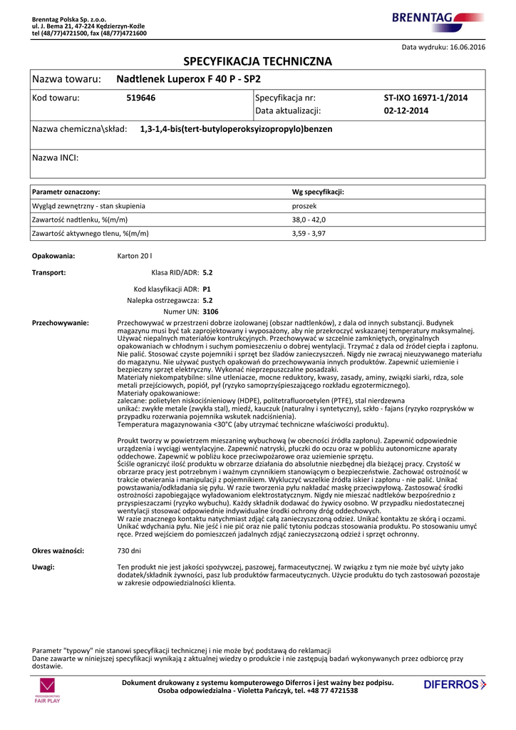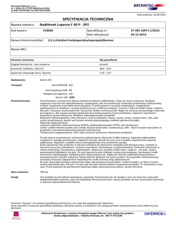 Brenntag Polska Sp. z.o.o. ul. J. Bema 21, 47-224 Kędzierzyn-Koźle tel (48/77)4721500, fax (48/77)4721600 Data wydruku: 16.06.2016 SPECYFIKACJA TECHNICZNA Nazwa towaru: Kod towaru: Nadtlenek Luperox F 40 P - SP2 519646 Nazwa chemiczna\skład: Specyfikacja nr: Data aktualizacji: ST-IXO 16971-1/2014 02-12-2014 1,3-1,4-bis(tert-butyloperoksyizopropylo)benzen Nazwa INCI: Parametr oznaczony: Wg specyfikacji: Wygląd zewnętrzny - stan skupienia proszek Zawartość nadtlenku, %(m/m) 38,0 - 42,0 Zawartość aktywnego tlenu, %(m/m) 3,59 - 3,97 Opakowania: Karton 20 l Transport: Przechowywanie: Klasa RID/ADR: 5.2 Kod klasyfikacji ADR: P1 Nalepka ostrzegawcza: 5.2 Numer UN: 3106 Przechowywać w przestrzeni dobrze izolowanej (obszar nadtlenków), z dala od innych substancji. Budynek magazynu musi być tak zaprojektowany i wyposażony, aby nie przekroczyć wskazanej temperatury maksymalnej. Używać niepalnych materiałów kontrukcyjnych. Przechowywać w szczelnie zamkniętych, oryginalnych opakowaniach w chłodnym i suchym pomieszczeniu o dobrej wentylacji. Trzymać z dala od źródeł ciepła i zapłonu. Nie palić. Stosować czyste pojemniki i sprzęt bez śladów zanieczyszczeń. Nigdy nie zwracaj nieuzywanego materiału do magazynu. Nie używać pustych opakowań do przechowywania innych produktów. Zapewnić uziemienie i bezpieczny sprzęt elektryczny. Wykonać nieprzepuszczalne posadzaki. Materiały niekompatybilne: silne utleniacze, mocne reduktory, kwasy, zasady, aminy, związki siarki, rdza, sole metali przejściowych, popiół, pył (ryzyko samoprzyśpieszającego rozkładu egzotermicznego). Materiały opakowaniowe: zalecane: polietylen niskociśnieniowy (HDPE), politetrafluoroetylen (PTFE), stal nierdzewna unikać: zwykłe metale (zwykła stal), miedź, kauczuk (naturalny i syntetyczny), szkło - fajans (ryzyko rozprysków w przypadku rozerwania pojemnika wskutek nadciśnienia). Temperatura magazynowania <30°C (aby utrzymać techniczne właściwości produktu). Proukt tworzy w powietrzem mieszaninę wybuchową (w obecności źródła zapłonu). Zapewnić odpowiednie urządzenia i wyciągi wentylacyjne. Zapewnić natryski, płuczki do oczu oraz w pobliżu autonomiczne aparaty oddechowe. Zapewnić w pobliżu koce przeciwpożarowe oraz uziemienie sprzętu. Ściśle ograniczyć ilość produktu w obrzarze działania do absolutnie niezbędnej dla bieżącej pracy. Czystość w obrzarze pracy jest potrzebnym i ważnym czynnikiem stanowiącym o bezpieczeństwie. Zachować ostrożność w trakcie otwierania i manipulacji z pojemnikiem. Wykluczyć wszelkie źródła iskier i zapłonu - nie palić. Unikać powstawania/odkładania się pyłu. W razie tworzenia pyłu nakładać maskę przeciwpyłową. Zastosować środki ostrożności zapobiegające wyładowaniom elektrostatycznym. Nigdy nie mieszać nadtleków bezpośrednio z przyspieszaczami (ryzyko wybuchu). Każdy składnik dodawać do żywicy osobno. W przypadku niedostatecznej wentylacji stosować odpowiednie indywidualne środki ochrony dróg oddechowych. W razie znacznego kontaktu natychmiast zdjąć całą zanieczyszczoną odzież. Unikać kontaktu ze skórą i oczami. Unikać wdychania pyłu. Nie jeść i nie pić oraz nie palić tytoniu podczas stosowania produktu. Po stosowaniu umyć ręce. Przed wejściem do pomieszczeń jadalnych zdjąć zanieczyszczoną odzież i sprzęt ochronny. Okres ważności: 730 dni Uwagi: Ten produkt nie jest jakości spożywczej, paszowej, farmaceutycznej. W związku z tym nie może być użyty jako dodatek/składnik żywności, pasz lub produktów farmaceutycznych. Użycie produktu do tych zastosowań pozostaje w zakresie odpowiedzialności klienta. Parametr "typowy" nie stanowi specyfikacji technicznej i nie może być podstawą do reklamacji Dane zawarte w niniejszej specyfikacji wynikają z aktualnej wiedzy o produkcie i nie zastępują badań wykonywanych przez odbiorcę przy dostawie. Dokument drukowany z systemu komputerowego Diferros i jest ważny bez podpisu. Osoba odpowiedzialna - Violetta Pańczyk, tel. +48 77 4721538