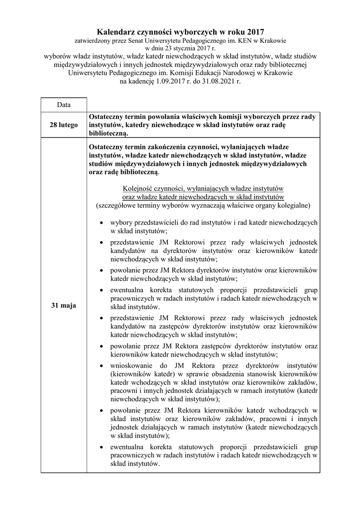 Kalendarz czynności wyborczych w roku 2017 zatwierdzony przez Senat Uniwersytetu Pedagogicznego im. KEN w Krakowie w dniu 23 stycznia 2017 r. wyborów władz instytutów, władz katedr niewchodzących w skład instytutów, władz studiów międzywydziałowych i innych jednostek międzywydziałowych oraz rady bibliotecznej Uniwersytetu Pedagogicznego im. Komisji Edukacji Narodowej w Krakowie na kadencję 1.09.2017 r. do 31.08.2021 r. Data 28 lutego Ostateczny termin powołania właściwych komisji wyborczych przez rady instytutów, katedry niewchodzące w skład instytutów oraz radę biblioteczną. Ostateczny termin zakończenia czynności, wyłaniających władze instytutów, władze katedr niewchodzących w skład instytutów, władze studiów międzywydziałowych i innych jednostek międzywydziałowych oraz radę biblioteczną. Kolejność czynności, wyłaniających władze instytutów oraz władze katedr niewchodzących w skład instytutów (szczegółowe terminy wyborów wyznaczają właściwe organy kolegialne) wybory przedstawicieli do rad instytutów i rad katedr niewchodzących w skład instytutów; przedstawienie JM Rektorowi przez rady właściwych jednostek kandydatów na dyrektorów instytutów oraz kierowników katedr niewchodzących w skład instytutów; powołanie przez JM Rektora dyrektorów instytutów oraz kierowników katedr niewchodzących w skład instytutów; ewentualna korekta statutowych proporcji przedstawicieli grup pracowniczych w radach instytutów i radach katedr niewchodzących w skład instytutów. przedstawienie JM Rektorowi przez rady właściwych jednostek kandydatów na zastępców dyrektorów instytutów oraz kierowników katedr niewchodzących w skład instytutów; powołanie przez JM Rektora zastępców dyrektorów instytutów oraz kierowników katedr niewchodzących w skład instytutów; wnioskowanie do JM Rektora przez dyrektorów instytutów (kierowników katedr) w sprawie obsadzenia stanowisk kierowników katedr wchodzących w skład instytutów oraz kierowników zakładów, pracowni i innych jednostek działających w ramach instytutów (katedr niewchodzących w skład instytutów); powołanie przez JM Rektora kierowników katedr wchodzących w skład instytutów oraz kierowników zakładów, pracowni i innych jednostek działających w ramach instytutów (katedr niewchodzących w skład instytutów); ewentualna korekta statutowych proporcji przedstawicieli grup pracowniczych w radach instytutów i radach katedr niewchodzących w skład instytutów. 31 maja