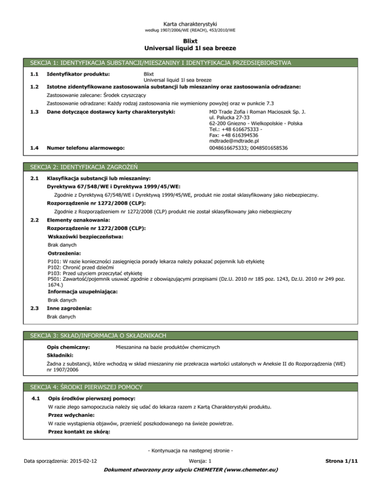 Karta charakterystyki według 1907/2006/WE (REACH), 453/2010/WE Blixt Universal liquid 1l sea breeze SEKCJA 1: IDENTYFIKACJA SUBSTANCJI/MIESZANINY I IDENTYFIKACJA PRZEDSIĘBIORSTWA 1.1 1.2 Identyfikator produktu: Blixt Universal liquid 1l sea breeze Istotne zidentyfikowane zastosowania substancji lub mieszaniny oraz zastosowania odradzane: Zastosowanie zalecane: Środek czyszczący Zastosowanie odradzane: Każdy rodzaj zastosowania nie wymieniony powyżej oraz w punkcie 7.3 1.3 Dane dotyczące dostawcy karty charakterystyki: 1.4 Numer telefonu alarmowego: MD Trade Zofia i Roman Macioszek Sp. J. ul. Palucka 27-33 62-200 Gniezno - Wielkopolskie - Polska Tel.: +48 616675333 Fax: +48 616394536 [email protected] 0048616675333; 0048501658536 SEKCJA 2: IDENTYFIKACJA ZAGROŻEŃ 2.1 Klasyfikacja substancji lub mieszaniny: Dyrektywa 67/548/WE i Dyrektywa 1999/45/WE: Zgodnie z Dyrektywą 67/548/WE i Dyrektywą 1999/45/WE, produkt nie został sklasyfikowany jako niebezpieczny. Rozporządzenie nr 1272/2008 (CLP): Zgodnie z Rozporządzeniem nr 1272/2008 (CLP) produkt nie został sklasyfikowany jako niebezpieczny 2.2 Elementy oznakowania: Rozporządzenie nr 1272/2008 (CLP): Wskazówki bezpieczeństwa: Brak danych Ostrzeżenia: P101: W razie konieczności zasięgnięcia porady lekarza należy pokazać pojemnik lub etykietę P102: Chronić przed dziećmi P103: Przed użyciem przeczytać etykietę P501: Zawartość/pojemnik usuwać zgodnie z obowiązującymi przepisami (Dz.U. 2010 nr 185 poz. 1243, Dz.U. 2010 nr 249 poz. 1674.) Informacja uzupełniająca: Brak danych 2.3 Inne zagrożenia: Brak danych SEKCJA 3: SKŁAD/INFORMACJA O SKŁADNIKACH Opis chemiczny: Mieszanina na bazie produktów chemicznych Składniki: Żadna z substancji, które wchodzą w skład mieszaniny nie przekracza wartości ustalonych w Aneksie II do Rozporządzenia (WE) nr 1907/2006 SEKCJA 4: ŚRODKI PIERWSZEJ POMOCY 4.1 Opis środków pierwszej pomocy: W razie złego samopoczucia należy się udać do lekarza razem z Kartą Charakterystyki produktu. Przez wdychanie: W razie wystąpienia objawów, przenieść poszkodowanego na świeże powietrze. Przez kontakt ze skórą: - Kontynuacja na następnej stronie Data sporządzenia: 2015-02-12 Wersja: 1 Dokument stworzony przy użyciu CHEMETER (www.chemeter.eu) Strona 1/11 Karta charakterystyki według 1907/2006/WE (REACH), 453/2010/WE Blixt Universal liquid 1l sea breeze SEKCJA 4: ŚRODKI PIERWSZEJ POMOCY (Ciąg dalszy) W razie kontaktu ze skórą zaleca się oczyścić narażone miejsce bieżącą wodą i mydłem neutralnym. W razie zmian skórnych (piekący ból, zaczerwienienie, wysypka, pęcherze,...), należy udać się do lekarza z Kartą Charakterystyki produktu. Przez kontakt z oczami: Przepłukać wodą aż do usunięcia produktu. W razie dokuczliwości, udać się do lekarza z Kartą Charakterystyki produktu. Przez połknięcie: W razie połknięcia większych ilości, zaleca się wezwać pomoc lekarską. 4.2 Najważniejsze ostre i opóźnione objawy oraz skutki narażenia: Natychmiastowe i opóźnione efekty są wskazane w pkt. 2 i 11. 4.3 Wskazania dotyczące wszelkiej natychmiastowej pomocy lekarskiej i szczególnego postępowania z poszkodowanym: Brak danych SEKCJA 5: POSTĘPOWANIE W PRZYPADKU POŻARU 5.1 Środki gaśnicze: 5.2 Produkt niepalny, dzięki swoim właściwościom w normalnych warunkach postępowania, magazynowania i użytkowania nie stwarza zagrożenia pożarem. W razie zapalenia się produktu na skutek niewłaściwego postępowania, magazynowania lub użytkowania można zastosować jakikolwiek rodzaj gaśnic (proszek ABC, woda, ...) Szczególne zagrożenia związane z substancją lub mieszaniną: 5.3 Ze względu na stopień łatwopalności, produkt nie stanowi zagrożenia dla pożaru w normalnych warunkach przechowywania, postępowania i użytkowania. Informacje dla straży pożarnej: Należy mieć do dyspozycji minimalny zasób urządzeń awaryjnych i środków do działania (koce przeciwpożarowe, podręczna apteczka, ...) zgodnie z Dyrektywą 89/654/EC. Dodatkowe postanowienia: Działać zgodnie z Wewnętrznym Planem Awaryjnym i ulotkami informacyjnymi opisującymi postępowanie w razie wypadków i innych sytuacji awaryjnych. SEKCJA 6: POSTĘPOWANIE W PRZYPADKU NIEZAMIERZONEGO UWOLNIENIA DO ŚRODOWISKA 6.1 Indywidualne środki ostrożności, wyposażenie ochronne i procedury w sytuacjach awaryjnych: Odizolować miejsca ulatniania się gazów, o ile czynność ta nie stanowi zagrożenia dla osób, które ją wykonują. 6.2 Środki ostrożności w zakresie ochrony środowiska: 6.3 Produkt nie został sklasyfikowany jako niebezpieczny. Nie dopuścić do skażenia wód gruntowych i powierzchniowych, cieków wodnych, gleby, kanalizacji. Metody i materiały zapobiegające rozprzestrzenianiu się skażenia i służące do usuwania skażenia: Zaleca się: 6.4 Wchłonąć rozlany produkt za pomocą piasku lub neutralnego absorbentu i przenieść go w bezpieczne miejsce. Nie używać do wchłaniania trocin lub innych łatwopalnych absorbentów. Wszelkie uwagi dotyczące usuwania produktu można znaleźć w sekcji 13. Odniesienia do innych sekcji: Patrz również p.8 i 13. SEKCJA 7: POSTĘPOWANIE Z SUBSTANCJAMI I MIESZANINAMI ORAZ ICH MAGAZYNOWANIE 7.1 Środki ostrożności dotyczące bezpiecznego postępowania: A.- Środki ostrożności niezbędne dla bezpiecznego obchodzenia się z produktem Należy działać zgodnie z obowiązującym prawem w kwestii zapobiegania zagrożeniom w miejscu pracy związanym z ręczną obsługą ładunków. Zachować porządek, czystość i usuwać bezpiecznymi metodami (sekcja 6). B.- Zalecenia techniczne w kwestii zapobiegania pożarom i wybuchom. - Kontynuacja na następnej stronie Data sporządzenia: 2015-02-12 Wersja: 1 Dokument stworzony przy użyciu CHEMETER (www.chemeter.eu) Strona 2/11 Karta charakterystyki według 1907/2006/WE (REACH), 453/2010/WE Blixt Universal liquid 1l sea breeze SEKCJA 7: POSTĘPOWANIE Z SUBSTANCJAMI I MIESZA