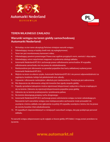 TEREN WŁASNEGO ZAKŁADU Warunki wstępu na teren giełdy samochodowej Automarkt Nederland: 1. Wchodząc na ten teren akceptują Państwo niniejsze warunki wstępu; 2. Odwiedzający muszą w każdej chwili móc się wylegitymować; 3. Teren ten jest monitorowany kamerami video; 4. Odwiedzający powinni przestrzegać Prawa oraz ogólnie przyjętych norm, wartości i obyczajów; 5. Odwiedzający winni natychmiast reagować na polecenia obsługi zakładu; 6.Automarkt Nederland/ATS B.V. zachowuje prawo odholowania samochodów. W wypadku odholowania samochodu nie ma prawa do odszkodowania; 7.Niedozwolone jest oferowanie na sprzedaż pojazdów bez karty zakładowej wydanej przez Automarkt Nederland/ATS B.V.; 8.Wejście na teren na własne ryzyko. Automarkt Nederland/ATS B.V. nie ponosi odpowiedzialności za zaginięcia, kradzieże, kolizje lub jakiekolwiek inne szkody; 9. Używanie i oferowanie narkotyków i alkoholu jest niedozwolone. Prostytucja jest zabroniona; 10. Nie dopuszcza się oferowania usług lub towarów bez zgody zespołu giełdy; 11.Pojazdy sprzedane/zakupione można rejestrować/eksportować wyłącznie w biurze znajdującym się na terenie. Zabrania się rejestracji/eksportowania pojazdów poza giełdą; 12. Zabrania się na terenie przekazywania i przelewania paliwa; 13. Na terenie obowiązują przepisy ruchu drogowego; 14.Automarkt Nederland/ATS B.V. zachowuje prawo odmówienia wstępu na teren odwiedzającym. Naruszenie tych warunków wstępu oraz niedopuszczalne zachowanie może prowadzić do usunięcia z terenu zakładu oraz zgłoszenia na policji. W wypadku usunięcia z terenu nie ma prawa do zwrotu kosztów i/lub odszkodowania; 15.W wypadkach nieprzewidzianych w niniejszych warunkach wstępu, decyzje podejmuje personel zakładu. Te warunki wstępu zdeponowane są do wglądu w biurze giełdy (ATS Balie) i mogą zostać przesłane na życzenie. www.automarkt.nl