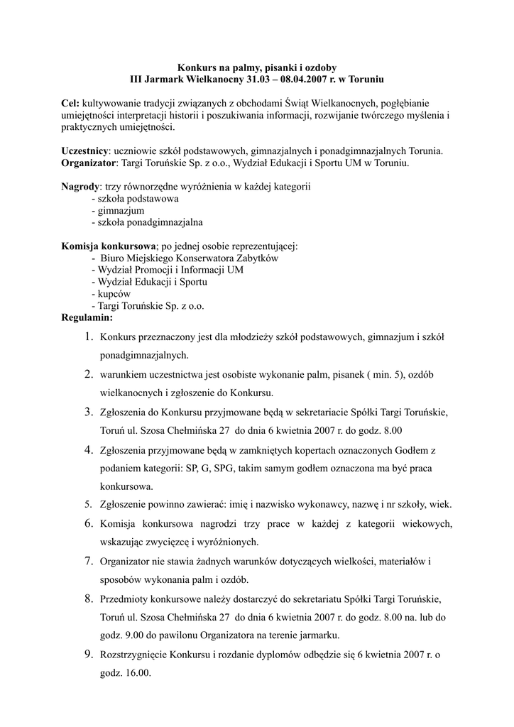 Konkurs na palmy, pisanki i ozdoby III Jarmark Wielkanocny 31.03 – 08.04.2007 r. w Toruniu Cel: kultywowanie tradycji związanych z obchodami Świąt Wielkanocnych, pogłębianie umiejętności interpretacji historii i poszukiwania informacji, rozwijanie twórczego myślenia i praktycznych umiejętności. Uczestnicy: uczniowie szkół podstawowych, gimnazjalnych i ponadgimnazjalnych Torunia. Organizator: Targi Toruńskie Sp. z o.o., Wydział Edukacji i Sportu UM w Toruniu. Nagrody: trzy równorzędne wyróżnienia w każdej kategorii - szkoła podstawowa - gimnazjum - szkoła ponadgimnazjalna Komisja konkursowa; po jednej osobie reprezentującej: - Biuro Miejskiego Konserwatora Zabytków - Wydział Promocji i Informacji UM - Wydział Edukacji i Sportu - kupców - Targi Toruńskie Sp. z o.o. Regulamin: 1. Konkurs przeznaczony jest dla młodzieży szkół podstawowych, gimnazjum i szkół ponadgimnazjalnych. 2. warunkiem uczestnictwa jest osobiste wykonanie palm, pisanek ( min. 5), ozdób wielkanocnych i zgłoszenie do Konkursu. 3. Zgłoszenia do Konkursu przyjmowane będą w sekretariacie Spółki Targi Toruńskie, Toruń ul. Szosa Chełmińska 27 do dnia 6 kwietnia 2007 r. do godz. 8.00 4. Zgłoszenia przyjmowane będą w zamkniętych kopertach oznaczonych Godłem z podaniem kategorii: SP, G, SPG, takim samym godłem oznaczona ma być praca konkursowa. 5. Zgłoszenie powinno zawierać: imię i nazwisko wykonawcy, nazwę i nr szkoły, wiek. 6. Komisja konkursowa nagrodzi trzy prace w każdej z kategorii wiekowych, wskazując zwycięzcę i wyróżnionych. 7. Organizator nie stawia żadnych warunków dotyczących wielkości, materiałów i sposobów wykonania palm i ozdób. 8. Przedmioty konkursowe należy dostarczyć do sekretariatu Spółki Targi Toruńskie, Toruń ul. Szosa Chełmińska 27 do dnia 6 kwietnia 2007 r. do godz. 8.00 na. lub do godz. 9.00 do pawilonu Organizatora na terenie jarmarku. 9. Rozstrzygnięcie Konkursu i rozdanie dyplomów odbędzie się 6 kwietnia 2007 r. o godz. 16.00. 10. Sposób oceny prac konkursowych: Każdy z członków komisji konkursowej przyznaje wybranym przez siebie pracom w każdej z kategorii miejsca I, II, III Za miejsce pierwsze praca otrzymuje 3 punkty Za miejsce drugie 2 punkty Za miejsce trzecie 1 punkt O ostatecznym miejscu jakie zajmie praca konkursowa decyduje suma otrzymanych punktów przyznanych przez wszystkich członków komisji 11. Organizator zastrzega sobie prawo zatrzymania prac nagrodzonych. 12. Organizator nie zwraca prac nadesłanych na konkurs a nieodebranych w czasie ogłoszenia wyników. Organizator Targi Toruńskie Sp. z o.o. ul. Szosa Bydgoska 3 87-100 Toruń Tel.: 056 612 02 61, 606 228 247