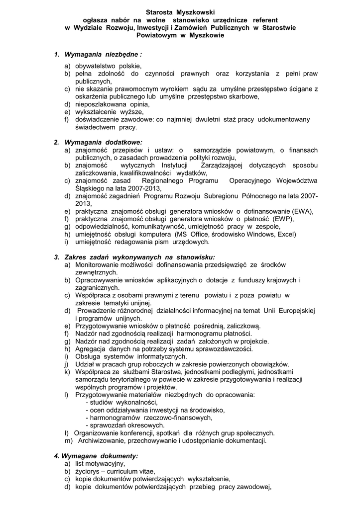 Starosta Myszkowski ogłasza nabór na wolne stanowisko urzędnicze referent w Wydziale Rozwoju, Inwestycji i Zamówień Publicznych w Starostwie Powiatowym w Myszkowie 1. Wymagania niezbędne : a) obywatelstwo polskie, b) pełna zdolność do czynności prawnych oraz korzystania z pełni praw publicznych, c) nie skazanie prawomocnym wyrokiem sądu za umyślne przestępstwo ścigane z oskarżenia publicznego lub umyślne przestępstwo skarbowe, d) nieposzlakowana opinia, e) wykształcenie wyższe, f) doświadczenie zawodowe: co najmniej dwuletni staż pracy udokumentowany świadectwem pracy. 2. Wymagania dodatkowe: a) znajomość przepisów i ustaw: o samorządzie powiatowym, o finansach publicznych, o zasadach prowadzenia polityki rozwoju, b) znajomość wytycznych Instytucji Zarządzającej dotyczących sposobu zaliczkowania, kwalifikowalności wydatków, c) znajomość zasad Regionalnego Programu Operacyjnego Województwa Śląskiego na lata 2007-2013, d) znajomość zagadnień Programu Rozwoju Subregionu Północnego na lata 20072013, e) praktyczna znajomość obsługi generatora wniosków o dofinansowanie (EWA), f) praktyczna znajomość obsługi generatora wniosków o płatność (EWP), g) odpowiedzialność, komunikatywność, umiejętność pracy w zespole, h) umiejętność obsługi komputera (MS Office, środowisko Windows, Excel) i) umiejętność redagowania pism urzędowych. 3. Zakres zadań wykonywanych na stanowisku: a) Monitorowanie możliwości dofinansowania przedsięwzięć ze środków zewnętrznych. b) Opracowywanie wniosków aplikacyjnych o dotacje z funduszy krajowych i zagranicznych. c) Współpraca z osobami prawnymi z terenu powiatu i z poza powiatu w zakresie tematyki unijnej. d) Prowadzenie różnorodnej działalności informacyjnej na temat Unii Europejskiej i programów unijnych. e) Przygotowywanie wniosków o płatność pośrednią, zaliczkową. f) Nadzór nad zgodnością realizacji harmonogramu płatności. g) Nadzór nad zgodnością realizacji zadań założonych w projekcie. h) Agregacja danych na potrzeby systemu sprawozdawczości. i) Obsługa systemów informatycznych. j) Udział w pracach grup roboczych w zakresie powierzonych obowiązków. k) Współpraca ze służbami Starostwa, jednostkami podległymi, jednostkami samorządu terytorialnego w powiecie w zakresie przygotowywania i realizacji wspólnych programów i projektów. l) Przygotowywanie materiałów niezbędnych do opracowania: - studiów wykonalności, - ocen oddziaływania inwestycji na środowisko, - harmonogramów rzeczowo-finansowych, - sprawozdań okresowych. ł) Organizowanie konferencji, spotkań dla różnych grup społecznych. m) Archiwizowanie, przechowywanie i udostępnianie dokumentacji. 4. Wymagane dokumenty: a) list motywacyjny, b) życiorys – curriculum vitae, c) kopie dokumentów potwierdzających wykształcenie, d) kopie dokumentów potwierdzających przebieg pracy zawodowej, e) oświadczenie o pełnej zdolności do czynności prawnych oraz korzystania z pełni praw publicznych, oświadczenie kandydata o nie skazaniu prawomocnym wyrokiem sądu za umyślne przestępstwo ścigane z oskarżenia publicznego lub umyślne przestępstwo skarbowe, g) oświadczenie kandydata o wyrażeniu zgody na przetwarzanie danych osobowych do celów rekrutacji opatrzone klauzulą: f) Wyrażam zgodę na przetwarzanie moich danych osobowych zawartych w ofercie pracy dla potrzeb niezbędnych do realizacji procesu rekrutacji zgodnie z ustawą z dn. 29.08.1997 r. o ochronie danych osobowych (tekst jednolity Dz. U. z 2002 r. Nr 101, poz. 926) oraz ustawą z dn. 21.11.2008 r. o pracownikach samorządowych (Dz. U. Nr 223, poz. 1458 z późn. zm.). 5. Termin i miejsce składania dokumentów dokumenty należy składać w zapieczętowanej kopercie, opatrzonej hasłem „Nabórreferent w Wydziale RI” w terminie do dnia 14 sierpnia 2012 r. w siedzibie Starostwa Powiatowego - sala obsługi interesantów do godz. 1500, lub pocztą na adres urzędu 42-300 Myszków ul. Pułaskiego 6 z dopiskiem „Nabór-referent w Wydziale RI”, decyduje data wpływu listu poleconego. 6. Aplikacje, które wpłyną po terminie nie będą rozpatrywane. 7. Do oferty mogą być dołączone inne dokumenty, w tym opinie lub referencje z poprzednich miejsc pracy. Myszków, dnia 2.08.2011 r. Starosta Myszkowski Wojciech Picheta