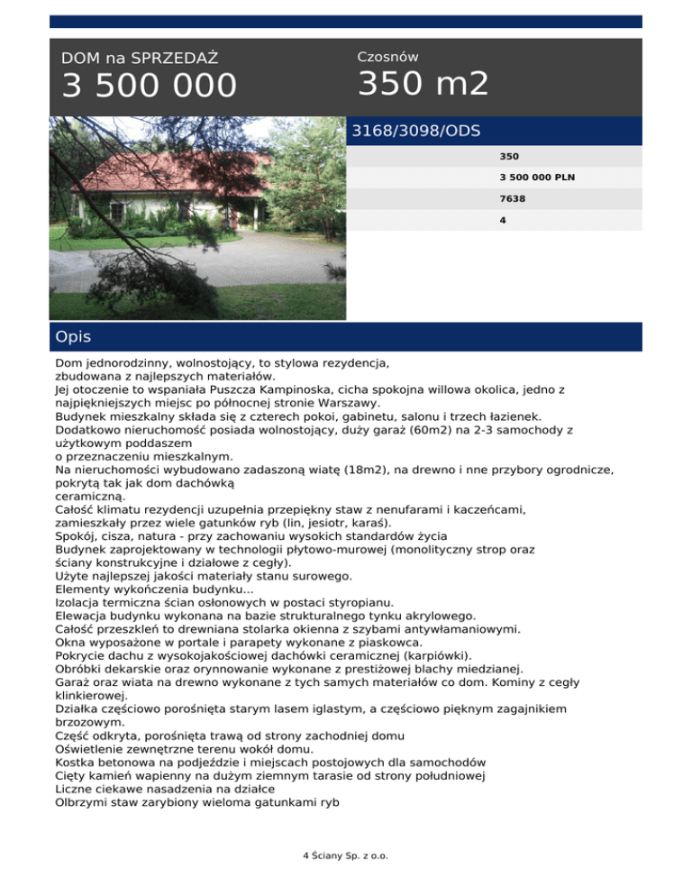 DOM na SPRZEDAŻ 3 500 000 Czosnów 350 m2 3168/3098/ODS 350 3 500 000 PLN 7638 4 Opis Dom jednorodzinny, wolnostojący, to stylowa rezydencja, zbudowana z najlepszych materiałów. Jej otoczenie to wspaniała Puszcza Kampinoska, cicha spokojna willowa okolica, jedno z najpiękniejszych miejsc po północnej stronie Warszawy. Budynek mieszkalny składa się z czterech pokoi, gabinetu, salonu i trzech łazienek. Dodatkowo nieruchomość posiada wolnostojący, duży garaż (60m2) na 2-3 samochody z użytkowym poddaszem o przeznaczeniu mieszkalnym. Na nieruchomości wybudowano zadaszoną wiatę (18m2), na drewno i nne przybory ogrodnicze, pokrytą tak jak dom dachówką ceramiczną. Całość klimatu rezydencji uzupełnia przepiękny staw z nenufarami i kaczeńcami, zamieszkały przez wiele gatunków ryb (lin, jesiotr, karaś). Spokój, cisza, natura - przy zachowaniu wysokich standardów życia Budynek zaprojektowany w technologii płytowo-murowej (monolityczny strop oraz ściany konstrukcyjne i działowe z cegły). Użyte najlepszej jakości materiały stanu surowego. Elementy wykończenia budynku... Izolacja termiczna ścian osłonowych w postaci styropianu. Elewacja budynku wykonana na bazie strukturalnego tynku akrylowego. Całość przeszkleń to drewniana stolarka okienna z szybami antywłamaniowymi. Okna wyposażone w portale i parapety wykonane z piaskowca. Pokrycie dachu z wysokojakościowej dachówki ceramicznej (karpiówki). Obróbki dekarskie oraz orynnowanie wykonane z prestiżowej blachy miedzianej. Garaż oraz wiata na drewno wykonane z tych samych materiałów co dom. Kominy z cegły klinkierowej. Działka częściowo porośnięta starym lasem iglastym, a częściowo pięknym zagajnikiem brzozowym. Część odkryta, porośnięta trawą od strony zachodniej domu Oświetlenie zewnętrzne terenu wokół domu. Kostka betonowa na podjeździe i miejscach postojowych dla samochodów Cięty kamień wapienny na dużym ziemnym tarasie od strony południowej Liczne ciekawe nasadzenia na działce Olbrzymi staw zarybiony wieloma gatunkami ryb 4 Ściany Sp. z o.o. Drewniany pomost przy stawie z drewna tekowego. ODLEGŁOŚĆ do granic Warszaway, to zaledwie 10 km, a do ścisłego centrum 24 km. Dogodny dojazd najszybszą drogą wylotową do i z Warszawy. Treść niniejszego ogłoszenia nie stanowi oferty handlowej w rozumieniu Kodeksu Cywilnego. Zamieszczona oferta nie stanowi oferty w rozumieniu Kodeksu Cywilnego. licencja 4355; Zapytaj naszego Agenta o pomoc w otrzymaniu kredytu !!! 4 Ściany Sp. z o.o. tel. 22 629 80 80 email: [email protected] 4 Ściany Sp. z o.o. Powered by TCPDF (www.tcpdf.org)