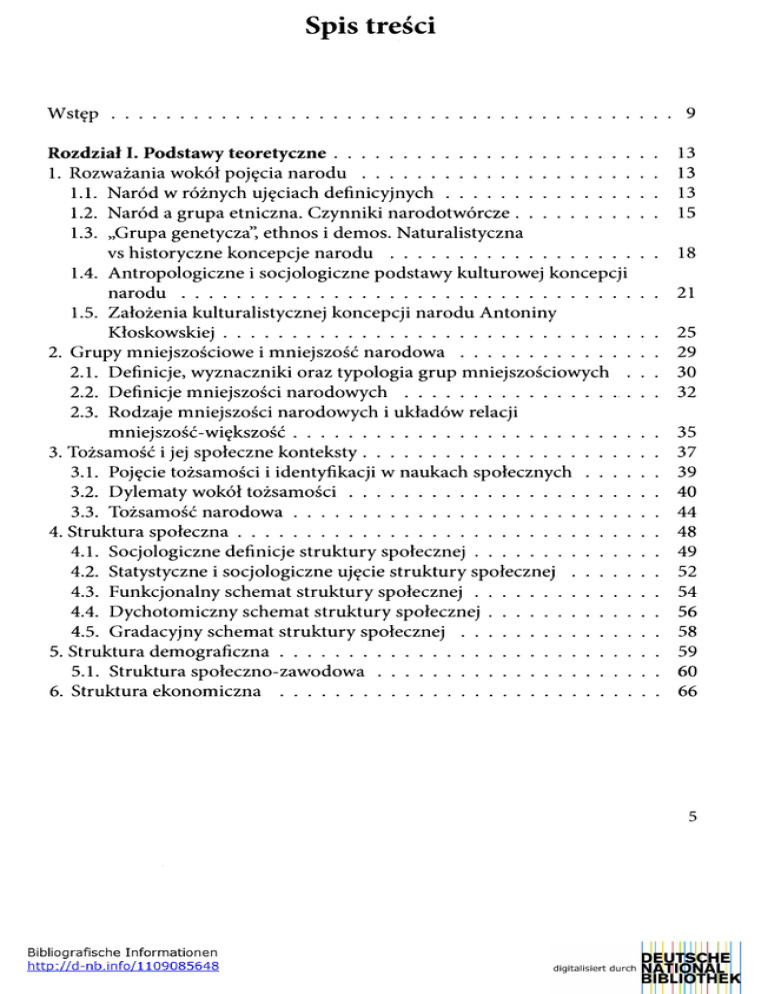 Spis treści W s tę p ................................................................................................................... 9 Rozdział 1· Podstawy teoretyczne.................................................................. 1. Rozważania wokół pojęcia n a r o d u ............................................................ 1.1. Naród w rożnych ujęciach definicyjnych........................................... 1.2· Naród a grupa etniczna. Czynniki narodotworcze . . . . . . . . . . . 1.3. ״Grupa genetycza״, ethnos i demos. Naturalistyczna vs historyczne koncepcje n a r o d u ....................................................... 1.4. Antropologiczne i socjologiczne podstawy kulturowej koncepcji n a r o d u .................................................................................................. 1.5. Założenia kulturalistycznej koncepcji narodu Antoniny Kłoskowskiej......................................................................................... 2. Grupy mniejszościowe i mniejszość n a ro d o w a ........................................ 2.1. Definicje, ^ zn aczn ik i oraz typologia grup mniejszościowe^ . . . 2.2. Definicje mniejszości n a ro d o w y c h ............................................. 2.3· Rodzaje mniejszości narodowych i układów relacji mniejszośc-większosc........................................................................... 3. Tożsamość 1 jej społeczne konteksty............................................................ 3.1. Pojęcie toZsamoscii identyfikacji w naukach społecznych . . . . . . 3.2. Dylematy wokół tożsam ości............................................................... 3.3. Tożsamość n arodow a........................................................................... 4. Struktura społeczna...................................................................................... 4.1. Socjologiczne definicje struktury społecznej..................................... 4.2. Statystyczne i socjologiczne ujęcie struktury społecznej . . . . . . . 4.3. Funkcjonalny schemat struktury społecznej..................................... 4.4. Dychotomiczny schemat struktury społecznej................................... 4.5. Gradacyjny schemat struktury sp o łe c z n e j........................................ 5· Struktura dem ograficzna.............................................................................. 5.1. Struktura społeczno-zawodowa........................................................ 6. Struktura ekonomiczna .............................................................................. 13 13 13 15 18 21 25 29 30 32 35 37 39 40 44 48 49 52 54 56 58 59 60 66 Rozdział II. Ludnosc niemiecka na Dolnym Slạsku w latach 1945-2012. Rys h isto r y c z n y ........................................................................ 67 1. Polityczno-prawny i społeczny aspekt położenia Niemców w latach 1945-2012 . ........................................................................... . . . . . 67 1.1. Niemcy na Dolnym ắlạsku w latach 1945-1949 . . . . . . . . . . . . 67 1.2. Układ zgorzelecki z 1950 roku i jego znaczenie dla położenia Niemców na Dolnym Ś ląsku............................................................... 73 1.3. Odwilż polityczna 1956-1958 i walka Niemców o przyznanie im s w o b ó d ..................................................................... 79 1.4· Lata stagnacji 1959-1988 ..................................................................... 84 1.5. Rok 1989 - rozkwit działalności towarzystw mniejszości niemieckiej na Dolnym Śląsku............................................................ 93 1.6. Ochrona prawna mniejszoSci narodowych w Polsce w latach 1945-2012 ............................................................................................ 117 1.7· Stan obecny towarzystw mniejszości niemieckiej Dolnego śląska oraz przyjęta strategia rozwo^^.............................................................. 121 2. Szkolnictwo n ie m ie c k ie ................................................................................128 2.1. Tajne nauczanie do 1950 r o k u .............................................................. 128 2.2. Działalność szkół niemieckich wiatach 1950-1963 . . . . . . . . . . 130 2.3· Nowy początek w nauczaniu z )·؟Zykiem niemieckim po 1989 r o k u ........................................................................................... 132 3. Obecność Niemców w życiu kulturalnym oraz w mediach . . . . . . . . . 133 3.1· DzialalnośC kulturalna Niemców wiatach 1950-1958 . . . . . . . . 133 3.2· Prasa niemieckojęzyczna w latach 1951—1 9 5 8 .....................................136 3.3. Reaktywacja działalności kulturalnej towarzystw niemieckich po roku 1989 ......................................................................................... 138 3.4. MniejszoSC niemiecka Dolnego Śląska we współczesnych mediach ................................................................................................. 144 4. Opieka duszpasterska nad ludnością niemiecką na Dolnym Śląsku 1945-2012 ....................................................... . . . . . . . . . . . . . . . . 148 4.1· Duszpasterstwo KoScioJa Ewangelicko-Augsburskiego . . . . . . . . 148 4.2· Katolickie duszpasterstwo N ie m c ó w ................................................... 150 Rozdział III. Założenia metodologiczne badań własnych . . . . . . . . . . 153 1. Problematyka badań ......................................................................................153 1.1· Rodzaj podejmowanych problemów i przyczyny badań . . . . . . . 153 1.2· Układ i hierarchia problemów badawczych ....................................... 154 1.3. Próbne rozwiązania problemów badawczych w formie hipotez . . . 155 2. Przedmiot i metody badań, narzędzia badawcze, dobór próby . . . . . . . 162 2.