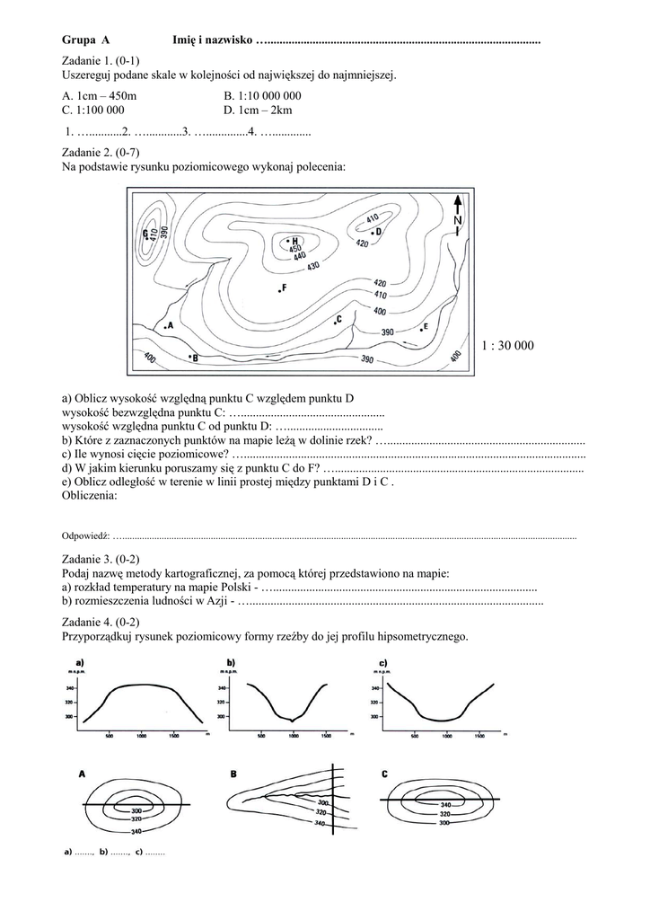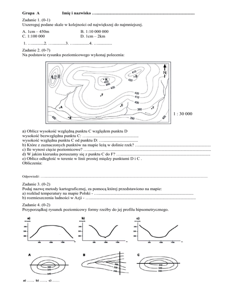 Grupa A Imię i nazwisko …........................................................................................... Zadanie 1. (0-1) Uszereguj podane skale w kolejności od największej do najmniejszej. A. 1cm – 450m C. 1:100 000 B. 1:10 000 000 D. 1cm – 2km 1. …...........2. …............3. …..............4. …............. Zadanie 2. (0-7) Na podstawie rysunku poziomicowego wykonaj polecenia: 1 : 30 000 a) Oblicz wysokość względną punktu C względem punktu D wysokość bezwzględna punktu C: …................................................ wysokość względna punktu C od punktu D: …................................ b) Które z zaznaczonych punktów na mapie leŜą w dolinie rzek? ….................................................................. c) Ile wynosi cięcie poziomicowe? ….................................................................................................................. d) W jakim kierunku poruszamy się z punktu C do F? …................................................................................... e) Oblicz odległość w terenie w linii prostej między punktami D i C . Obliczenia: Odpowiedź: …......................................................................................................................................................................................... Zadanie 3. (0-2) Podaj nazwę metody kartograficznej, za pomocą której przedstawiono na mapie: a) rozkład temperatury na mapie Polski - …........................................................................................ b) rozmieszczenia ludności w Azji - ….................................................................................................. Zadanie 4. (0-2) Przyporządkuj rysunek poziomicowy formy rzeźby do jej profilu hipsometrycznego. Grupa B Imię i nazwisko …........................................................................................ Zadanie 1. (0-1) Uszereguj podane skale w kolejności od najmniejszej do największej. A. 1:300 000 B. 1cm-50m C. 1:1000 000 D. 1cm-100m 1. …...........2. …........3. ….........4. …......... Zadanie 2. (0-7) Na podstawie rysunku poziomicowego wykonaj polecenia: 1: 20 000 a) Oblicz wysokość względną punktu F względem punktu D wysokość bezwzględna punktu F: …............................ wysokość względna punktu F od D:.............................. b) Wybierz punkty, którymi oznaczono najdogodniejsze miejsca do lokalizacji miejsca obserwacji :................ c) Ile wynosi cięcie poziomicowe?....................................................................................................................... d) W jakim kierunku poruszamy się z punktu F do punktu C? …....................................................................... e) Oblicz odległość w terenie w linii prostej między punktami F i G. Obliczenia: Odpowiedź: …..................................................................................................................................................... Zadanie 3. (0-2) Podaj nazwę metody kartograficznej, za pomocą której przedstawiono na mapie: a)zróŜnicowanie głębokości Morza Bałtyckiego: ….............................................................. b)gęstość zaludnienia województw w Polsce: …..................................................................... Zadanie 4. (0-2) Przyporządkuj rysunek poziomicowy formy rzeźby do jej profilu hipsometrycznego. Schemat oceniania test – rysunek poziomicowy L.p. Grupa A Grupa B Kryterium punktacji Punkty 1 A,C,D,B C,A,D,B 1 pkt za poprawne uporządkowanie 0-1 2 a) wysokość bezwzględna: 395 m n.p.m. wysokość względna: 20 m a) wysokość bezwzględna: 425 m n.p.m. wysokość względna: 10 m 0-7 b) E,B,A b) H,G c) 10 m c) 10 m d) NW d) SE e) 1:30 000 1 cm – 300 m 3,1 cm – x x= 930 m e) 1:20 000 1 cm – 200 m 4,4 cm – x x = 880 m a) po 1 pkt za wpisanie poprawnej wysokości bezwzględnej i względnej b) 1 pkt za podanie wszystkich punktów c) 1 pkt za wpisanie poprawnej wartości d) 1 pkt za podanie poprawnego kierunku e) 2 pkt za poprawne obliczenia i wynik 1 pkt za poprawne obliczenia 3 a)izotermy b)kropkowa a)izobaty b)kartogram po 1 pkt poprawną metodę 0-2 4 a) C b) B c) A a) C b) B 2 pkt za trzy poprawne przyporządkowania 1 pkt za dwa poprawne przypoprządkowania 0-2 c) A