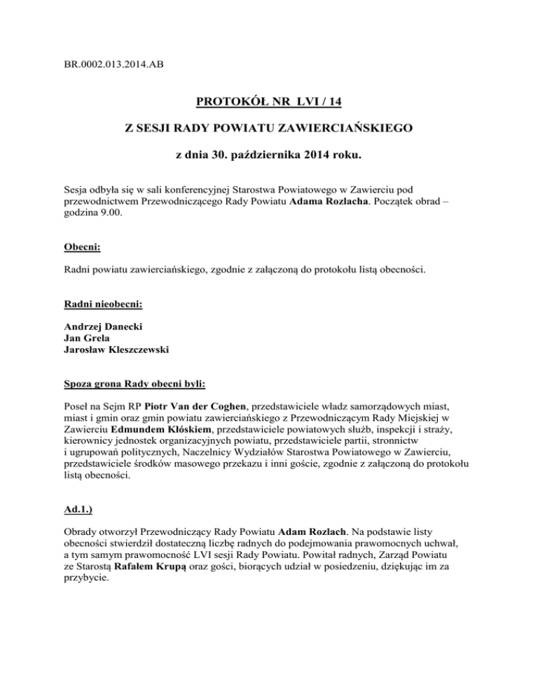 BR.0002.013.2014.AB PROTOKÓŁ NR LVI / 14 Z SESJI RADY POWIATU ZAWIERCIAŃSKIEGO z dnia 30. października 2014 roku. Sesja odbyła się w sali konferencyjnej Starostwa Powiatowego w Zawierciu pod przewodnictwem Przewodniczącego Rady Powiatu Adama Rozlacha. Początek obrad – godzina 9.00. Obecni: Radni powiatu zawierciańskiego, zgodnie z załączoną do protokołu listą obecności. Radni nieobecni: Andrzej Danecki Jan Grela Jarosław Kleszczewski Spoza grona Rady obecni byli: Poseł na Sejm RP Piotr Van der Coghen, przedstawiciele władz samorządowych miast, miast i gmin oraz gmin powiatu zawierciańskiego z Przewodniczącym Rady Miejskiej w Zawierciu Edmundem Kłóskiem, przedstawiciele powiatowych służb, inspekcji i straży, kierownicy jednostek organizacyjnych powiatu, przedstawiciele partii, stronnictw i ugrupowań politycznych, Naczelnicy Wydziałów Starostwa Powiatowego w Zawierciu, przedstawiciele środków masowego przekazu i inni goście, zgodnie z załączoną do protokołu listą obecności. Ad.1.) Obrady otworzył Przewodniczący Rady Powiatu Adam Rozlach. Na podstawie listy obecności stwierdził dostateczną liczbę radnych do podejmowania prawomocnych uchwał, a tym samym prawomocność LVI sesji Rady Powiatu. Powitał radnych, Zarząd Powiatu ze Starostą Rafałem Krupą oraz gości, biorących udział w posiedzeniu, dziękując im za przybycie. 2 Ad.2.) Radni nie zgłosili uwag do przekazanego w materiałach sesyjnych porządku obrad sesji. Realizując ustawowy obowiązek organizowania pracy Rady i korzystając z przysługującej mu inicjatywy uchwałodawczej Przewodniczący Rady Powiatu Adam Rozlach złożył wniosek o rozszerzenie porządku obrad o pkt w brzmieniu: „Rozpatrzenie projektu uchwały w sprawie odstąpienia od przeprowadzenia kontroli Komisji Rewizyjnej w miesiącu listopadzie 2014 roku”; Ze względu na zakończenie obecnej kadencji Rady Powiatu i wyznaczenie terminu wyborów samorządowych na dzień 16 listopada 2014 roku nie ma możliwości zrealizowania planu kontroli Komisji w ww. zakresie. „Rozpatrzenie projektu uchwały w sprawie rozpatrzenia skargi na Powiatowego Inspektora Nadzoru Budowlanego w Zawierciu”; „Rozpatrzenie projektu uchwały rozpatrzenia skargi na Dyrektora Zespołu Szkół im. prof. R. Gostkowskiego w Łazach”. Wprowadzenie powyższych uchwał pod obrady Rady Powiatu w dniu dzisiejszym związany jest z koniecznością zachowania ustawowych terminów dotyczących rozpatrywania skarg wpływających do Rady Powiatu. W wyniku przeprowadzonego głosowania powyższy wniosek został przyjęty jednogłośnie, czyli przy 21 głosach „za”. Projekty uchwał zostały przekazane radnym przed rozpoczęciem obrad. Przewodniczący Rady Powiatu Adam Rozlach zdecydował, że projekty uchwał, o które rozszerzony został porządek posiedzenia, rozpatrywane będą w pkt 33 – 35 porządku obrad. Tym samym kolejność pozostałych punktów porządku obrad zmienia się odpowiednio. Porządek obrad sesji po zmianach przedstawiał się następująco: 1. 2. 3. 4. 5. 6. Otwarcie sesji i stwierdzenie jej prawomocności. Zgłaszanie uwag do porządku obrad. Przyjęcie protokołu Nr LV / 14 z dnia 25 września 2014 roku. Sprawozdanie Starosty z działalności Zarządu Powiatu w okresie od poprzedniej sesji. Interpelacje i zapytania radnych. Rozpatrzenie projektu uchwały w sprawie zmiany Uchwały Nr XLIV / 560 / 13 z dnia 23 grudnia 2013 roku w sprawie ustalenia terminów sesji i uchwalenia planu pracy Rady Powiatu na 2014 rok. 7. Rozpatrzenie projektu uchwały w sprawie zmiany Uchwały Nr XLIV / 561 / 13 z dnia 23 grudnia 2013 roku w sprawie zatwierdzenia planów pracy stałych Komisji Rady Powiatu Zawierciańskiego na 2014 rok. 8. Rozpatrzenie projektu uchwały w sprawie zmiany Uchwały Nr LII / 636 / 14 z dnia 26 czerwca 2014 roku w sprawie likwidacji Technikum Uzupełniającego dla Dorosłych Nr 1 w Zawierciu. 9. Rozpatrzenie projektu uchwały w sprawie przyjęcia informacji o realizacji zadań oświatowych w powiecie zawierciańskim w roku szkolnym 2013 / 2014. 10. Rozpatrzenie projektu uchwały w sprawie przyjęcia „Raportu z monitoringu Strategii Integracji i Rozwiązywania Problemów Społecznych Powiatu Zawierciańskiego na lata 2011 – 2020”. 3 11. Rozpatrzenie projektu uchwały w sprawie ustalenia wysokości opłat za usunięcie pojazdów z drogi na obszarze powiatu zawierciańskiego i ich parkowanie na parkingach strzeżonych oraz wysokości kosztów powstałych w razie odstąpienia od usunięcia pojazdu. 12. Rozpatrzenie projektu uchwały w sprawie przyjęcia stanowiska popierającego działania mające na celu zahamowanie wypływu środków finansowych wypracowanych w regionie do budżetu centralnego oraz zwiększenie dochodów jednostek samorządu terytorialnego. 13. Rozpatrzenie projektu uchwały w sprawie zmiany Uchwały Nr XLVI / 583 / 14 z dnia 27 lutego 2014 roku w sprawie ustalenia zadań i wysokości środków Państwowego Funduszu Rehabilitacji Osób Niepełnosprawnych na realizację zadań powiatu zawierciańskiego w 2014 roku z zakresu rehabilitacji zawodowej i społecznej osób niepełnosprawnych. 14. Rozpatrzenie projektu uchwały w sprawie wprowadzenia zmian do Statutu Szpitala Powiatowego w Zawierciu. 15. Rozpatrzenie projektu uchwały w sprawie wprowadzenia zmian do Statutu Szpitala Powiatowego w Zawierciu. 16. Rozpatrzenie projektu uchwały w sprawie wprowadzenia zmian do Statutu Szpitala Powiatowego w Zawierciu. 17. Rozpatrzenie projektu uchwały w sprawie wprowadzenia zmian do Statutu Szpitala Powiatowego w Zawierciu. 18. Rozpatrzenie projektu uchwały w sprawie wprowadzenia zmian do Statutu Szpitala Powiatowego w Zawierciu. 19. Rozpatrzenie projektu uchwały w sprawie wprowadzenia zmian do Statutu Szpitala Powiatowego w Zawierciu. 20. Rozpatrzenie projektu uchwały w sprawie wprowadzenia zmian do Statutu Szpitala Powiatowego w Zawierciu. 21. Rozpatrzenie projektu uchwały w sprawie wprowadzenia zmia