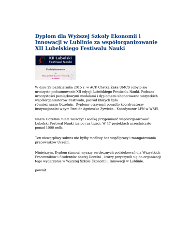Dyplom dla Wyższej Szkoły Ekonomii i Innowacji w Lublinie za współorganizowanie XII Lubelskiego Festiwalu Nauki W dniu 29 października 2015 r. w ACK Chatka Żaka UMCS odbyło się uroczyste podsumowanie XII edycji Lubelskiego Festiwalu Nauki. Podczas uroczystości pamiątkowymi medalami i dyplomami uhonorowano wszystkich współorganizatorów Festiwalu, pośród których była również nasza Uczelnia. Dyplomy otrzymali ponadto koordynatorzy instytucjonalni w tym Pani dr Agnieszka Żywicka - Koordynator LFN w WSEI. Nasza Uczelnia miała zaszczyt i wielką przyjemność współorganizować Lubelski Festiwal Nauki juz po raz trzeci. W 47 projektach uczestniczyło ponad 1000 osób. Ten niewątpliwy sukces nie byłby możliwy bez współpracy i zaangażowania pracowników Uczelni. Niniejszym, Dyplom stanowi wyrazy serdecznych podziękowań dla Wszystkich Pracowników i Studentów naszej Uczelni , którzy przyczynili się do organizacji tego wydarzenia w Wyższej Szkole Ekonomii i Innowacji w Lublinie. powrót