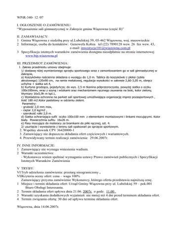 WPiR-340- 12 /07 I. OGŁOSZENIE O ZAMÓWIENIU: “Wyposażenie sali gimnastycznej w Zakręcie gmina Wiązowna (część II)” II. ZAMAWIAJĄCY: 1 Gmina Wiązowna z siedzibą przy ul.Lubelskiej 59, 05-462 Wiązowna, woj. mazowieckie 2 Informacje, osoba do kontaktów: Genowefa Kobza tel (22) 7890128 wew. 26 fax wew. 43, e-mail: [email protected] 3 Specyfikacja istotnych warunków zamówienia dostępna nieodpłatnie na stronie internetowej www.bip.wiazowna.pl III. PRZEDMIOT ZAMÓWIENIA: 1. Zakres przedmiotu umowy obejmuje: 1/ dostawę niżej wymienionego sprzętu sportowego wraz z zamontowaniem go w sali gimnastycznej w Zakręcie, a) Koszykówka naścienna składana o wysięgu do 1,0 m. Tablica do koszykówki z pleksi (szkła akrylowego) 120x90 cm, na ramie metalowej, regulacja wysokości w zakresie 2,60-3,05 m, obręcz uchylna + siatka szt.4, b) Kurtyna grodząca, pojedyńcza; do wys. 2,5 m tkanina półprzezroczysta, powyżej siatka o oczku 100x100mm, wraz z szyną i wózkami oraz mechanizmem ręcznego zsuwania na boki, kolor zielony, Wymiary 16x5,9h m kpl.1, c) Wykładzina ochronna na parkiet sali sportowej umożliwiająca organizację imprez pozasportowych , ilość 180 m2.Kolor pastelowy w odcieniu zieleni. Parametry: - grubość 2,0 mm max, - ciężar 2,0 kg/m2 , - szerokość rolki 2,0 m. d) Siatka ochraniająca sufit oczko 100x100 mm z elementami montażowymi i linkami mocującymi. Kolor biały. Powierzchnia sufitu 16x26 m. e) Pasy mocujące do materacy za bramkami do piłki ręcznej, szt. 4. 2/ usunięcie i wywiezienie z terenu sali opakowań po sprzęcie sportowym. 2. Wspólny słownik CPV 36420000-1 3. Zamawiający nie dopuszcza składania ofert częściowych i wariantowych. 4. Przewidywany termin realizacji zamówienia: 29.06.2007r. IV. INNE INFORMACJE: 1 Zamawiający nie wymaga wniesienia wadium. 2 Warunki uczestnictwa: - Wykonawca winien spełniać wymagania ustawy Prawo zamówień publicznych i Specyfikacji Istotnych Warunków Zamówienia V TRYBY: VI Tryb udzielenia zamówienia: przetarg nieograniczony , VIIKryteria oceny ofert: cena – waga 100% Zamawiający przyzna zamówienie Wykonawcy, którego oferta przedstawia najniższą cenę. 1 Miejsce i termin składania ofert: Urząd Gminy Wiązowna przy ul. Lubelskiej 59 – pok.001 Biuro Obsługi Interesanta. 2 Termin składania ofert upływa dnia 21.06. 2007r. o godz. 11.00 . 3 Warunki uzyskania dodatkowych wyjaśnień: nie mniej niż 4 dni przed terminem składania ofert. 4 Termin związania ofertą: 30 dni od upływu terminu składania ofert. Wiązowna, dnia 14.06.2007r.