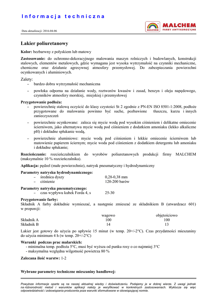 Informacja techniczna Data aktualizacji: 2016-04-06 Lakier poliuretanowy Kolor: bezbarwny z połyskiem lub matowy Zastosowanie: do ochronno-dekoracyjnego malowania maszyn rolniczych i budowlanych, konstrukcji stalowych, elementów metalowych, gdzie wymagana jest wysoka wytrzymałość na czynniki mechaniczne, chemiczne oraz działanie agresywnej atmosfery przemysłowej. Do zabezpieczania powierzchni ocynkowanych i aluminiowych. Zalety: – bardzo dobra wytrzymałość mechaniczna – powłoka odporna na działanie wody, roztworów kwasów i zasad, benzyn i oleju napędowego, czynników atmosfery morskiej, miejskiej i przemysłowej Przygotowanie podłoża: – powierzchnię stalową oczyścić do klasy czystości St 2 zgodnie z PN-EN ISO 8501-1:2008, podłoże przygotowane do malowania powinno być suche, pozbawione tłuszczu, kurzu i innych zanieczyszczeń – powierzchnie ocynkowane: zaleca się mycie wodą pod wysokim ciśnieniem i delikatne omiecenie ścierniwem, jako alternatywa mycie wodą pod ciśnieniem z dodatkiem amoniaku (lekko alkaliczne pH) i dokładne spłukanie wodą, – powierzchnie aluminiowe: mycie wodą pod ciśnieniem i lekkie omiecenie ścierniwem lub matowienie papierem ściernym; mycie woda pod ciśnieniem z dodatkiem detergentu lub amoniaku i dokładne spłukanie; Rozcieńczanie: rozcieńczalnikiem do (maksymalnie 10 % rozcieńczalnika). wyrobów poliuretanowych produkcji firmy MALCHEM Aplikacja: pędzel (małe powierzchnie), natrysk pneumatyczny i hydrodynamiczny Parametry natrysku hydrodynamicznego: – średnica dyszy – ciśnienie 0,28-0,38 mm 120-200 barów Parametry natrysku pneumatycznego: – czas wypływu kubek Forda 4, s 25-30 Przygotowanie farby: Składnik A farby dokładnie wymieszać, a następnie zmieszać ze składnikiem B (utwardzacz 601) w proporcji: Składnik A Składnik B wagowo 100 14 objętościowo 100 13 Lakier jest gotowy do użycia po upływie 15 minut (w temp. 20+/-2°C). Czas przydatności mieszaniny do użycia minimum 4 h (w temp. 20+/-2°C) Warunki podczas prac malarskich: - minimalna temp. podłoża 5°C, musi być wyższa od punku rosy o co najmniej 3°C - maksymalna względna wilgotność powietrza 80 % Zalecana ilość warstw: 1-2 Wybrane parametry techniczne mieszaniny handlowej: Powyższe informacje oparte są na naszej aktualnej wiedzy i doświadczeniu. Podajemy je w dobrej wierze. Z uwagi jednak na różnorodność metod i warunków aplikacji należy je weryfikować w konkretnych zastosowaniach. Wyklucza się więc odpowiedzialność i zobowiązania producenta poza warunki sformułowane w obowiązującej normie. Informacja techniczna Data aktualizacji: 2016-04-06 gęstość, g/cm3 LZO, g/l zawartość rozpuszczalników (około), % wag. zawartość substancji nielotnych (około), % obj temperatura zapłonu, oC, nie mniej niż zalecana grubość warstwy, µm (“na mokro”) zalecana grubość powłoki, µm (”na sucho”) zużycie teoretyczne, dm3/m2 zużycie teoretyczne, kg /m2 Czas wysychania (w temp. 20+/-2°C i wilgotności względnej 55+/-5%) - stopień 1, h - stopień 3, h - całkowite wyschnięcie, h do nałożenia kolejnych warstw - najkrótszy , h - najdłuższy, dni 1,05 660 57 51 21 50 25 0,05 0,05 1 3,5 168 1 7 Podane parametry mogą ulec zmianie wraz ze zmianą warunków otoczenia, ilości i grubości warstw. Przechowywanie: w zamkniętych pojemnikach z dala od ognia i źródeł ciepła. Chronić dzieci przed dostępem do wyrobu. Temperatura przechowywania od 5°C do 30 °C. Powyższe informacje oparte są na naszej aktualnej wiedzy i doświadczeniu. Podajemy je w dobrej wierze. Z uwagi jednak na różnorodność metod i warunków aplikacji należy je weryfikować w konkretnych zastosowaniach. Wyklucza się więc odpowiedzialność i zobowiązania producenta poza warunki sformułowane w obowiązującej normie.