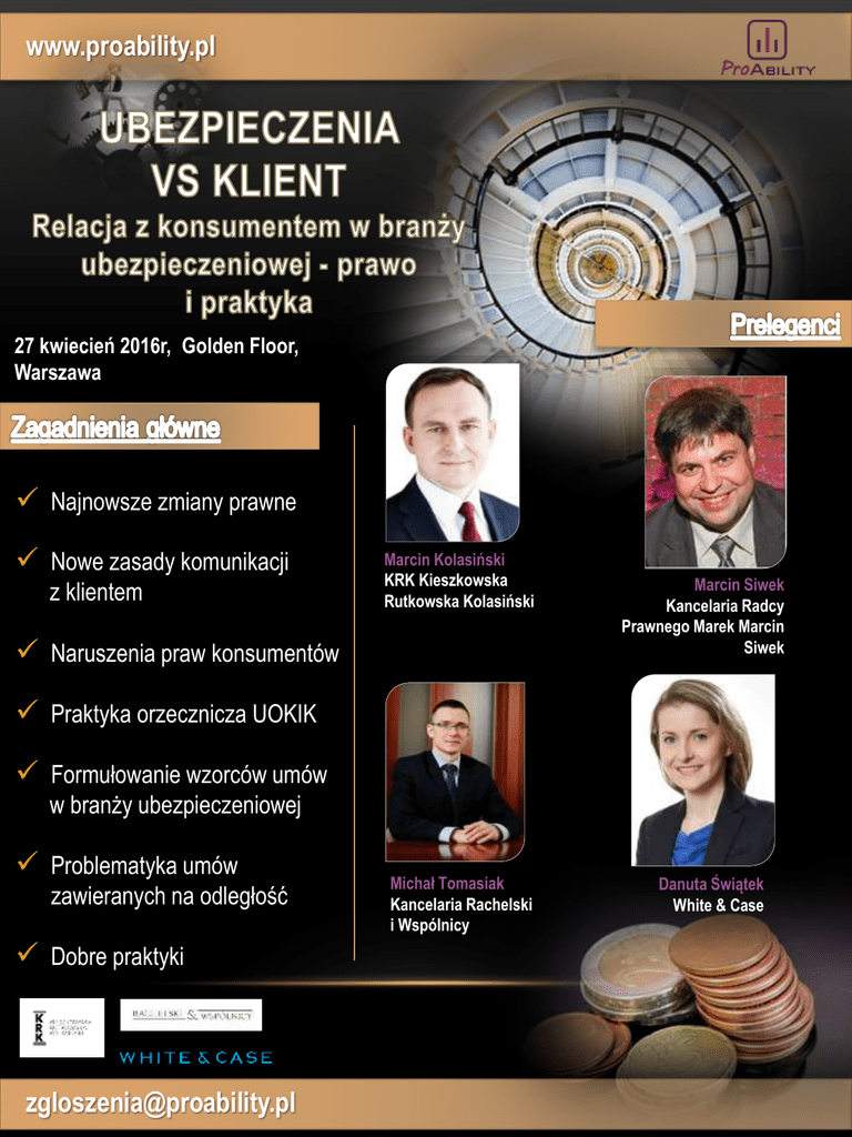 www.proability.pl 27 kwiecień 2016r, Golden Floor, Warszawa Najnowsze zmiany prawne Nowe zasady komunikacji z klientem Marcin Kolasiński KRK Kieszkowska Rutkowska Kolasiński Naruszenia praw konsumentów Marcin Siwek Kancelaria Radcy Prawnego Marek Marcin Siwek Praktyka orzecznicza UOKIK Formułowanie wzorców umów w branży ubezpieczeniowej Problematyka umów zawieranych na odległość Dobre praktyki [email protected] Michał Tomasiak Kancelaria Rachelski i Wspólnicy Danuta Świątek White & Case www.proability.pl 27 kwiecień 2016r, Golden Floor, Warszawa 9:00 – Rejestracja i poranna kawa 9:30 – Zmiany prawne dla Branży Ubezpieczeniowej – relacje z konsumentem w praktyce • Ustawa o Działalności ubezpieczeniowej i Reasekuracyjnej i jej wpływ na Ubezpieczenia • Dyrektywa IDD i jej wpływ na Ubezpieczenia • Ustawa o Prawach Konsumenta – w jakim zakresie dotyczy branży ubezpieczeniowej • Nowe zasady komunikacji z konsumentami • Obowiązek informacyjny w praktyce • Uporządkowanie i podsumowanie wiążących przepisów Marcin Siwek, Radca Prawny, Kancelaria Radcy Prawnego Marek Marcin Siwek 10:45 – Przerwa kawowa 11:10 - Naruszenia praw konsumentów na rynku ubezpieczeń w praktyce orzeczniczej Prezesa UOKIK • Działania Prezesa UOKIK w zakresie ochrony konsumentów (naruszenia zbiorowych interesów konsumentów, klauzule abuzywne, raporty rynkowe) • Model przeciętnego konsumenta usług ubezpieczeniowych w orzecznictwie Prezesa UOKIK • Case study – przykłady decyzji Prezesa UOKIK dot. ochrony konsumentów w sektorze ubezpieczeniowym • Najbardziej problemowe orzecznictwo dla Ubezpieczeń Michał Tomasiak, Radca Prawny w kancelarii Rachelski i Wspólnicy [email protected] 12:30 - Jak rzetelnie formułować regulaminy i wzorce umów w branży ubezpieczeniowej • Klauzule abuzywne w Ubezpieczeniach – przegląd i omówienie najbardziej problemowych klauzul • Umowy a orzecznictwo UOKiK • Nowa forma umowy ubezpieczeniowej w praktyce • Zmiana wzorca umownego • Prawidłowe funkcjonowanie regulaminów • Dobre praktyki Danuta Świątek, Radca Prawnym w Dziale Postępowań Sądowych i Arbitrażowych, White & Case 14:00 – Lunch 14:45 – Umowy zawierane na odległość w Branży Ubezpieczeniowej – zmiany i istniejące problemy • Trudności i następstwa zawierania umów na odległość • Charakterystyka relacji/ wątpliwości/ zastrzeżenia • Praktyczne problemy umów poza lokalem • Na co należy zwrócić szczególną uwagę Marcin Kolasiński , Radca Prawny, Wspólnik KRK Kieszkowska Rutkowska Kolasiński 16:00 – Zakończenie warsztatów. Wręczenie certyfikatów www.proability.pl 27 kwiecień 2016r, Golden Floor, Warszawa Marcin Kolasiński, Radca Prawny, Wspólnik, KRK Kieszkowska Rutkowska Kolasiński Marcin Kolasiński posiada bogate doświadczenie szczególnie w kwestiach związanych z ochroną konkurencji i konsumentów, zwalczeniem nieuczciwej konkurencji, zamówieniami publicznymi, compliance, bezpieczeństwem produktów, rozwiązaniami prawnymi sektorów regulowanych oraz doradztwem korporacyjnym. Pracował w Urzędzie Komitetu Integracji Europejskiej, gdzie uczestniczył w procesie tworzenia ustaw implementujących do polskiego porządku prawnego rozwiązania prawa unijnego. Następnie pracował w Urzędzie Ochrony Konkurencji i Konsumentów, gdzie pełnił funkcję zastępcy dyrektora Departamentu Ochrony Konkurencji. W tym czasie odbył staż w Dyrektoriacie ds. Konkurencji Komisji Europejskiej. Następnie przez ponad osiem lat pracował w kancelarii Baker & McKenzie, gdzie jako partner, szef praktyki prawa konkurencji i regulacji, reprezentował klientów w postępowaniach m.in. przed Prezesem UOKiK, Komisją Europejską oraz polskimi i unijnymi sądami. Marcin Kolasiński jest członkiem Stowarzyszenia Prawa Konkurencji, Polskiego Stowarzyszenia Ekonomicznej Analizy Prawa oraz Centrum Studiów Antymonopolowych i Regulacyjnych. Pełni także funkcję pozarządowego doradcy w ramach Międzynarodowej Sieci Konkurencji - International Competition Network. Marcin Kolasiński jest współautorem komentarza pod redakcją prof. Tadeusza Skocznego do ustawy o ochronie konkurencji i konsumentów wydawnictwa C.H. Beck, a także autorem licznych publikacji w prasie codziennej, wydawnictwach branżowych i specjalistycznych czasopismach prawniczych. Marcin Siwek, Radca Prawny, Kancelaria Radcy Prawnego Marek Marcin Siwek Legitymujący się ponad 10-letnim doświadczeniem zdobytym jako prawnik in-house w zakładach ubezpieczeń majątkowych i życiowych. Własna praktyka prawnicza z bogatym doświadczeniem procesowym z zakresu sporów pomiędzy konsumentami i instytucjami finansowymi. Wsparcie prawne projektów IT, własności intelektualnej i ochrony danych osobowych. Wsparcie prawne podmiotów rynku budowlanego. Danuta Świątek jest radcą prawnym w Dziale Postępowań Sądowych i Arbitrażowych. Kancelaria White & Case Koncentruje się na zagadnieniach prawa ubezpieczeniowego zarówno w zakresie regulacyjnym, jak i cywilno-procesowym. Doradza zakładom ubezpieczeń odnośnie zasadności roszczeń ubezpieczeniowych podnoszonych przez ubezpieczonych na postawie rozmaitych umów ubezpieczenia (D&O, PI, majątkowych) oraz zasadności roszczeń regresowych przysługujących ubezpieczycielom, reprezentuje zakłady ubezpieczeń na etapie postępowań likwidacyjnych oraz sądowych dotyczących roszczeń ubezpieczeniowych. Ma ona znaczące doświadczenie w opiniowaniu zgodności produktów ubezpieczeniowych z prawem polskim, w szczególności z wymaganiami w zakresie ochrony konsumentów. Brała udział w procesach restrukturyzacji oddziałów zagranicznych zakładów ubezpieczeń, jak również doradzała ubezpieczycielom w zakresie outsourcingu usług ubezpieczeniowych, transgranicznego przenoszenia portfela ubezpieczeń, sprzedaży wierzytelności ubezpieczeniowych, tajemnicy ubezpieczeniowej. Jej doświadczenie obejmuje także reprez