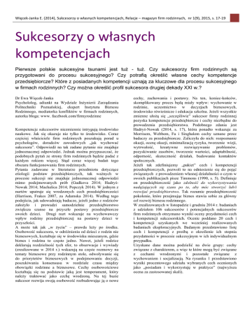 Więcek-‐Janka E. (2014), Sukcesorzy o własnych kompetencjach, Relacje – magazyn firm rodzinnych, nr 1(9), 2015, s. 17-‐19 Sukcesorzy o własnych kompetencjach Pierwsze polskie sukcesyjne tsunami jest tuż - tuż. Czy sukcesorzy firm rodzinnych są przygotowani do procesu sukcesyjnego? Czy potrafią określić własne cechy kompetencje przedsiębiorcze? Które z posiadanych kompetencji uznają za kluczowe dla procesu sukcesyjnego w firmach rodzinnych? Czy można określić profil sukcesora drugiej dekady XXI w.? Dr Ewa Więcek-Janka Psychololog, adiunkt na Wydziale Inżynierii Zarządzania Politechniki Poznańskiej, ekspert Instytutu Biznesu Rodzinnego, mediatorka konfliktów w firmach rodzinnych, autorka bloga: www. facebook.com/firmyrodzinne Kompetencje sukcesorów niezmiennie intrygują środowisko naukowe. Jak się okazuje nie tylko to środowisko. Coraz częściej właściciele firm rodzinnych poszukują porad u psychologów, doradców zawodowych „jak wychować sukcesora”. Odpowiedź na tak zadane pytanie nie znajduje jednoznacznej odpowiedzi. Jednak można przypuszczać, że podobnych pytań ze strony firm rodzinnych będzie padać z każdym rokiem więcej. Stąd coraz więcej badań tego obszaru funkcjonowania firm rodzinnych. Pytania zadawane w literaturze przedmiotu dotyczące etiologii podstaw przedsiębiorczych, tak ważnych w procesie sukcesji nie znajduje jednoznacznej odpowiedzi mimo podejmowanych prób (Gudkova 2014; HadryśNowak 2014; Machalica 2014; Popczyk 2014). W jednym z nurtów upatruje się wrodzonych cech przedsiębiorczości (Harrison, Frakes 2007, za Adamska 2014). Według tego podejścia, jak udowadniają badacze, jeżeli jedno z rodziców założyło i prowadzi samodzielnie przedsiębiorstwo zwiększa szanse na przyszłe postawy przedsiębiorcze swoich dzieci. Drugi nurt wskazuje na wychowawczy wpływ rodziny przedsiębiorczej na postawy dzieci w przyszłości. A może tak jak „w życiu” – prawda leży po środku. Osobowość sukcesora, w odróżnieniu od dzieci z rodzin nie biznesowych, kształtuje się w środowisku mieszanym, gdzie biznes i rodzina to często jedno. Nawet, jeżeli rodzice deklarują rozdzielność tych sfer, to obserwacje i wywiady (zrealizowane w 2014 r.) wskazują na częste rozmowy na tematy biznesowe przy rodzinnym stole, odwoływanie się do priorytetów biznesowych w podejmowaniu decyzji, poszukiwania konsensusu w rozdziale czasu między obowiązki rodzinne a biznesowe. Cechy osobowościowe kształtują się na podstawie jaką jest temperament, który należy traktować jako cechę wrodzoną. Na tej bazie sukcesor rozwija swoją osobowość rozbudowując ją o nowe cechy, zachowania i postawy. Na ten, koniec-końców, skomplikowany proces będą miały wpływ: wychowanie w rodzinie, uczestnictwo w decyzjach biznesowych, środowisko rówieśnicze i edukacja szkolna. Jeżeli wszystkie zmienne ułożą się „szczęśliwie” sukcesor firmy rodzinnej pozyska kompetencje przedsiębiorcze i cechy niezbędne do prowadzenia przedsiębiorstwa. Podobnego zdania jest Hadryś-Nowak (2014, s. 17), która ponadto wskazuje za Morrisem, Webbem, Fu i Singhalem cechy uznane przez badaczy za przedsiębiorcze. Zaliczyła do nich: rozpoznanie okazji, ocenę okazji, minimalizację ryzyka, tworzenie wizji, wytrwałość, kreatywne rozwiązywanie problemów, pozyskiwanie zasobów, tworzenie wartości, adaptabilność, odporność, skuteczność działań, budowanie kontaktów społecznych. Jeżeli tak zdefiniujemy „pakiet” cech i kompetencji przedsiębiorczych, pozwoli to na odniesienie się do pojęć związanych z prowadzeniem własnej działalności o czym w swoich publikacjach pisze Timmons (1990, s. 5). Definiuje on przedsiębiorczość jako zdolność do wykorzystywania nadążających się szans po to, aby móc stworzyć lub/i rozwijać przedsiębiorstwo. Tak rozumie przedsiębiorczość pokolenie, które przejmując biznes stawia sobie za główny cel rozwój biznesu rodzinnego. W zrealizowanych w listopadzie i grudniu 2014 r. badaniach z udziałem 106 sukcesorów i potencjalnych sukcesorów firm rodzinnych otrzymano wyniki oceny przydatności cech i kompetencji sukcesorskich. Ocenie poddano 20 cech i kompetencji uzyskanych we wcześniej realizowanych badaniach eksploracyjnych. Badanym przedstawiono listę cech i kompetencji z prośbą o określenie ich stopnia przydatności w procesie sukcesyjnym w ich indywidualnym przypadku. Uzyskane dane można podzielić na dwie grupy: cechy związane z charakterem, a więc te które mogą być związane z cechami wrodzonymi i pozostałe związane z wychowaniem i socjalizacją. Na rysunku 1 przedstawiono wyniki procentowego udziału wybranych cech ocenionych jako „posiadam i wykorzystuję w praktyce” (najwyższa ocena za zastosowanej skali). ambicje 4% inteligencja 4% innowacyjność 4% praktyka 13% zaangażowanie 13% dokładność 14% odwaga 16% pracowitość 17% Rysunek 1. Wyniki wybranych cech i kompetencji ocenionych jako „posiadam i realizuje w procesie sukcesji” (dane w proc.; n=106) Najczęściej jako bardzo przydatne sukcesorzy ocenili pracowitość, odwagę, dokładność, zaangażowanie i posiadaną praktykę. W zestawie cech ocenionych jako bardzo przydatne najczęściej podkreślane przez badanych znalazły się te, które można ukształtować głównie w procesie wychowania i socjalizacji. Badani podkreślali, że w tylko praktyka jaką otrzymali w biznesie rodzinnym, możliwość podejmowania samodzielnych decyzji wpływa na zaangażowanie w pracę. Zaangażowanie, ich zdaniem prowadzi do pracowitości, ta zaś do dokładności. Odwaga została połączona przez badanych z wychowaniem w rodzinie (o uważnym rodzicielstwie pisała Machalica 2014). To rodzice w procesie wychowawczym kształtują odwagę w podejmowaniu decyzji i podejście do samostanowienia swoich dzieci co bezpośrednio wpływa na odwagę (13-17% badanych wybrało te cechy jako najbardziej przydatne).