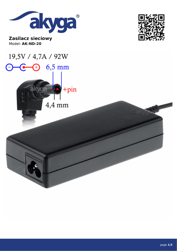 Zasilacz sieciowy Model: AK-ND-20 page 1/3 Zasilacz sieciowy model: AK-ND-20 Kod produktu AK-ND-20 Typ produktu Zasilacz sieciowy Seria Napięcie zasilające Dedicated 100 - 250 V Pobór prądu < 2.4 A Sprawność > 80 % Napięcie wyjściowe 19.5 V Wyjściowe natężenie prądu 4.7 A Długość kabla wyjściowego 1.2 m Złacze kabla wyjściowego Maksymalna moc Wtyk gniazda zasilania Wyłacznik mechaniczny 6.5 x 4.4 mm + pin 92 W IEC C6 Brak Uziemienie Tak Łagodny start Tak Filtr ferrytowy Tak Złącze USB Kabel zasilający w zestawie Materiał wykonania Kolor produktu Wyświetlacz MTBF Temperatura pracy Opakowanie Wymiary produktu (L x W x H) Wymiary opakowania (L x W x H) Brak Nie ABS Czarny Brak 100000 h 5 - 50 °C EcoBox 131.5 x 180 x 31 mm 240 x 92 x 38 mm Waga netto 248 g Waga brutto 297 g Zgodność z CE Tak Zgodność z FCC Tak Zgodność z RoHS Tak Kod EAN 5901720131102 page 2/3 Zasilacz sieciowy model: AK-ND-20 Opis Akyga pośród szerokiej gamy produktów oferuje serię najwyższej jakości dedykowanych zasilaczy do laptopów. AK-ND-20 to zasilacz o mocy 92W, kompatybilny ze wszystkimi modelami laptopów zasilanymi prądem 19.5V i maksymalnie 4.7A, oraz z wtyczką 6.5*4.4 mm + pin. Przewód zasilacza wyposażony został w wysokiej jakości filtr ferrytowy, pozwalający na minimalizację ewentualnych zakłóceń pochodzących z sieci. Komplet zabezpieczeń OVP, OTP, OPP, SCP oraz OCP gwarantuje w 100% bezpieczną, stabilną pracę zarówno zasilanych urządzeń, jak i samego zasilacza. Dodatkowe bezpieczeństwo dla sprzętu zapewnia zastosowana technologia tzw. łagodnego startu, która neutralizuje szok związany z pierwszym uderzeniem prądu w trakcie uruchamiania podłączonego urządzenia. Wszystkie zasilacze Akyga pakowane są w przyjazne środowisku opakowanie typu EcoBox. page 3/3
