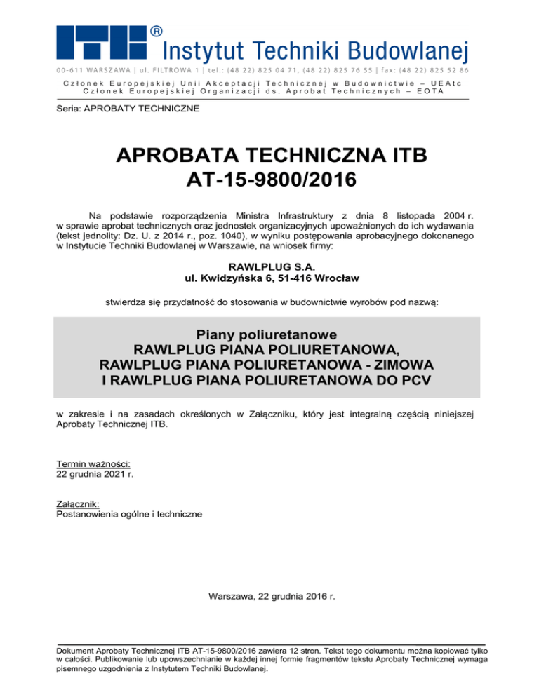 Seria: APROBATY TECHNICZNE APROBATA TECHNICZNA ITB AT-15-9800/2016 Na podstawie rozporządzenia Ministra Infrastruktury z dnia 8 listopada 2004 r. w sprawie aprobat technicznych oraz jednostek organizacyjnych upoważnionych do ich wydawania (tekst jednolity: Dz. U. z 2014 r., poz. 1040), w wyniku postępowania aprobacyjnego dokonanego w Instytucie Techniki Budowlanej w Warszawie, na wniosek firmy: RAWLPLUG S.A. ul. Kwidzyńska 6, 51-416 Wrocław stwierdza się przydatność do stosowania w budownictwie wyrobów pod nazwą: Piany poliuretanowe RAWLPLUG PIANA POLIURETANOWA, RAWLPLUG PIANA POLIURETANOWA - ZIMOWA I RAWLPLUG PIANA POLIURETANOWA DO PCV w zakresie i na zasadach określonych w Załączniku, który jest integralną częścią niniejszej Aprobaty Technicznej ITB. Termin ważności: 22 grudnia 2021 r. Załącznik: Postanowienia ogólne i techniczne Warszawa, 22 grudnia 2016 r. Dokument Aprobaty Technicznej ITB AT-15-9800/2016 zawiera 12 stron. Tekst tego dokumentu można kopiować tylko w całości. Publikowanie lub upowszechnianie w każdej innej formie fragmentów tekstu Aprobaty Technicznej wymaga pisemnego uzgodnienia z Instytutem Techniki Budowlanej. 2/12 AT-15-9800/2016 Z AŁ ĄCZNIK POSTANOWIENIA OGÓLNE I TECHNICZNE SPIS TREŚCI 1. PRZEDMIOT APROBATY .......................................................................................................................... 3 2. PRZEZNACZENIE, ZAKRES I WARUNKI STOSOWANIA ................................................................... 3 3. WŁAŚCIWOŚCI TECHNICZNE. WYMAGANIA ......................................................................................... 4 4. PAKOWANIE, PRZECHOWYWANIE I TRANSPORT ............................................................................... 6 5. OCENA ZGODNOŚCI ................................................................................................................................ 7 5.1. Zasady ogólne ..................................................................................................................................... 7 5.2. Wstępne badanie typu ......................................................................................................................... 7 5.3. Zakładowa kontrola produkcji .............................................................................................................. 8 5.4. Badania gotowych wyrobów ................................................................................................................ 8 5.5. Częstotliwość badań ........................................................................................................................... 9 5.6. Metody badań ...................................................................................................................................... 9 5.7. Pobieranie próbek do badań ............................................................................................................. 10 5.8. Ocena wyników badań ...................................................................................................................... 10 6. USTALENIA FORMALNO - PRAWNE .................................................................................................... 10 7. TERMIN WAŻNOŚCI .............................................................................................................................. 11 INFORMACJE DODATKOWE...................................................................................................................... 11 AT-15-9800/2016 3/12 1. PRZEDMIOT APROBATY Przedmiotem Aprobaty Technicznej ITB są piany poliuretanowe o nazwach handlowych RAWLPLUG Piana poliuretanowa, RAWLPLUG Piana poliuretanowa – ZIMOWA i RAWLPLUG Piana poliuretanowa do PCV. Piany objęte Aprobatą są produkowane przez firmę RAWLPLUG S.A., ul. Kwidzyńska 6, 51-416 Wrocław. Piany RAWLPLUG Piana poliuretanowa i RAWLPLUG Piana poliuretanowa – ZIMOWA są jednoskładnikowymi pianami poliuretanowymi, wytwarzanymi na bazie żywic poliuretanowych z udziałem środka spieniającego, produkowanymi w postaci aerozolu. Materiał do ich wytwarzania dostarczany jest w metalowych pojemnikach ciśnieniowych dostosowanych do spieniania przy użyciu pistoletu (wersja pistoletowa) lub aplikatora (wersja wężykowa). Piana RAWLPLUG Piana poliuretanowa do PCV jest jednoskładnikową pianą poliuretanową o podwyższonej elastyczności, wytwarzaną na bazie żywic poliuretanowych z udziałem środka spieniającego, produkowaną w postaci aerozolu. Materiał do jej wytwarzania dostarczany jest w metalowych pojemnikach ciśnieniowych dostosowanych do spieniania przy użyciu pistoletu. Piany są spieniane w miejscu zastosowania, a po aplikacji twardnieją na skutek absorpcji wilgoci z powietrza. Wymagane właściwości techniczne pian objętych Aprobatą podano w p. 3. 2. PRZEZNACZENIE, ZAKRES I WARUNKI STOSOWANIA Piany objęte Aprobatą są przeznaczone do uszczelniania przestrzeni między ościeżami a ościeżnicami okien i drzwi, wykonywanych z drewna, PCV-U lub metalu, przy montażu okien i drzwi (z wyjątkiem drzwi klasyfikowanych w zakresie odporności ogniowej), przy czym montaż ten powinien być wykonywany przy użyciu łączników mechanicznych. Piany objęte Aprobatą mogą być stosowane do wypełniania pęknięć i niewielkich, nieruchomych szczelin w połączeniach między elementami przegród w budynku (z wyjątkiem przegród klasyfikowanych w zakresie odporności ogniowej). Piana RAWLPLUG Piana poliuretanowa może być aplikowana w temperaturach od +5°C do +30°C. Piana RAWLPLUG Piana poliuretanowa – ZIMOWA może być aplikowana w temperaturach od -10°C do +30°C. Piana RAWLPLUG Piana poliuretanowa do PCV może być aplikowana w temperaturach od +5°C do +30°C, zachowując elastyczność w całym zakresie temperatur. Prace z użyciem poliuretanowych pian uszczelniających powinny być wykonywane w warunkach cieplno-wilgotności