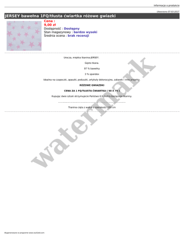 Informacje o produkcie Utworzono 07-03-2017 JERSEY bawełna 1FQ/tłusta ćwiartka różowe gwiazki Cena : 9,00 zł Dostępność : Dostępny Stan magazynowy : bardzo wysoki Średnia ocena : brak recenzji Urocza, miękka tkanina-JERSEY. er m ar k Gęsto tkana. 97 % bawełny 3 % spandex Idealna na czapeczki, apaszki, poduszki, artykuły dekoracyjne, zabawki i inne projekty. RÓŻOWE GWIAZDKI CENA ZA 1 FQ/TŁUSTA ĆWIARTKA ( 50 X 75 ) Kupując dwie sztuki otrzymujecie Państwo 0,5 metra bieżącego tkaniny. ………………………………………………………………………………. w at Tkanina cięta z wałka o szerokości 150 cm Wygenerowano w programie www.oscGold.com