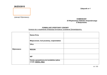 26/ZO/2015 Załącznik nr 1 (pieczęć Wykonawcy) KOMENDANT 25 Wojskowego Oddziału Gospodarczego w Białymstoku FORMULARZ OFERTOWY/ CENOWY Uprasza się o wypełnienie niniejszego formularza i przesłanie Zamawiającemu. Nazwa firmy Miejscowość, kod pocztowy, województwo Ulica Wykonawca REGON NIP Osoba upoważniona do kontaktów (adres e-mail, telefon, faks) str. 1/20 Składając ofertę na: Dostawa odzieży roboczej, ochronnej oraz środków ochrony indywidualnej. oferujemy wykonanie zamówienia zgodnie ze stawkami cenowymi zawartymi w tabeli poniżej. Lp. 1 2 3 Przedmiot zamówienia Kurtka przeciwdeszczowa ¾ (model 101) Rozmiary: M-5 L-15 XL-15 XXL-10 XXXL-5 Kamizelka ocieplana Rozmiary: M-2 L-2 XL-2 XXL-2 XXX-2 Koszulka z krótkim rękawem t-shirt Rozmiary: M-25 L-30 XL-60 XXL- 60 XXXL-25 Opis przedmiotu zamówienia Kurtka z materiału wodoochronnego (np. z plavitexu) o gramaturze co najmniej 350g/m2 i grubości 0,50 mm, zapinana na zamek przykryty plisą, posiadająca kaptur, wiatrołapy w rękawach i co najmniej dwie kieszenie. Szwy obustronnie zgrzewane. Kolor granatowy. Spełnienie norm: PN-EN 340 i PN-EN 343. Widoczne oznakowanie CE. Kamizelka ocieplana wykonana z tkaniny o składzie: 65% poliester, 35% bawełna. Wyposażona w przepikowaną ocieplinę o gramaturze co najmniej 235g/m2. Zapinana na błyskawiczny zamek przykryty patką zapinaną na metalowe napy. Przedłużony tył kamizelki, gumki ściągające pod pachami, ocieplany kołnierz oraz patka przykrywająca zamek chroniąca przed zimnem oraz wiatrem. Kolor niebieski. Spełnienie norm: EN 340 i EN 14058. Widoczne oznakowanie CE. T-shirt męski - 100% wysokogatunkowej bawełny, gramatura co najmniej 185 g/m2. Bez szwów bocznych, z taśmą wzmacniająca szwy rękawów. Kolor granatowy. Widoczne oznakowanie CE. J.M. Ilość szt. 50 szt. 10 szt. 200 cena jednostkowa brutto wartość brutto str. 2/20 4 5 6. Koszula flanelowa Rozmiary: M-40 L-60 XL-150 XXL- 150 XXXL-50 Buty gumowe Rozmiary: 41-5 42-10 43-10 44-10 45-5 46-5 47-5 Trzewiki robocze Polstar MAX S3 SRC Rozmiary: 39-5 40-15 41-35 42-60 43-75 44-75 45-15 46-10 47-5 48-5 Koszula wykonana z wysokiej jakości materiału - 100% bawełna, gramatura co najmniej 205 g/m2 i kurczliwości do 3%. Koszula ochronna zapinana jest na guziki. Jedna lub dwie kieszonki na klatce piersiowej zapinane na guzik. Rękawy zakończone mankietem, a jego szerokość w nadgarstkach regulowana za pomocą guzików. Możliwość podwinięcia i podpięcia rękawów dzięki czemu można ją nosić zarówno w chłodne, jak i ciepłe dni. Kolor - odcienie niebieskiego. Widoczne oznakowanie CE. Buty bezpieczne wykonane z PCV. Podeszwa olejoodporna z urzeźbieniem chroniącym przed poślizgiem, wewnątrz wkładka z filcu, stalowy podnosek wytrzymały na uderzenia z energią 200 J oraz zgniecenia do 15 kN - typ SB, spełniające wymagania normy EN-345. Widoczne oznakowanie CE. Trzewik za kostkę, wiązany. - wierzchnia część buta: skóra dwoinowa Buffalo o grubości 1,8-2,0 mm, zapewniająca odporność na absorpcję wody przez czas 60 min; - wyściółka: zapobiegająca otarciom, wchłaniająca pot tkanina o wysokiej higroskopijności; - podnosek: kompozytowy wytrzymały na uderzenia z energią 200 J oraz zgniecenia do 15 kN, wkładka antyprzebiciowa: kompozytowa, zabezpieczająca stopę przed przekłuciem o nacisku 1100N, - podeszwa: PU/TPU o podwójnej szt. 450 para 50 para 300 str. 3/20 7 8 Trzewiki spawacza PPO Model 443 Rozmiary: 41-1 42-2 43-1 44-2 45-1 47-1 Obuwie laboratoryjne Rozmiary: 38-4 39-2 40-3 41-2 42-5 43-3 44-4 45-1 46-1 gęstości, olejoodporna, odporna na węglowodory, antyelektrostatyczna, absorpcja energii pięty, posiadająca właściwości antypoślizgowe SRC. Spełnienie norm: EN ISO 20345 Widoczne oznakowanie CE. Trzewiki bezpieczne przeznaczone dla spawacza. - cholewki: wykonane ze skór licowych o wyprawie termoodpornej; z zabezpieczeniem uniemożliwiającym przedostanie się iskier i rozprysków stopionego metalu do wnętrza obuwia; - wyściółka: wyjmowana o wysokiej higroskopijności; - metalowy podnosek chroniący stopę przed uderzeniem z energią do 200J, podeszwa: PU/guma, antyelektrostatyczna, antypoślizgowa, pochłaniająca energię w części piętowej, odporna na oleje, benzynę, inne rozpuszczalniki organiczne, kwasy i zasady oraz temperaturę w krótkotrwałym kontakcie do 300°C oraz izolująca od zimna w temp. do - 25°C. Trzewiki spełniające wymagania normy PN-EN ISO 20349, S3, SRC, HRO. Widoczne oznakowanie CE. Obuwie antypoślizgowe (gumowy spód), antystatyczne, absorpcja energii w części piętowej, wew. anatomiczny wkład korkowy kryty skórą, przyjazne dla skóry, pochłaniające wilgoć, odporne na działanie kwasów i zasad, odporność na olej napędowy, profil podeszwy usuwający zabrudzenia pod wpływem chodzenia. Wykonane w całości z łatwej do utrzymania w czystości i zapewniającej przepływ powietrza mikrofibry. Wyjmowana profilowana wyściółka. Pasek dwufunkcyjny przekładany na piętę. Kolor para 8 para 25 str. 4/20 9 10 11 12 13 14 Czapka letnia robocza Czapka zimowa z wkładką THINSULATE Fartuch płócienny biały Rozmiary: M-2 L-10 XXL-3 . Bielizna zimowa Rozmiary: L- 10 M – 10 XL - 5 Okulary przeciwsłoneczne MATRIX polarized MP 733 Okulary(gogle) ochronne biały. Spełnienie normy: EN 20347. Widoczne oznakowanie CE. Czapka drelichowa - skład: 35% bawełna, 65% poliester; - usztywniany daszek i przód czapki; zapinana na zatrzask z możliwością regulacji. Kolor granatowy. Widoczne oznakowanie CE. Czapka zimowa (bez akrylu) wywijana, powłoka 100% poliester o gramaturze co najmniej 260 g/m2; ocieplana wkładką Thinsulate o gramaturze nie mniej niż 80 g/m2. Kolor czarny. Widoczne oznakowanie CE. Fartuch płócienny biały z długimi rękawami – skład:100% bawełna lub co najmniej 35% bawełna, 65% poliester; gramatura co najmniej 255 g/m2; pasek regulujący obwód fartucha umieszczony z tyłu; posiadający co n
