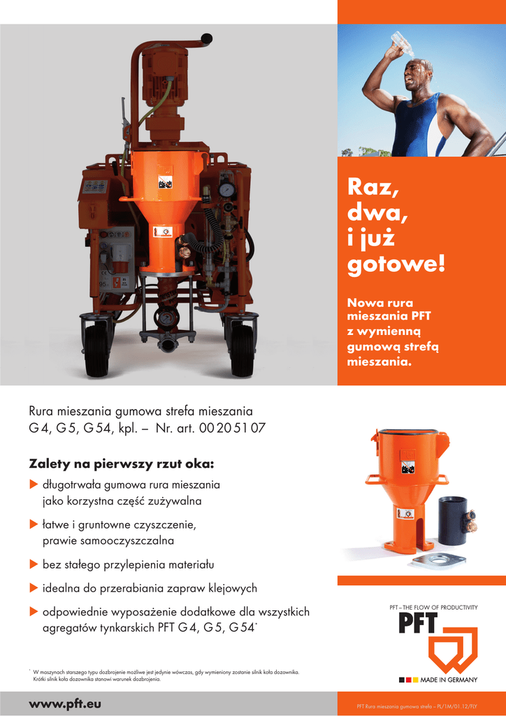 Raz, dwa, i ju¿ gotowe! Nowa rura mieszania PFT z wymienn¹ gumow¹ stref¹ mieszania. Rura mieszania gumowa strefa mieszania G 4, G 5, G 54, kpl. – Nr. art. 00 20 51 07 Zalety na pierwszy rzut oka: d³ugotrwa³a gumowa rura mieszania jako korzystna czêœæ zu¿ywalna ³atwe i gruntowne czyszczenie, prawie samooczyszczalna bez sta³ego przylepienia materia³u idealna do przerabiania zapraw klejowych odpowiednie wyposa¿enie dodatkowe dla wszystkich agregatów tynkarskich PFT G 4, G 5, G 54* * * PFT – THE FLOW OF PRODUCTIVITY W maszynach starszego typu dozbrojenie mo¿liwe jest jedynie wówczas, gdy wymieniony zostanie silnik ko³a dozownika. Krótki silnik ko³a dozownika stanowi warunek dozbrojenia. www.pft.eu PFT Rura mieszania gumowa strefa – PL/1M/01.12/FLY
