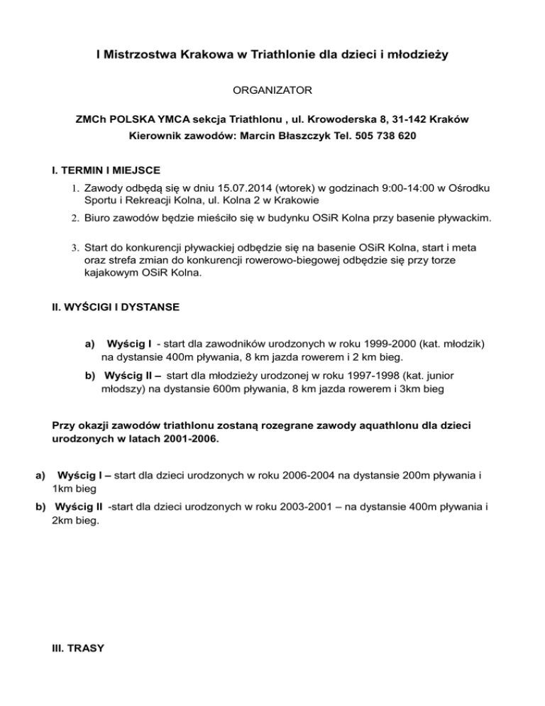 I Mistrzostwa Krakowa w Triathlonie dla dzieci i młodzieży ORGANIZATOR ZMCh POLSKA YMCA sekcja Triathlonu , ul. Krowoderska 8, 31-142 Kraków Kierownik zawodów: Marcin Błaszczyk Tel. 505 738 620 I. TERMIN I MIEJSCE 1. Zawody odbędą się w dniu 15.07.2014 (wtorek) w godzinach 9:00-14:00 w Ośrodku Sportu i Rekreacji Kolna, ul. Kolna 2 w Krakowie 2. Biuro zawodów będzie mieściło się w budynku OSiR Kolna przy basenie pływackim. 3. Start do konkurencji pływackiej odbędzie się na basenie OSiR Kolna, start i meta oraz strefa zmian do konkurencji rowerowo-biegowej odbędzie się przy torze kajakowym OSiR Kolna. II. WYŚCIGI I DYSTANSE a) Wyścig I - start dla zawodników urodzonych w roku 1999-2000 (kat. młodzik) na dystansie 400m pływania, 8 km jazda rowerem i 2 km bieg. b) Wyścig II – start dla młodzieży urodzonej w roku 1997-1998 (kat. junior młodszy) na dystansie 600m pływania, 8 km jazda rowerem i 3km bieg Przy okazji zawodów triathlonu zostaną rozegrane zawody aquathlonu dla dzieci urodzonych w latach 2001-2006. a) Wyścig I – start dla dzieci urodzonych w roku 2006-2004 na dystansie 200m pływania i 1km bieg b) Wyścig II -start dla dzieci urodzonych w roku 2003-2001 – na dystansie 400m pływania i 2km bieg. III. TRASY PŁYWANIE: konkurencja ta zostanie rozegrana na 25m krytej pływalni. Start z wody – równocześnie płyną 2 osoby na torze obok siebie. Obowiazują stroje i czepki pływackie. ROWER: konkurencja ta wytyczona zostanie po ścieżce rowerowej po agrafce (tam i zpowrotem) , trasa płaska, prosta o bardzo dobrej, równej nawierzchni asfaltowej szerokości ok. 3-4m , bez ruchu samochodowego. BIEG: wytyczony zostanie na pętlach 1km ścieżką asfaltowa wokół toru kajakowego OSiR Kolna. STREFA ZMIAN: zlokalizowana w okolicy toru kajakowego OSiR Kolna. UWAGI: do konkurencji biegowej w aquathlonie oraz konkurencji rowerowobiegowej w triathlonie , zawodnicy startują według kolejności po konkurencji pływackiej tzn. najlepszy czas z pływania to jest pierwszy zawodnik do biegu lub na rower. Zawody sportowe wygrywa ten zawodnik , który jako pierwszy przekorczy linię - META. Pomiar czasu ręczny za pomocą stoperów i zegara czasowego. IV. KATEGORIE WIEKOWE I KLASYFIKACJE a) Kategoria I - dzieci młodsze – dziewczęta i chłopcy (rocznik 2006-2004) b) Kategoria II - dzieci starsze – dziewczęta i chłopcy (rocznik 2003-2001) c) Kategoria III – młodzik – dziewczęta i chłopcy (rocznik 2000-1999) d) Kategoria IV – junior młodszy – dziewczęta i chłopcy ( rocznik 1998-1997) V. NAGRODY Po zakończeniu zmagań sportowych zostaną przyznane i wręczone puchary i dyplomy oraz drobne nagrody rzeczowe za zajęcie I – III miejsca w poszczególnych kategoriach wiekowych. VI. PROGRAM ZAWODÓW 08:30 – 10:00 – otwarcie biura zawodów , odbiór pakietów startowych. 9:30 – 10:00 – rozgrzewka do konkurencji pływackiej 10:00 - Odprawa Techniczna z zawodnikami 10:05 - Start do wyścigu aquathlon Kat. I (dystans 200m ) 10:15 – Start do wyścigu aquathlon Kat. II (dystans 400m) 10:30 - Start do wyścigu triathlon Kat. III (dystans 400m) 10:45 – Start do wyścigu triathlon Kat. IV (dystans 600m) 11:15 – Wprowadzenie rowerów do strefy zmian dla zawodników triathlonu 11:15 – Start do konkurencji biegowej zawodników z aquathlonu 11:30 – Start do konkurencji rowerowo- biegowej dziewczęta kat. I i II 12:00 – Start do konkurencji rowerowo – biegowej chłopcy kat. I i II 13:00 - Ceremonia dekoracji wszystkich kategorii wiekowych i uroczyste zakończenie zawodów. VII. WARUNKI UCZESTNICTWA 1. Osoby niepełnoletnie zobowiązane są do posiadania pozwolenia na udział od rodziców lub prawnych opiekunów z ich podpisem. Warunkiem dopuszczenia ich do startu jest obecność rodzica lub opiekuna (trenera) w momencie weryfikacji zawodnika w biurze zawodów. 2. Start w poszczególnych wyścigach jest osobny dla dziewcząt i chłopców. 3. Zawodnicy muszą posiadać strój sportowy (strój pływacki, czepek, strój i buty biegowe, triathonowy (niedozwolone jest bieganie bez koszulki), oraz sprawny technicznie rower (szosowy, górski, trekingowy) oraz kask na głowę obowiązkowo. VIII. ZGŁOSZENIA I OPŁATA STARTOWA 1. Zgłoszenia do aquathlonu będą przyjmowane na adres e-mail: [email protected] do dnia 13.07.2014r. do godziny 23:59 lub w biurze zawodów w godzinach 8:30-9:30 do wyczerpania pakietów startowych. 3. Za zgłoszenie uważa się dostarczenie prawidłowo wypełnionego formularza zgłoszeniowego (imię , nazwisko, data urodzenia) oraz podpisanego oświadczenia oraz uiszczenie opłaty startowej (z wyjątkiem osób zwolnionych z opłaty startowej). 5. Opłata startowa za udział w zawodach wynosi: a) Konkurencja triathlon - 30,00 PLN b) Konkurencja aquathlon – 20,00 PLN b) Z opłaty startowej zwolnieni są zawodnicy sekcji triathlonu YMCA Kraków. 6. Opłatę startową należy wpłacić gotówką w dniu zawodów w biurze zawodów w godz. 8:30-10:00 przy odbiorze pakietu startowego. 7. Podczas odbioru pakietu zawodnicy muszą posiadać dokument ze zdjęciem celem weryfikacji danych osobowych oraz wieku. 8. W ramach opłaty startowej każdy uczestnik otrzymuje: posiłek regeneracyjny , numer startowy, napoje (woda, izotonik) na mecie, upominki od sponsorów i partnerów imprezy. 10. Organizator nie ubezpiecza uczestników zawodów od następstw nieszczęsliwych wypadków (NNW). Zaleca się ubezpieczenie we własnym zakresie. 11. Organizator wystawia rachunki na żądanie. Rachunki dotyczące opłat dokonywanych w dniu zawodów, po podaniu dokładnych danych będzie można odebrać po zawodach na podstawie dowodu wpłaty KP. IX. OCHRONA DANYCH OSOBOWYCH 1. Dane osobowe uczestników Mistrzostw Krakowa w Triathlonie będą przetwarzane w celach przeprowadzenia imprezy, wyłonienia zwycięzców i przyznania, wydania, odbioru i rozliczenia nagrody. 2. Dane osobowe uczestników w ramach Mistrzostw Krakowa w Triathlonie będą wykorz