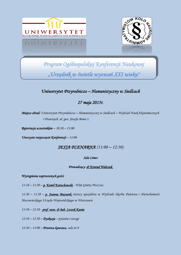 Program Ogólnopolskiej Konferencji Naukowej „Urzędnik w świetle wyzwań XXI wieku" Uniwersytet Przyrodniczo – Humanistyczny w Siedlcach 27 maja 2015r. Miejsce obrad: Uniwersytet Przyrodniczo – Humanistyczny w Siedlcach – Wydział Nauk Ekonomicznych i Prawnych, ul. gen. Józefa Bema 1. Rejestracja uczestników – 10:30 – 11:00 Uroczyste rozpoczęcie Konferencji – 11:00 SESJA PLENARNA (11:00 – 12:30) Sala Limes Prowadzący: dr Konrad Walczuk Wystąpienia zaproszonych gości: 11:10 – 11:30 – p. Kamil Kożuchowski - Wójt Gminy Piszczac 11:30 – 11:50 – p. Joanna Mazurek starszy specjalista w Wydziale Skarbu Państwa i Nieruchomości Mazowieckiego Urzędu Wojewódzkiego w Warszawie 11:50 – 12:10 - prof. nzw. dr hab. Leszek Kania 12:10 – 12:30 – Dyskusja – pytania i uwagi 12:30 – 13:00 – Przerwa kawowa, sala nr 8 OBRADY STUDENCKIE 13:00 – 16:00 Sala 1, 2, 4, 5 – Wydział Nauk Ekonomicznych i Prawnych, ul. gen. Józefa Bema 1 I PANEL SALA NR 1 Prowadzący: Karolina Mazurek 13:00–13:10 13:10–13:20 13:20–13:30 13:30–13:40 13:40–13:50 13:50–14:00 14:00–14:10 14:10–14:20 14:20–14:30 14:30–14:40 14:40–14:50 14:50–15:00 15:00–15:10 15:10–15:20 15:20–15:30 15:30–15:40 15:40–15:50 15:50–16:00 Siedlecka Magdalena (UPH) – „Gospodarka przestrzenna kluczem do efektywnego rozwoju miast Rzeczypospolitej Polskiej przez urzędników samorządu terytorialnego” Arczewski Piotr, Janczuk Mateusz (UPH) – „Problemy pracowników powiatowych biur Agencji Restrukturyzacji i Modernizacji Rolnictwa podczas kontroli z tytułu płatności w ramach systemów wsparcia bezpośredniego” Chwedczuk Michał, Arczewski Piotr (UPH) – „Praca urzędnika celnego w logistyce na podstawie Izby celnej w Białej Podlaskiej” Czajka Żaneta (UPH) – „Zadania urzędnika ds. gospodarki przestrzennej w naszym kraju” Daniluk Sylwia (UPH) – „Rola Administratora Bezpieczeństwa Informacji w urzędach administracji publicznej” Gniado Marta (UPH) – „Procedura rewitalizacji społeczno – gospodarczej przestrzeni miejskiej” Hawryluk Urszula (UPH) – „Kompleksowe opracowanie projektów miejscowych planów zagospodarowania przestrzennego jako jedno z głównych zadań urzędnika ds. gospodarki przestrzennej” Hołownia Magdalena (UPH) – „Urzędnik w świetle wyzwań XXI wieku” Jackiewicz Maksymilian (UPH) – „Urzędnik w świetle polskiego prawa” Kobryński Maciej (UPH) – „Nepotyzm i kumoterstwo w urzędach miasta” Krasuski Karol (UPH) – „Rola i znaczenie Urzędu Patentowego Rzeczpospolitej Polskiej w działaniach logistycznych przedsiębiorstw” Rudnicka Karolina (UPH) – „Gmina-jak skutecznie nią zarządzać, problemy z jakimi zmagają się urzędnicy, aby prawidłowo i efektywnie zarządzać infrastrukturą gminy” Stempnik Paulina (UPH) – „Rola urzędników samorządu gminnego w tworzeniu dokumentów dotyczących kształtowania przestrzeni” Toczyska Ewelina (UPH) – „Udział urzędnika w tworzeniu obszarów NATURA 2000 i wpływ tych obszarów na zagospodarowanie przestrzeni” Warowny Piotr (UPH) – „Urzędnik przed obowiązkiem archiwizacji dokumentów w formie tradycyjnej” Zbieć Ewelina (UPH) – „Prywatny plan zagospodarowania przestrzennego, czyli samowola budowlana w świetle ustawy Prawa budowlanego” Mgr Bancerz Radosław (UPH) – „Wyzwania urzędników polskich w okresie odbudowy państwa 1918-1926. Na terenie regionu siedleckiego” Kuśmierczyk Katarzyna (UPH) – „Majątkowa odpowiedzialność urzędnika” II PANEL SALA NR 2 Prowadzący: Dominika Mańko 13:00–13:10 13:10–13:20 13:20–13:30 Adamski Piotr Jan (Uniwersytet Wrocławski) – „Asystent podatnika – krok w stronę nowoczesnej administracji podatkowej” Babula Mateusz, (UTH) – „Ministerstwo Energetyki – przyszłość czy powrót do przeszłości” Czapski Grzegorz (UPH) – „Policjant – zawód zaufania publicznego” Jędrek Dominik (UMCS) – „NFC i kod QR w urzędzie. Czyli, halo? Czy tu zapłacę PayPass`em?” 13:40–13:50 Korulczyk Joanna (UPH) – „Zadania i kompetencje Prezesa Urzędu Lotnictwa Cywilnego w Polsce” 13:50–14:00 Kot Anna (UPH) – „Urzędnik przed obowiązkiem archiwizacji dokumentacji w formie elektronicznej” 14:00–14:10 Kowalczyk Marcin (UPH) – „Bezpieczeństwo informacji w urzędach – hasła i kopie zapasowe” 14:10–14:20 Ługowska Katarzyna (UPH) – „Wpływ nieprawidłowego odżywiania na ryzyko wystąpienia chorób cywilizacyjnych w pracy współczesnego urzędnika” 14:20–14:30 Mazur Barbara (UMCS) – „Odpieranie zjawisk korupcyjnych jako wyzwanie dla współczesnego urzędnika.” 14:30–14:40 Mgr Śwital Paweł (UTH, doktorant KUL) – „Standardy etyczne pracowników samorządowych” Kamila (Uniwersytet Warmińsko-Mazurski) – 14:40– 14:50 Naumowicz „Odpowiedzialność urzędnika za naruszenia ustawy o dostępie do informacji publicznej” 14:50–15:00 Rytel Anna (UPH) – „Prawo do azylu a kwestie bezpieczeństwa państwa w związku z kompetencjami urzędników administracji państwowej” 15:00–15:10 Stańska Aleksandra (UPH) – „Rola urzędnika w elektronicznej administracji” 15:10–15:20 Struk Martyna (UPH) – „Rola urzędnika- składanie wniosków i dotacji oraz pozyskiwanie środków unijnych dla rolników” 15:20–15:30 Świątek Kamil (UPH) – „Rozwiązania informatyczne wspomagające pracę urzędnika” 15:30–15:40 Worobiej Milena (UMCS) – „Komunikacja pomiędzy urzędnikiem a obywatelem- prawo dostępu do informacji publicznej” 15:40–15:50 Zabielska Monika (UPH) - „Administracja w logistyce- źródła prawa transportowego” 15:50–16:00 Mróz Edyta (UPH) – „Odpowiedzialność karna urzędników administracji za działania na szkodę obywatela” 13:30–13:40 III PANEL SALA NR 4 Prowadzący: Iwona Multan 13:00–13:10 13:10–13:20 13:20–13:30 13:30–13:40 13:40–13:50 13: