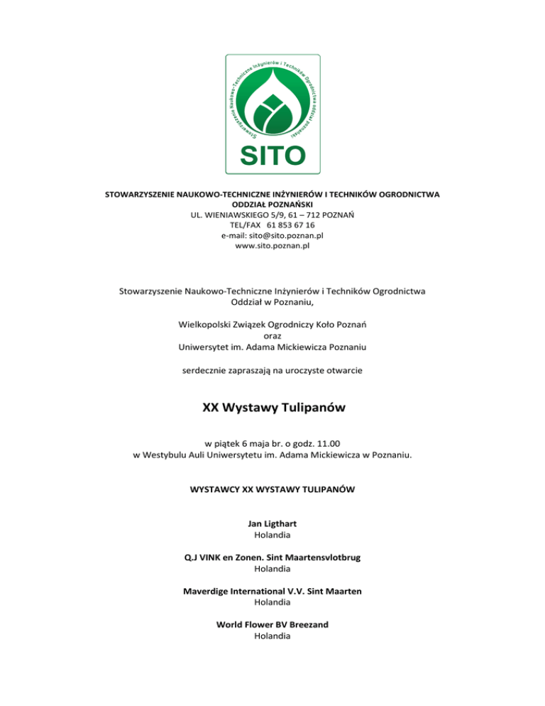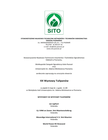 STOWARZYSZENIE NAUKOWO-TECHNICZNE INŻYNIERÓW I TECHNIKÓW OGRODNICTWA ODDZIAŁ POZNAŃSKI UL. WIENIAWSKIEGO 5/9, 61 – 712 POZNAŃ TEL/FAX 61 853 67 16 e-mail: [email protected] www.sito.poznan.pl Stowarzyszenie Naukowo-Techniczne Inżynierów i Techników Ogrodnictwa Oddział w Poznaniu, Wielkopolski Związek Ogrodniczy Koło Poznań oraz Uniwersytet im. Adama Mickiewicza Poznaniu serdecznie zapraszają na uroczyste otwarcie XX Wystawy Tulipanów w piątek 6 maja br. o godz. 11.00 w Westybulu Auli Uniwersytetu im. Adama Mickiewicza w Poznaniu. WYSTAWCY XX WYSTAWY TULIPANÓW Jan Ligthart Holandia Q.J VINK en Zonen. Sint Maartensvlotbrug Holandia Maverdige International V.V. Sint Maarten Holandia World Flower BV Breezand Holandia Barbara i Michał Szymanowscy Specjalistyczne Gospodarstwo Ogrodnicze Gołuski k. Poznania, ul. Ogrodowa 1 62-069 Palędzie Renata i Roman Szymańscy Gospodarstwo ul. Pokrzywno 39c 61-315 Poznań Tomasz Morawski Gospodarstwo Ogrodnicze Tomasz Morawski ul. Sadowa 15 05-850 Ożarów Mazowiecki Jawczyce k/Warszawy Piotr Pukszto Gospodarstwo Ogrodnicze ul. Fordońska 19 85-085 Bydgoszcz Andrzej Nowacki Gospodarstwo Ogrodnicze ul. Zakrzewki 14 63-460 Ociąż Jerzy Nowaczyk Ogrodnictwo ul. Dąbrowskiego 43a/19 63-000 Środa Wielkopolska Tegoroczną XX Wystawę Tulipanów będą realizowały: Andrzej Aumiller Prezes Zarządu SITO o/Poznań dr hab. Agnieszka Krzymińska Wiceprezes SITO o/Poznań Anna Durzyńska Członek Zarządu SITO o/Poznań Luiza Dawidowicz Członek Zarządu SITO o/Poznań Monika Bartkowiak Członek Zarządu SITO o/Poznań Maria Matuszczak Członek Zarządu SITO o/Poznań Kompozycję z kwiatów zostaną ułożone przez florystów – członków Stowarzyszenia Naukowo-Technicznego Inżynierów i Techników Ogrodnictwa Oddział Poznański oraz współpracującą ze Stowarzyszeniem Sekcją Florystyczną Koła Naukowego Ogrodników Wydziału Ogrodnictwa i Architektury Krajobrazu Uniwersytetu Przyrodniczego w Poznaniu. Serdecznie zapraszamy! STOWARZYSZENIE NAUKOWO-TECHNICZNE INŻYNIERÓW I TECHNIKÓW OGRODNICTWA ODDZIAŁ POZNAŃSKI UL. WIENIAWSKIEGO 5/9, 61 – 712 POZNAŃ TEL/FAX 61 853 67 16 e-mail: [email protected] www.sito.poznan.pl Stowarzyszenie Naukowo-Techniczne Inżynierów i Techników Ogrodnictwa Oddział w Poznaniu, Wielkopolski Związek Ogrodniczy Koło Poznań oraz Uniwersytet im. Adama Mickiewicza Poznaniu serdecznie zapraszają na uroczyste otwarcie XX Wystawy Tulipanów w piątek 6 maja br. o godz. 11.00 w Westybulu Auli Uniwersytetu im. Adama Mickiewicza w Poznaniu. WYSTAWCY XX WYSTAWY TULIPANÓW Jan Ligthart Holandia Q.J VINK en Zonen. Sint Maartensvlotbrug Holandia Maverdige International V.V. Sint Maarten Holandia World Flower BV Breezand Holandia Barbara i Michał Szymanowscy Specjalistyczne Gospodarstwo Ogrodnicze Gołuski k. Poznania, ul. Ogrodowa 1 62-069 Palędzie Renata i Roman Szymańscy Gospodarstwo ul. Pokrzywno 39c 61-315 Poznań Tomasz Morawski Gospodarstwo Ogrodnicze Tomasz Morawski ul. Sadowa 15 05-850 Ożarów Mazowiecki Jawczyce k/Warszawy Piotr Pukszto Gospodarstwo Ogrodnicze ul. Fordońska 19 85-085 Bydgoszcz Andrzej Nowacki Gospodarstwo Ogrodnicze ul. Zakrzewki 14 63-460 Ociąż Jerzy Nowaczyk Ogrodnictwo ul. Dąbrowskiego 43a/19 63-000 Środa Wielkopolska Tegoroczną XX Wystawę Tulipanów będą realizowały: Andrzej Aumiller Prezes Zarządu SITO o/Poznań dr hab. Agnieszka Krzymińska Wiceprezes SITO o/Poznań Anna Durzyńska Członek Zarządu SITO o/Poznań Luiza Dawidowicz Członek Zarządu SITO o/Poznań Monika Bartkowiak Członek Zarządu SITO o/Poznań Maria Matuszczak Członek Zarządu SITO o/Poznań Kompozycję z kwiatów zostaną ułożone przez florystów – członków Stowarzyszenia Naukowo-Technicznego Inżynierów i Techników Ogrodnictwa Oddział Poznański oraz współpracującą ze Stowarzyszeniem Sekcją Florystyczną Koła Naukowego Ogrodników Wydziału Ogrodnictwa i Architektury Krajobrazu Uniwersytetu Przyrodniczego w Poznaniu. Serdecznie zapraszamy!