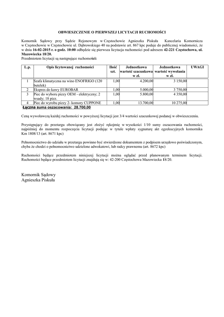OBWIESZCZENIE O PIERWSZEJ LICYTACJI RUCHOMOŚCI Komornik Sądowy przy Sądzie Rejonowym w Częstochowie Agnieszka Piskuła Kancelaria Komornicza w Częstochowie w Częstochowie ul. Dąbrowskiego 40 na podstawie art. 867 kpc podaje do publicznej wiadomości, że w dniu 16-02-2015 r. o godz. 10:00 odbędzie się pierwsza licytacja ruchomości pod adresem 42-221 Częstochowa, ul. Mazowiecka 18/20. Przedmiotem licytacji są następujące ruchomości: L.p. Opis licytowanej ruchomości 1 Szafa klimatyczna na wino ENOFRIGO (120 butelek) 2 Ekspres do kawy EUROBAR 3 Piec do wyboru pizzy OEM - elektryczny; 2 wsady; 18 pizz. 4 Piec do wyrobu pizzy 2- komory CUPPONE Łączna suma oszacowania: 28.700,00 Ilość Jednostkowa Jednostkowa szt. wartość szacunkowa wartość wywołania w zł. w zł. 1,00 4.200,00 3 150,00 1,00 1,00 5.000,00 5.800,00 3 750,00 4 350,00 1,00 13.700,00 10 275,00 UWAGI Ceną wywoławczą każdej ruchomości w powyższej licytacji jest 3/4 wartości szacunkowej podanej w obwieszczeniu. Przystępujący do przetargu obowiązany jest złożyć rękojmię w wysokości 1/10 sumy oszacowania ruchomości, najpóźniej do momentu rozpoczęcia licytacji podając w tytule wpłaty sygnaturę akt egzekucyjnych komornika Km 1808/13 (art. 8671 kpc) Pełnomocnictwo do udziału w przetargu powinno być stwierdzone dokumentem z podpisem urzędowo poświadczonym, chyba że chodzi o pełnomocnictwo udzielone adwokatowi, lub radcy prawnemu (art. 8672 kpc) Ruchomości będące przedmiotem niniejszej licytacji można oglądać przed planowanym terminem licytacji. Ruchomości będące przedmiotem licytacji znajdują się w: 42-200 Częstochowa Mazowiecka 18/20. Komornik Sądowy Agnieszka Piskuła