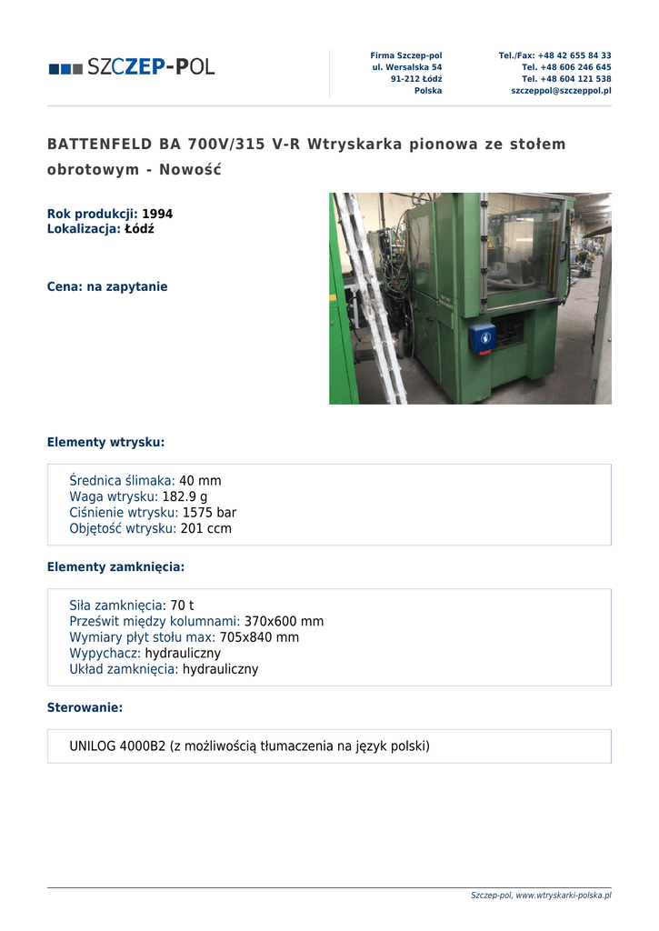 Firma Szczep-pol ul. Wersalska 54 91-212 Łódź Polska Tel./Fax: +48 42 655 84 33 Tel. +48 606 246 645 Tel. +48 604 121 538 [email protected] BATTENFELD BA 700V/315 V-R Wtryskarka pionowa ze stołem obrotowym - Nowość Rok produkcji: 1994 Lokalizacja: Łódź Cena: na zapytanie Elementy wtrysku: Średnica ślimaka: 40 mm Waga wtrysku: 182.9 g Ciśnienie wtrysku: 1575 bar Objętość wtrysku: 201 ccm Elementy zamknięcia: Siła zamknięcia: 70 t Prześwit między kolumnami: 370x600 mm Wymiary płyt stołu max: 705x840 mm Wypychacz: hydrauliczny Układ zamknięcia: hydrauliczny Sterowanie: UNILOG 4000B2 (z możliwością tłumaczenia na język polski) Szczep-pol, www.wtryskarki-polska.pl Wyposażenie dodatkowe: LWtryskarka pionowa ze stołem obrotowym Średnica stołu obrotowego fi 1020 mm Euromap Interface robota Ciąg rdzeni hydraulicznych Sterowanie 4 zaworami powietrznymi Ruchy równoległe Wymiary: Waga: 5500 kg Długość/Szerokość/Wysokość: 3.69x1.35x3.97 m Zasilanie: Pompa/Silnik: 15 kW Grzałki: 8.98 kW Całkowite: 23.98 kW Szczep-pol, www.wtryskarki-polska.pl Szczep-pol, www.wtryskarki-polska.pl